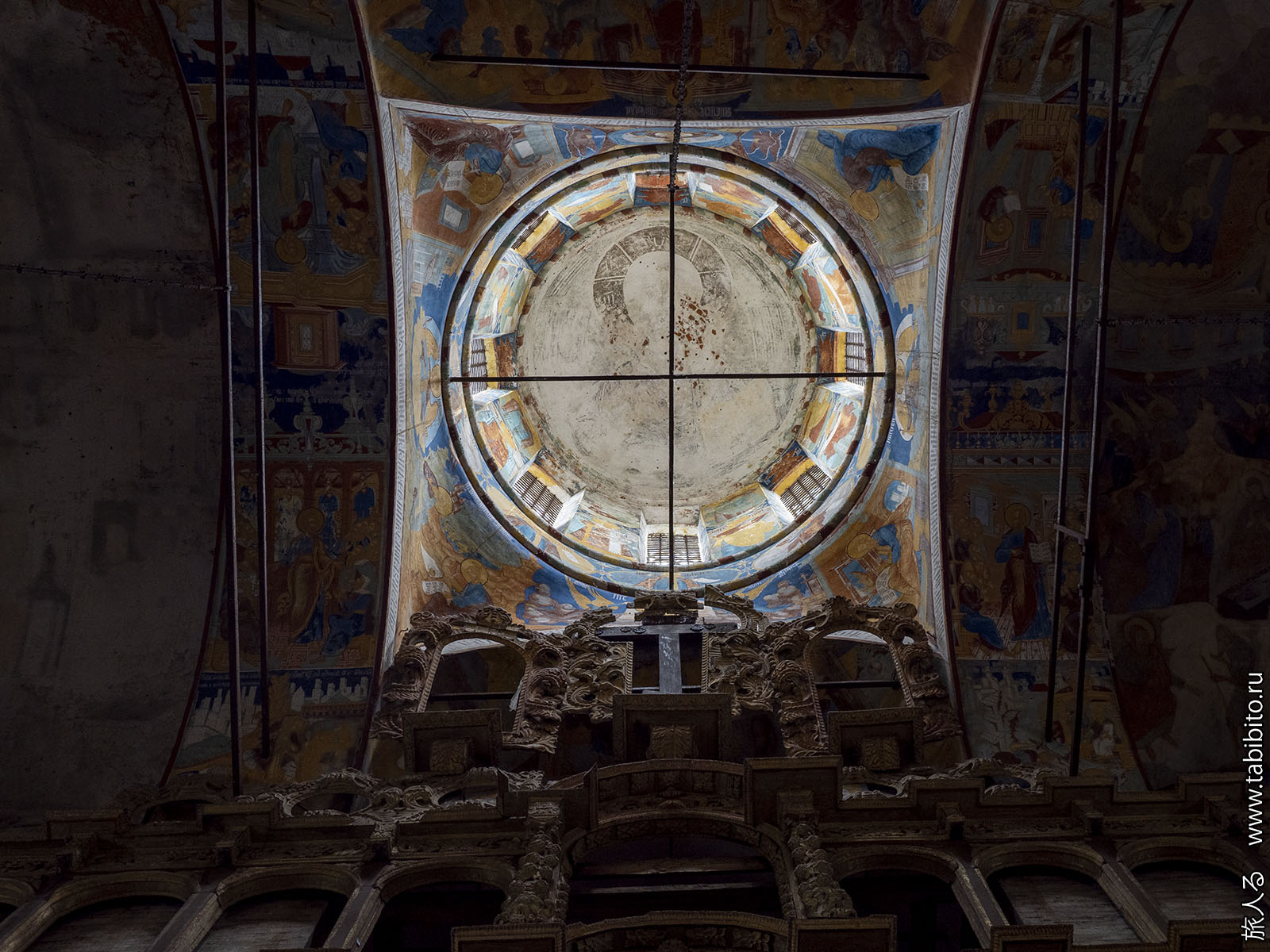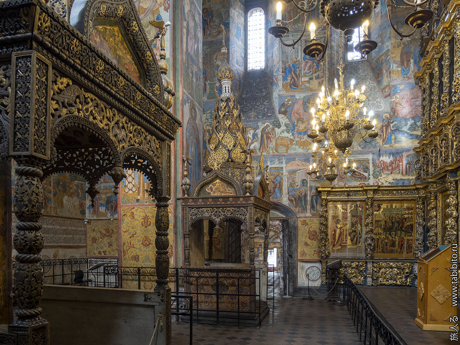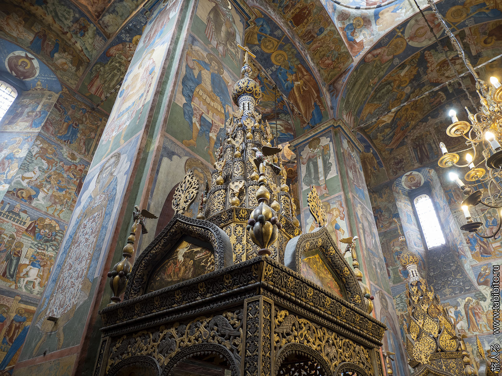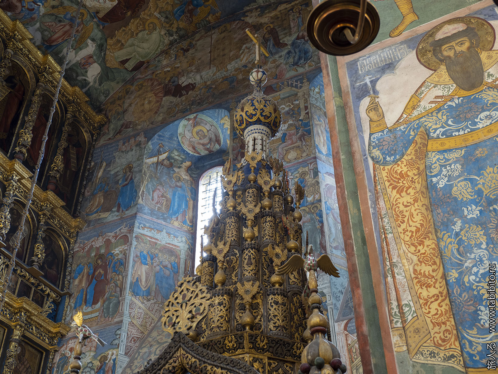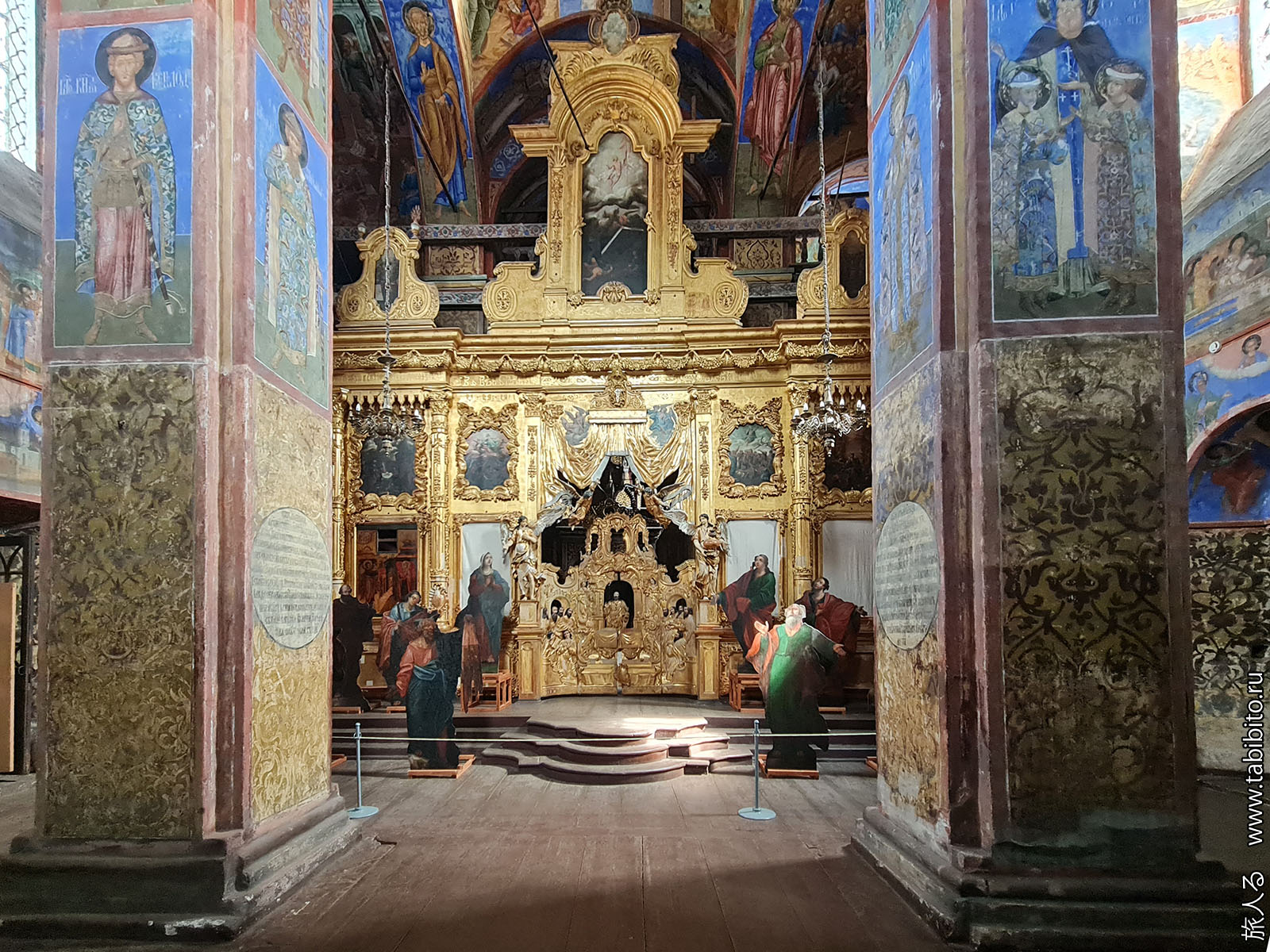 Первое, что бросается в глаза — царское и патриаршье места с балдахинами. Они были перенесены сюда из другого ярославского храма, Николо-Мокринского.