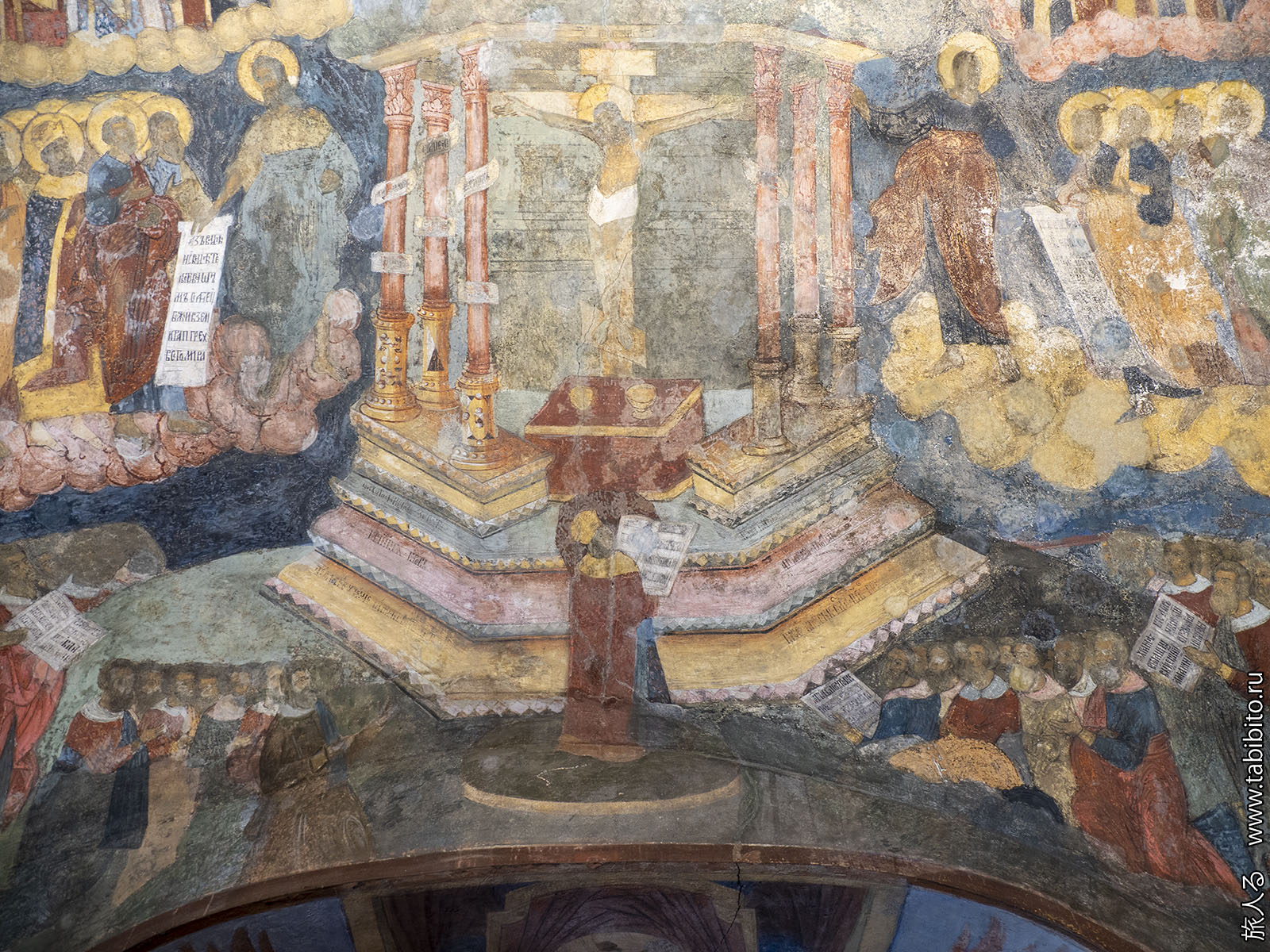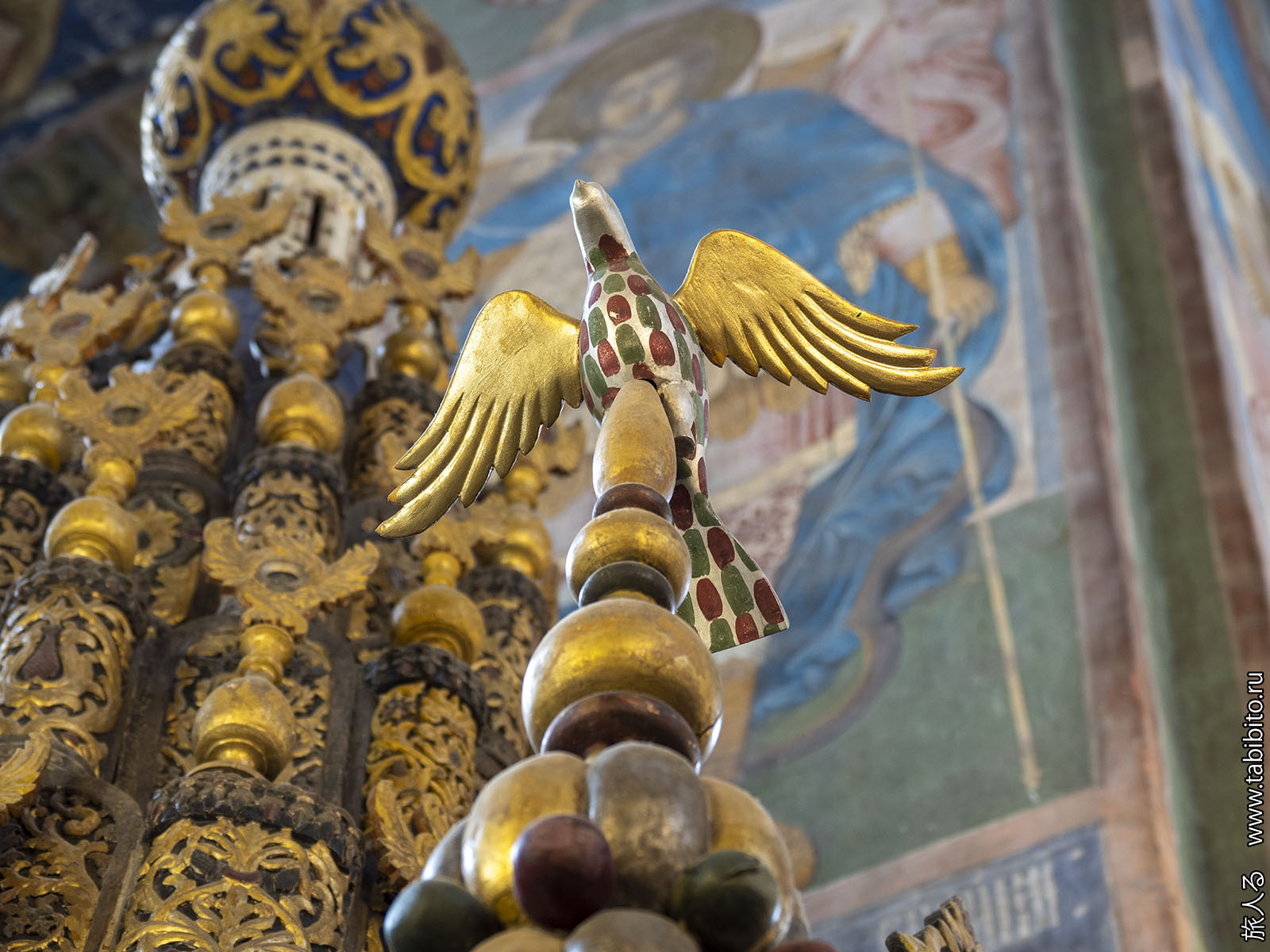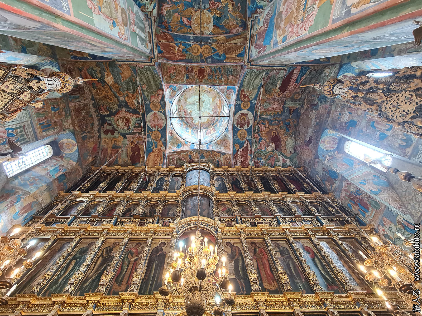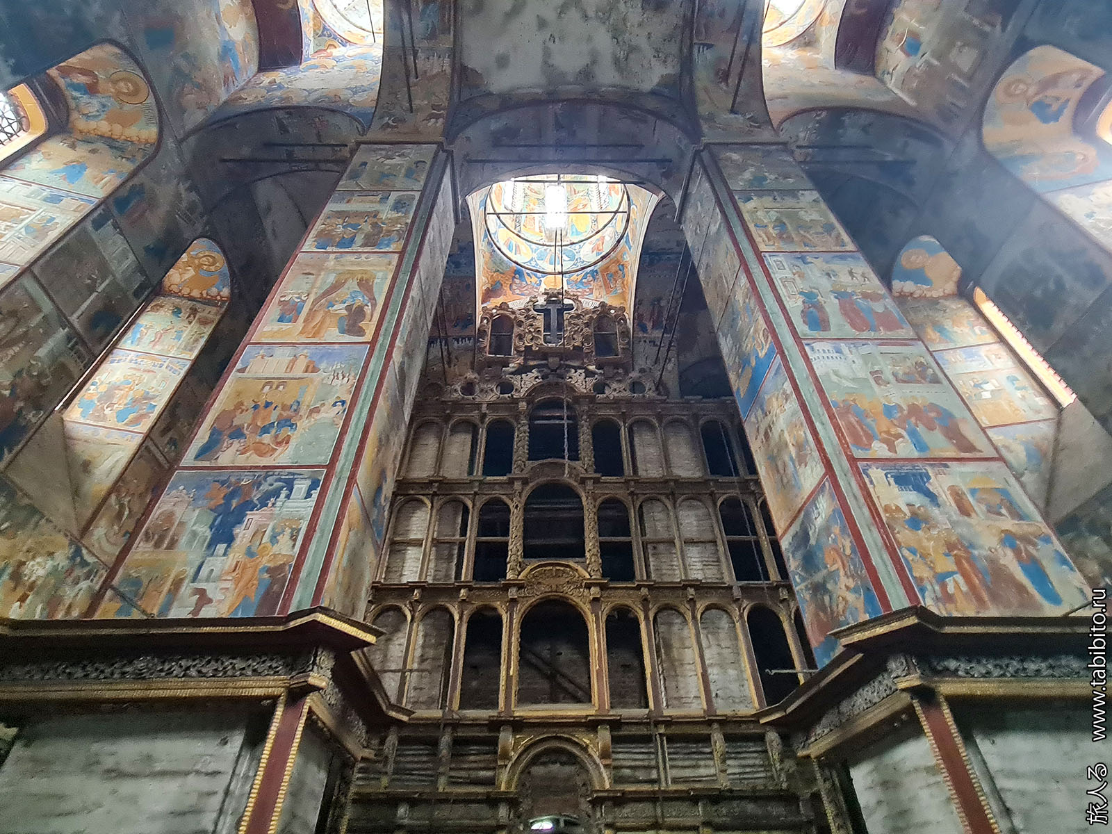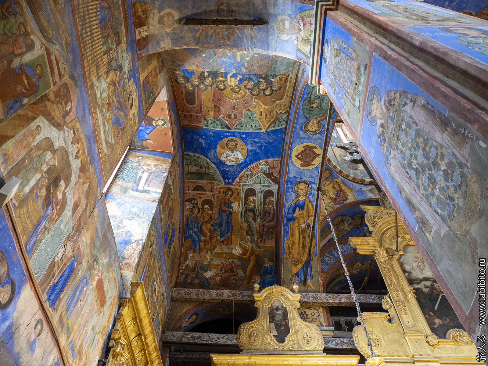 Первое, что бросается в глаза — царское и патриаршье места с балдахинами. Они были перенесены сюда из другого ярославского храма, Николо-Мокринского.