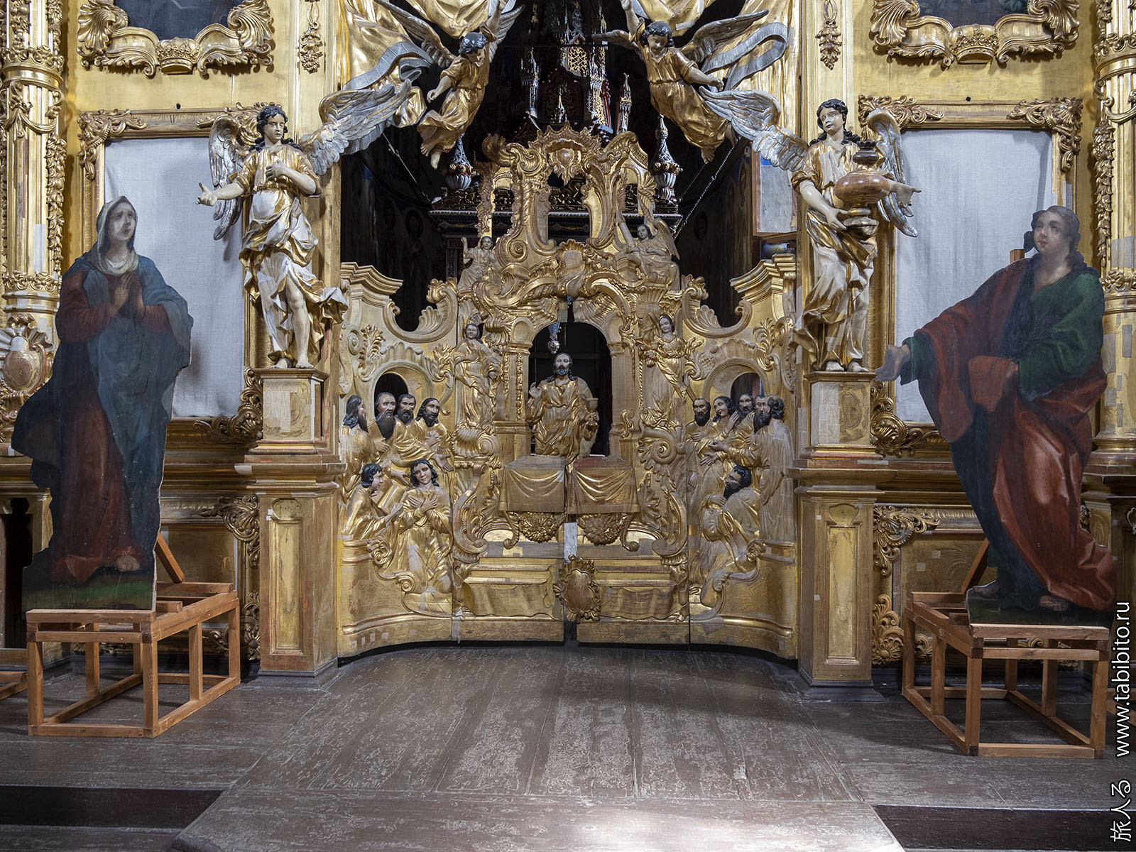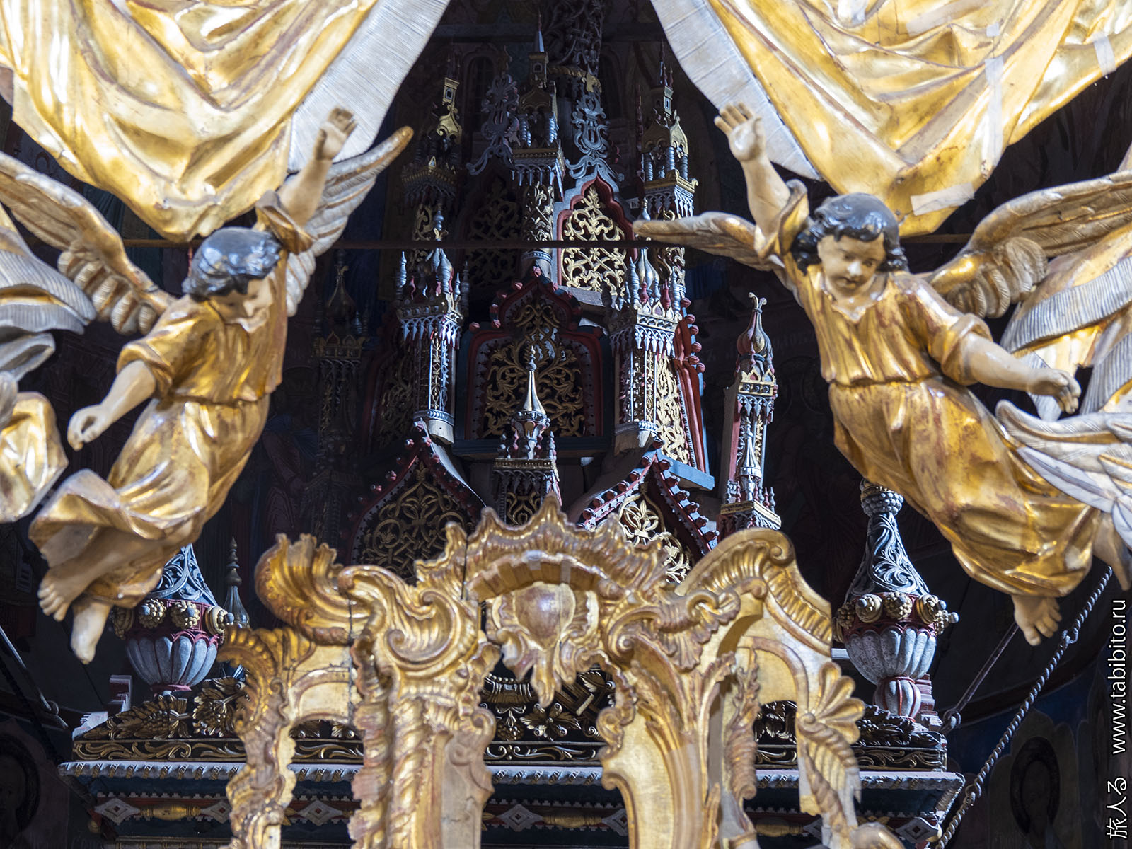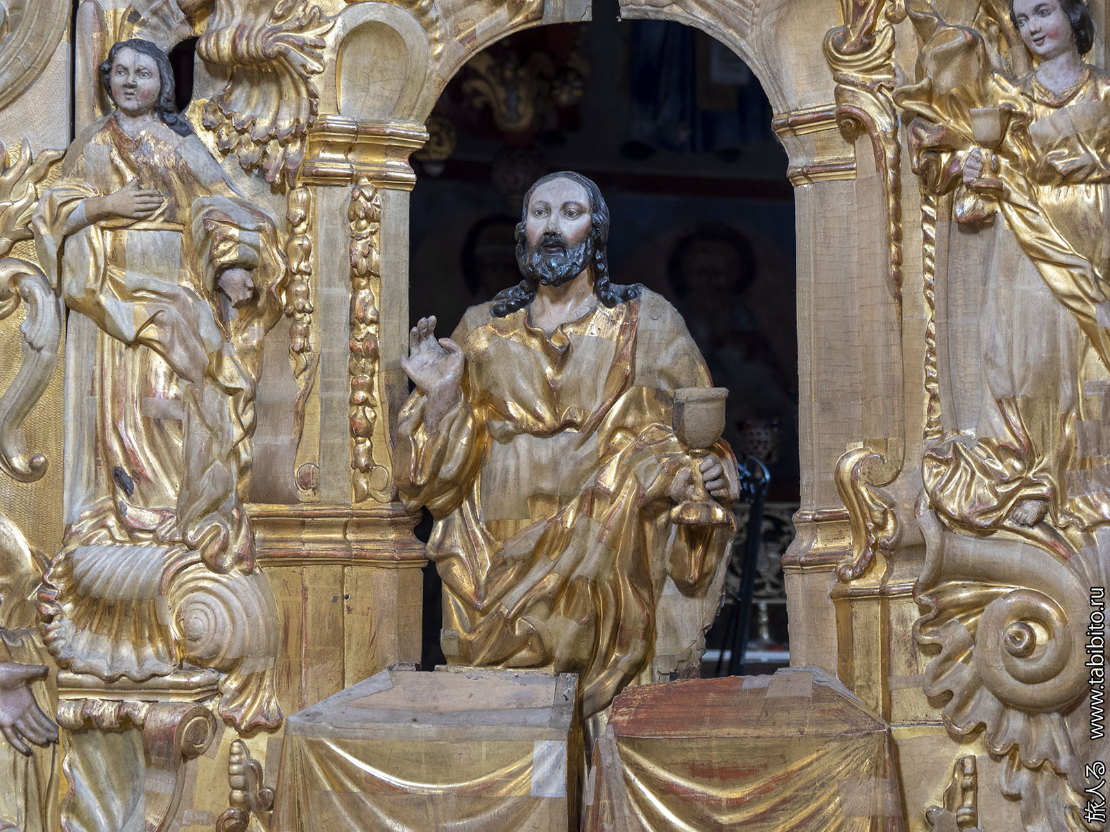 Внутри есть золоченый барочный иконостас (1751) со скульптурами.