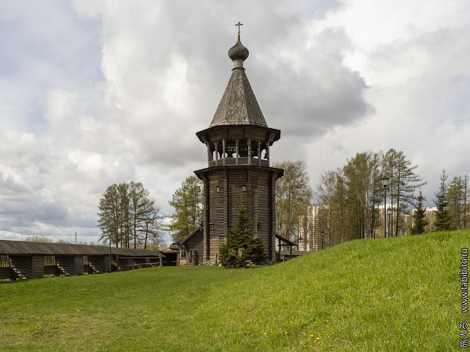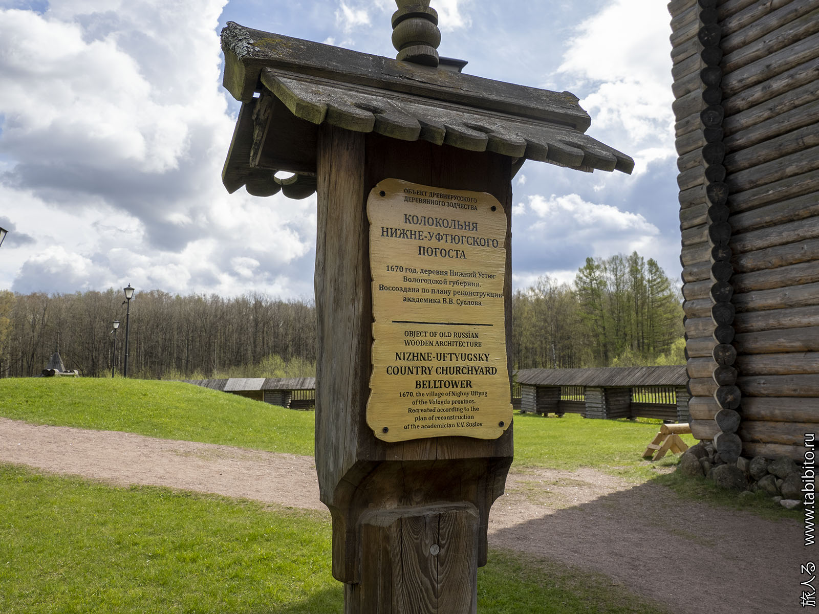 Деревянная колокольня — из Нижне-Уфтюгского погоста в Архангельской области. Построена она была в 1670 году и была снесена еще до революции из-за ветхости. Незадолго до сноса ее хорошо обмерил академик Владимир Суслов.