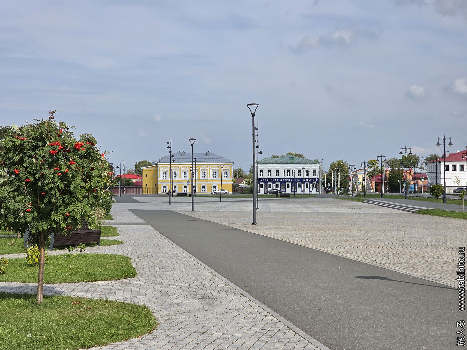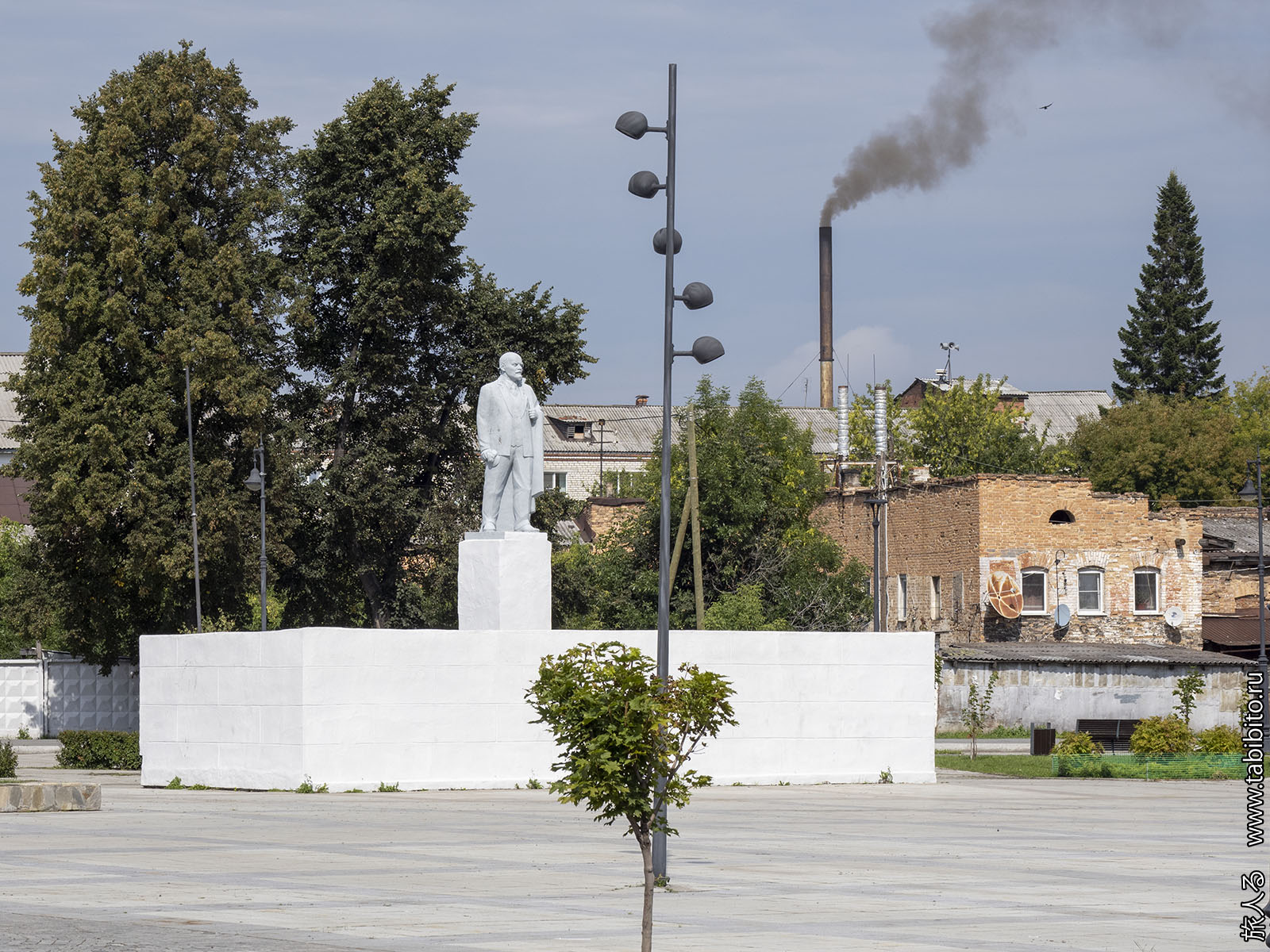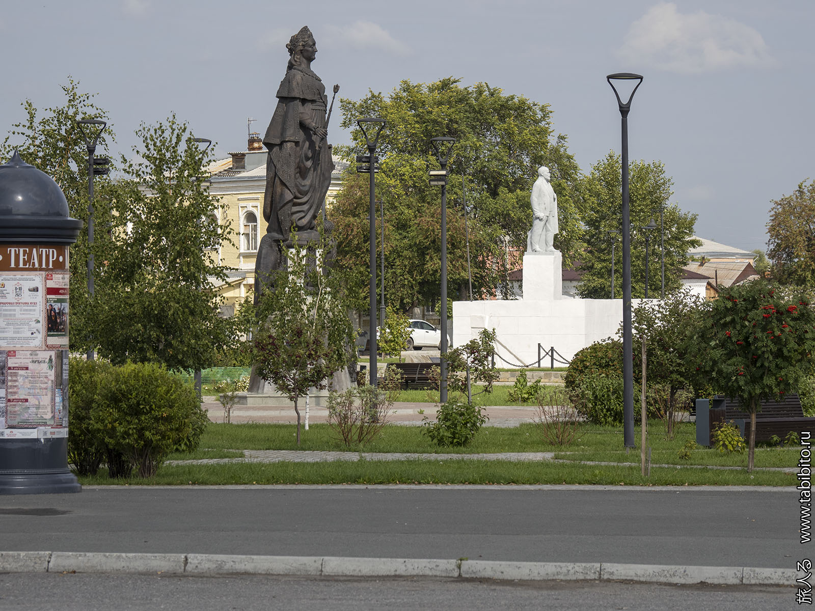 На бывшей торговой площади памятники Екатерине II и Ильичу.