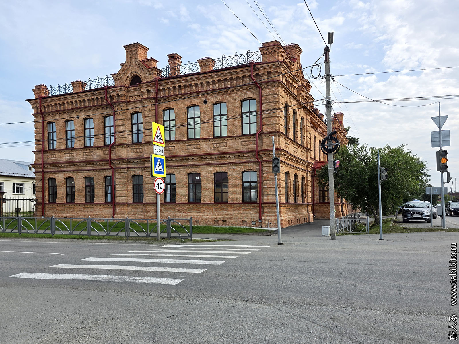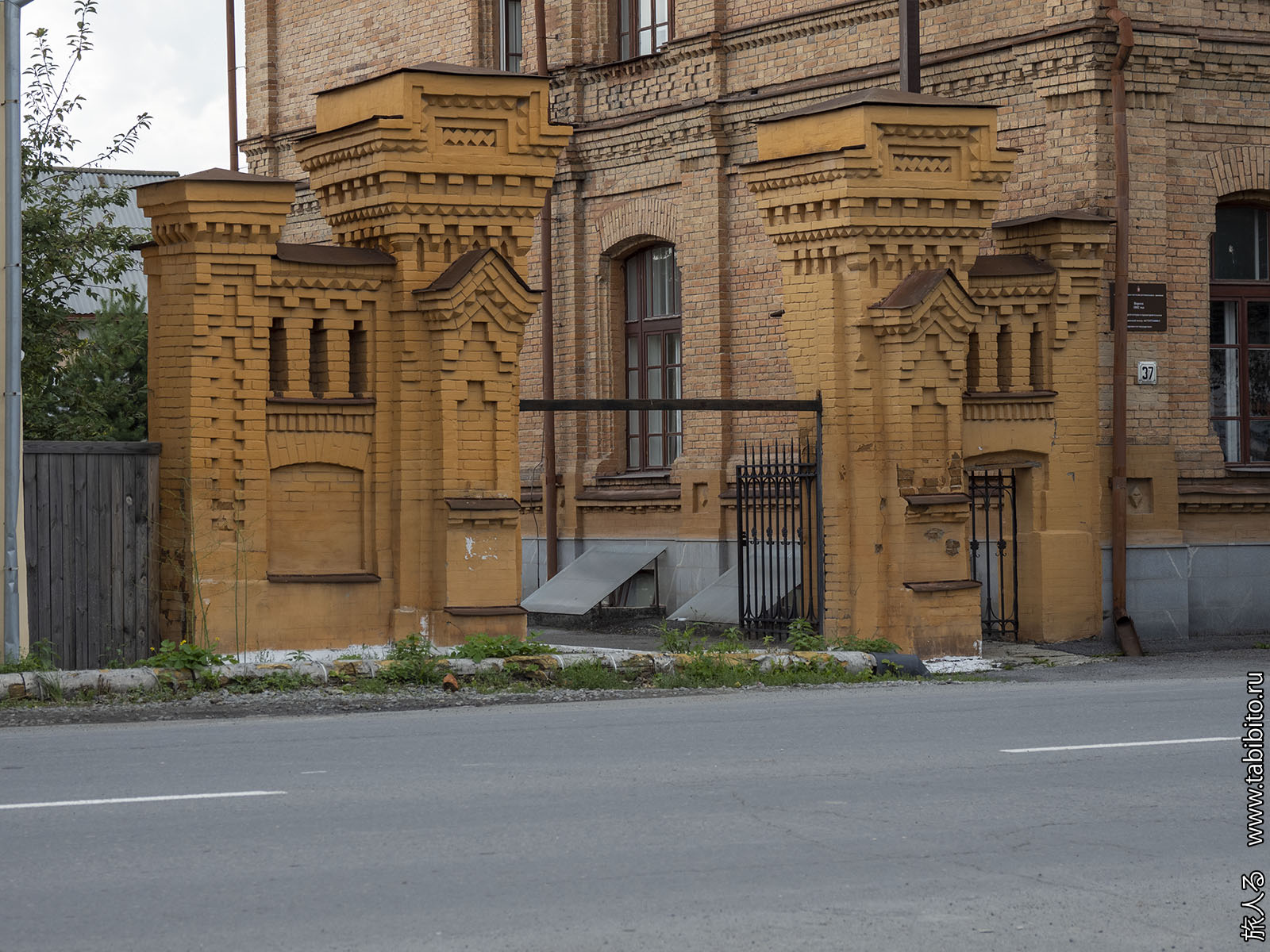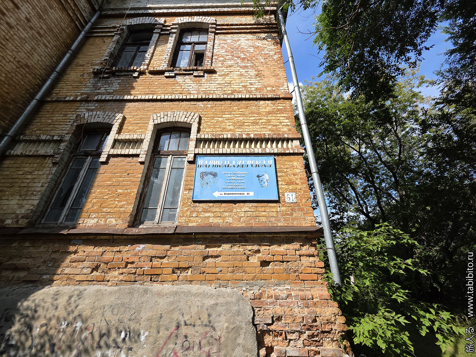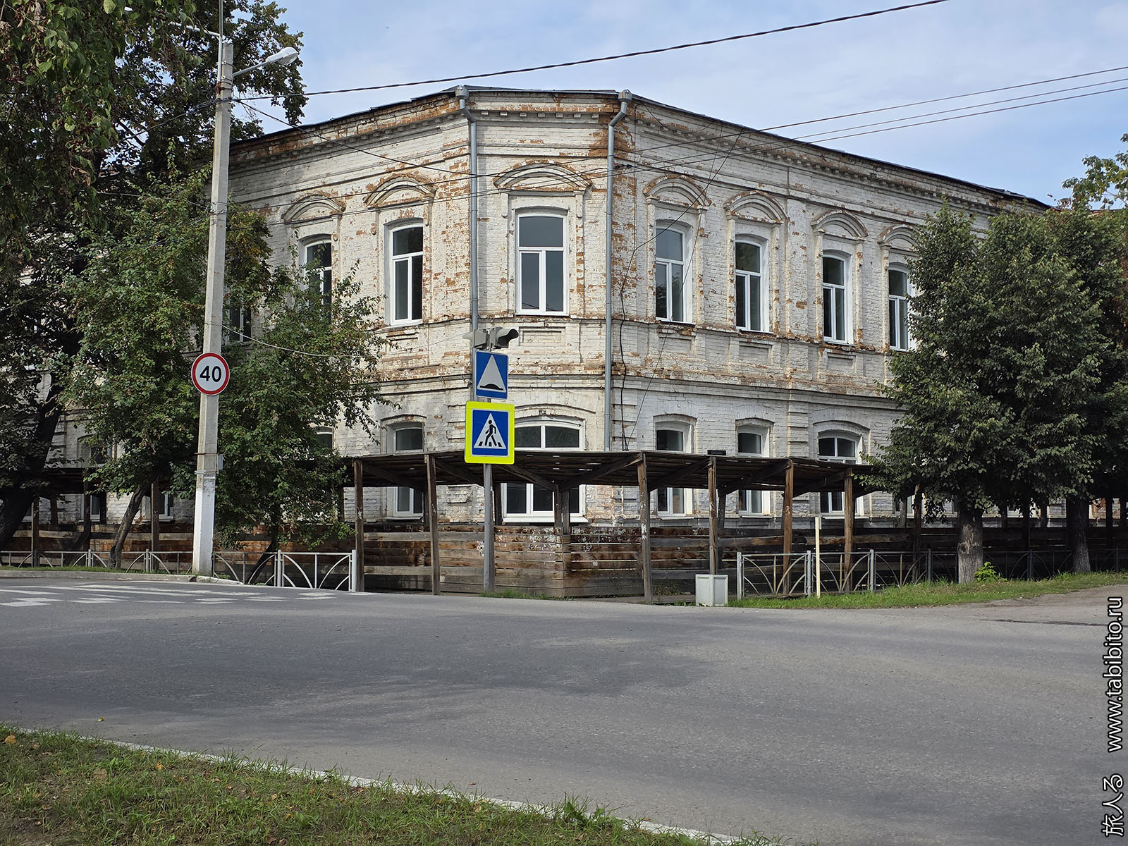 Здание бывшей женской гимназии (1882) на той же улице с симпатичными воротами.