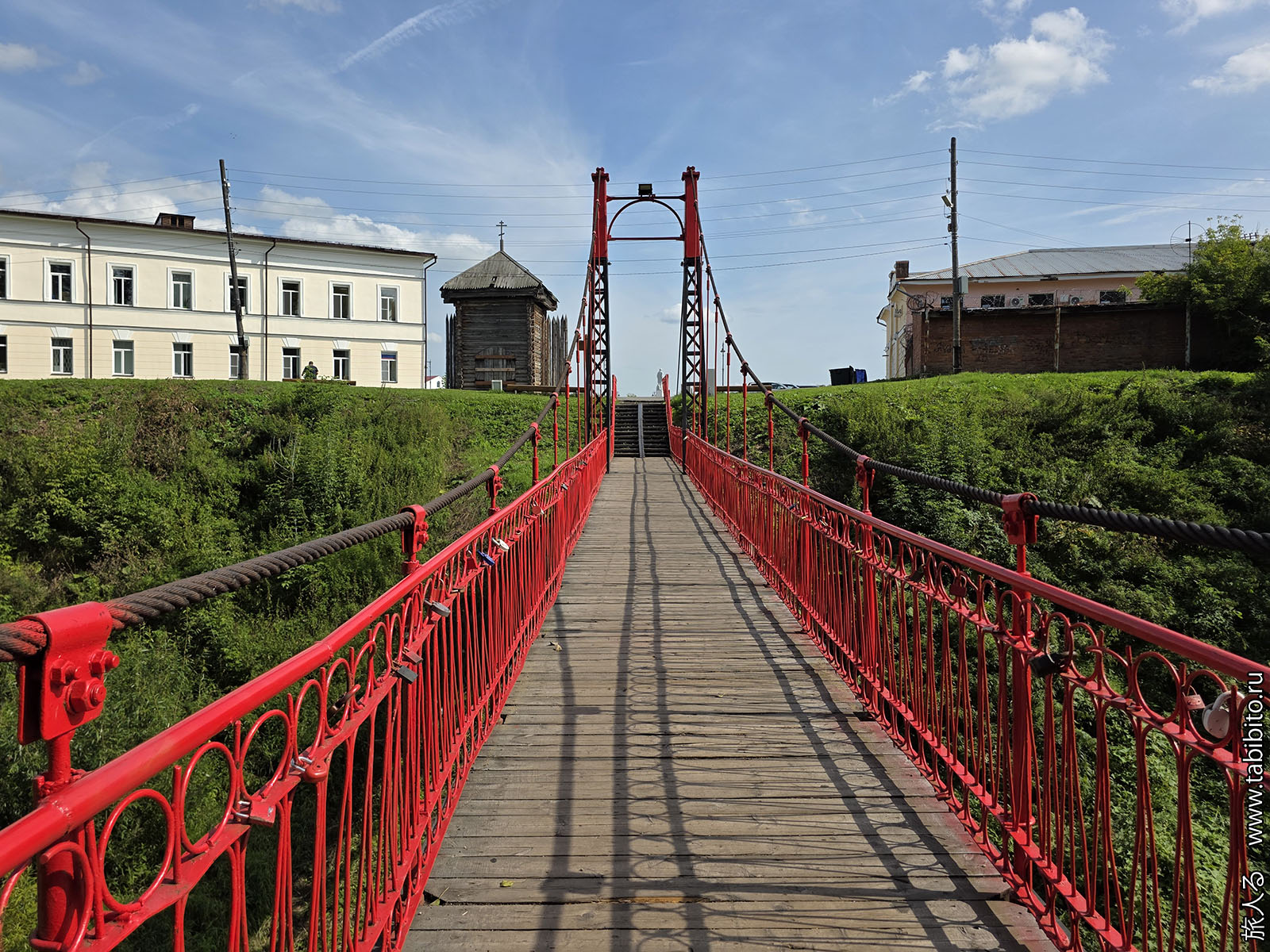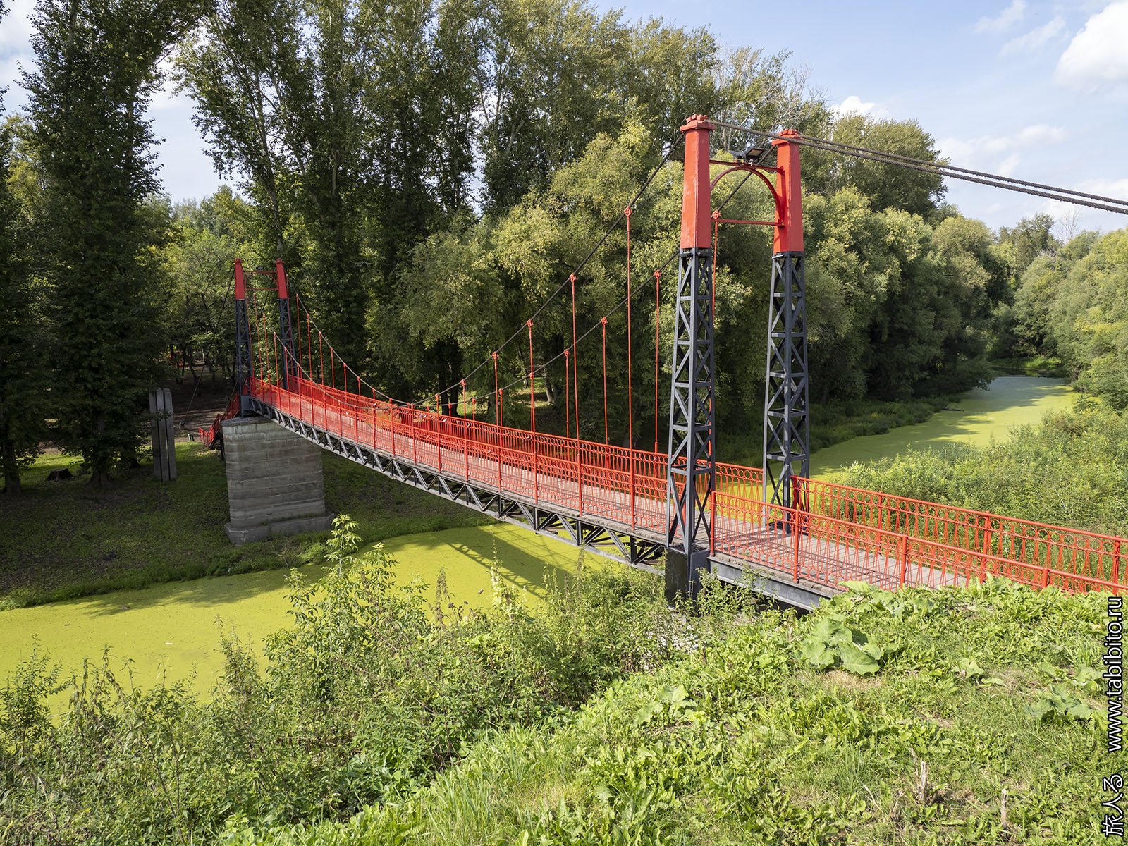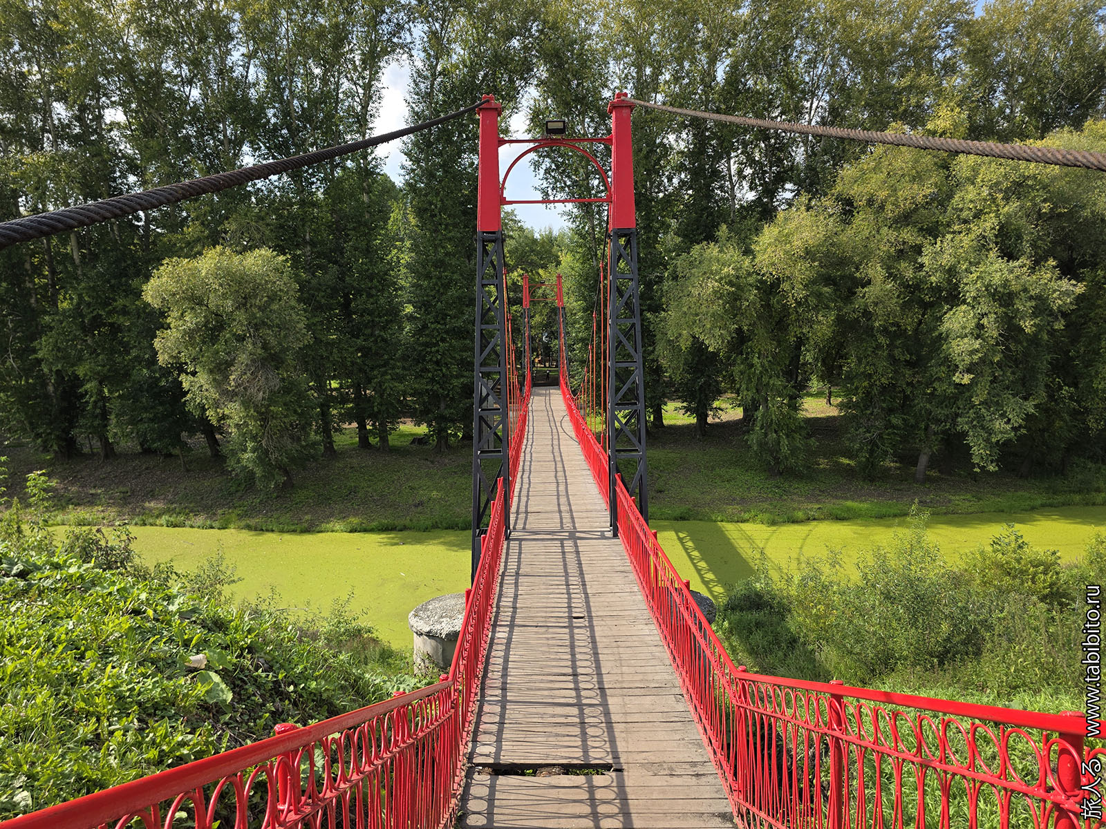 Симпатичный подвесной мост в парк на острове, образованном рукавом реки Ирбит.