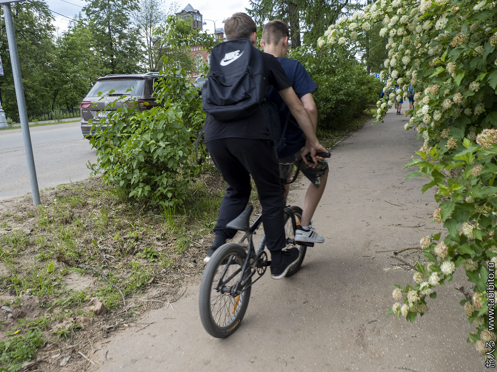 Поскольку прокатных самокатов нет, своих парней приходится возить на велосипеде