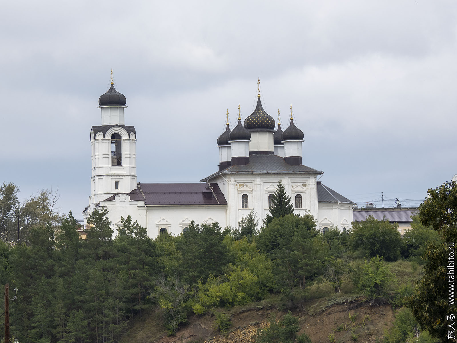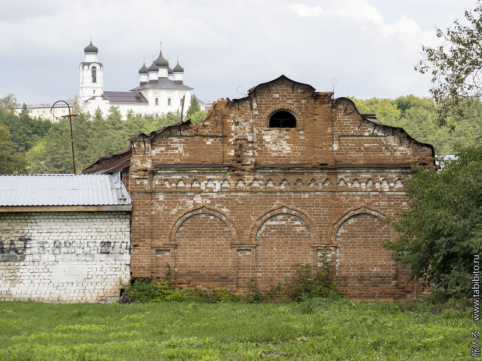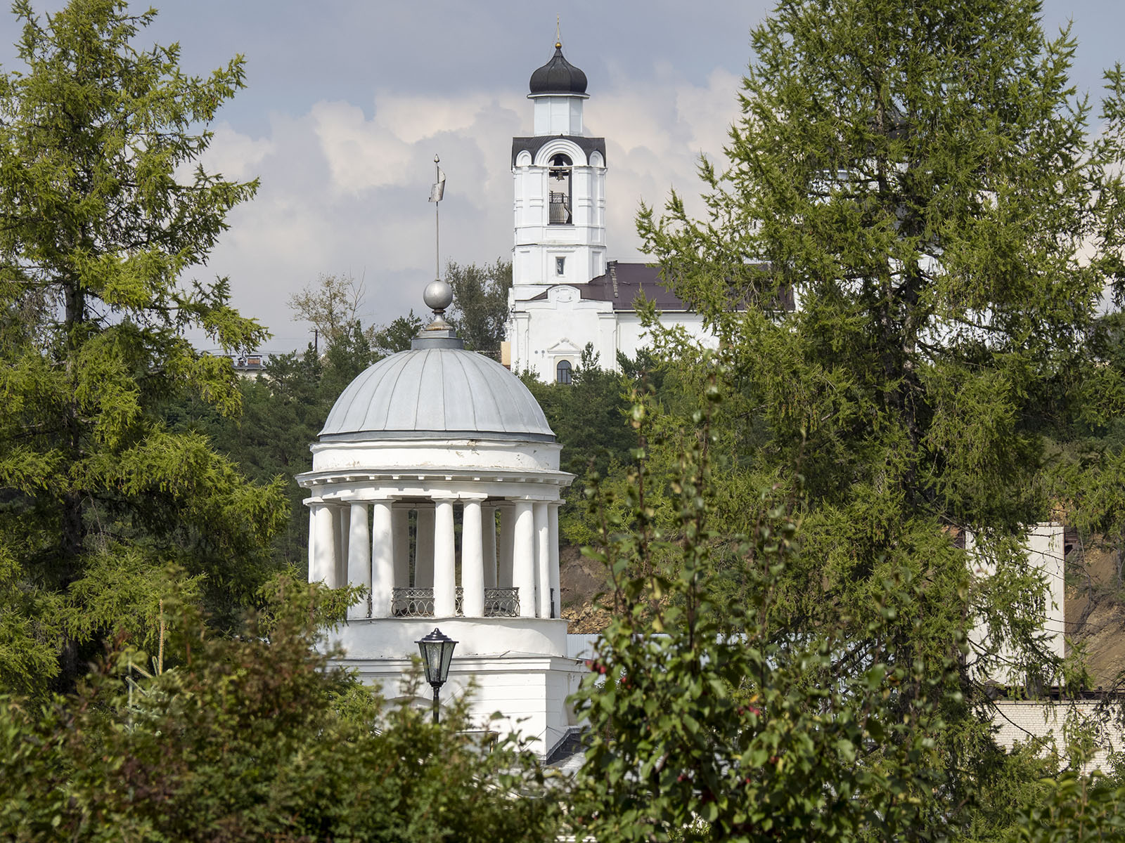 Из центра на горе виден храм Спасо-Преображенского монастыря (1861). Верхние ярусы колокольни и главки восстановлены, но в целом соответствуют тому, что было раньше.