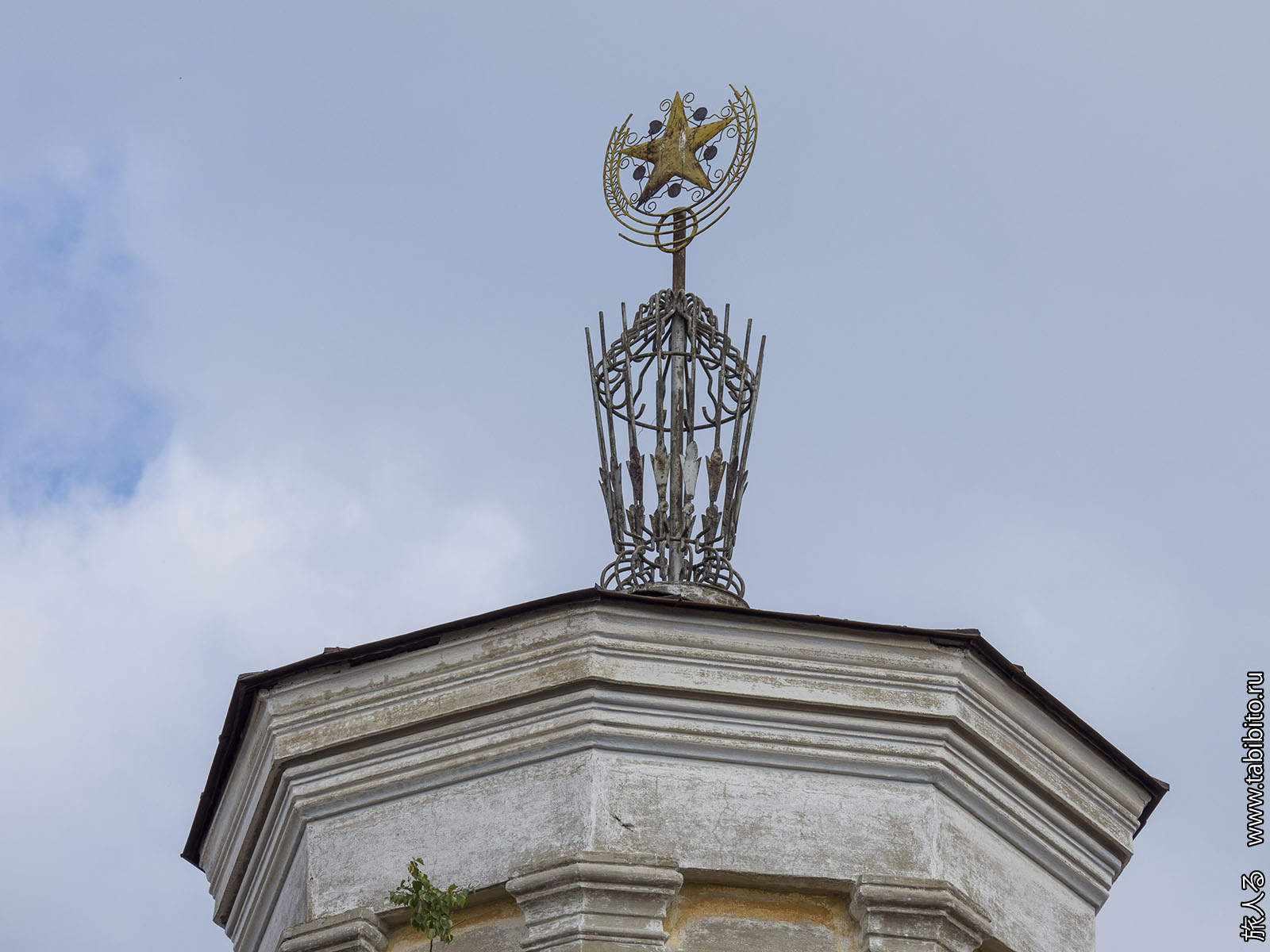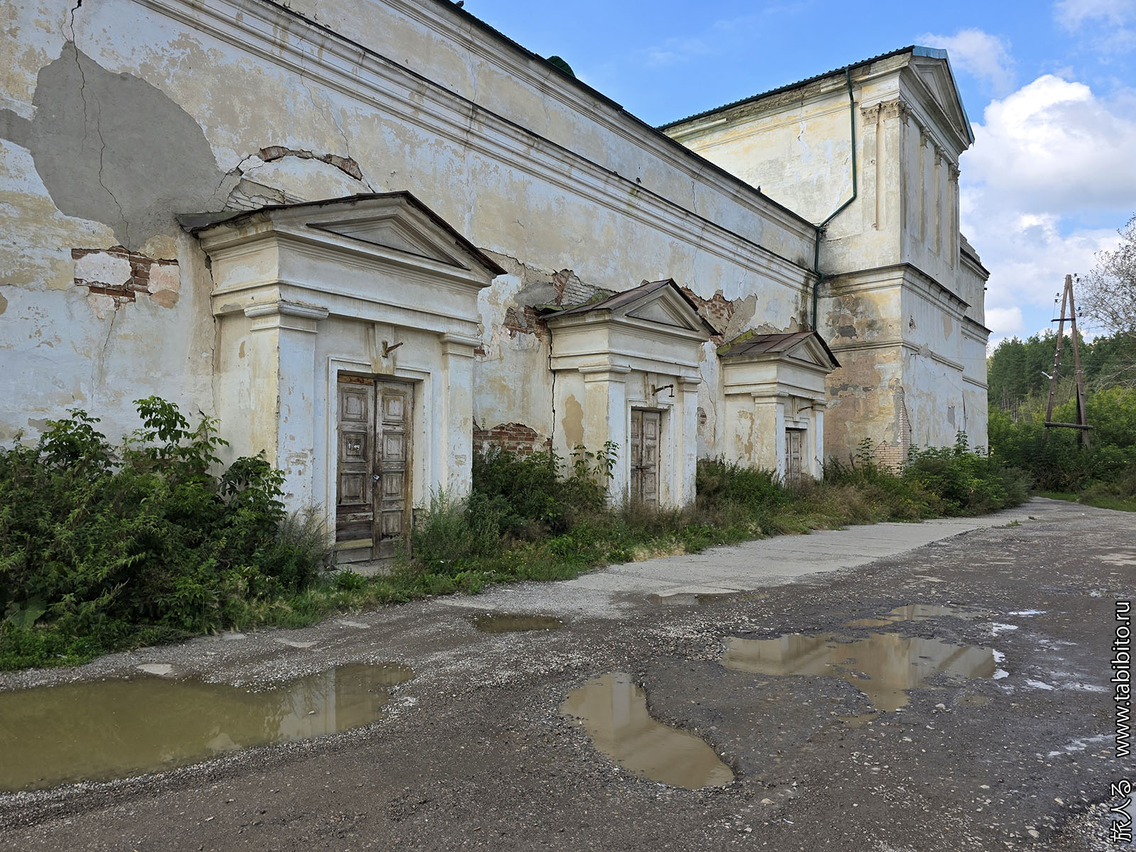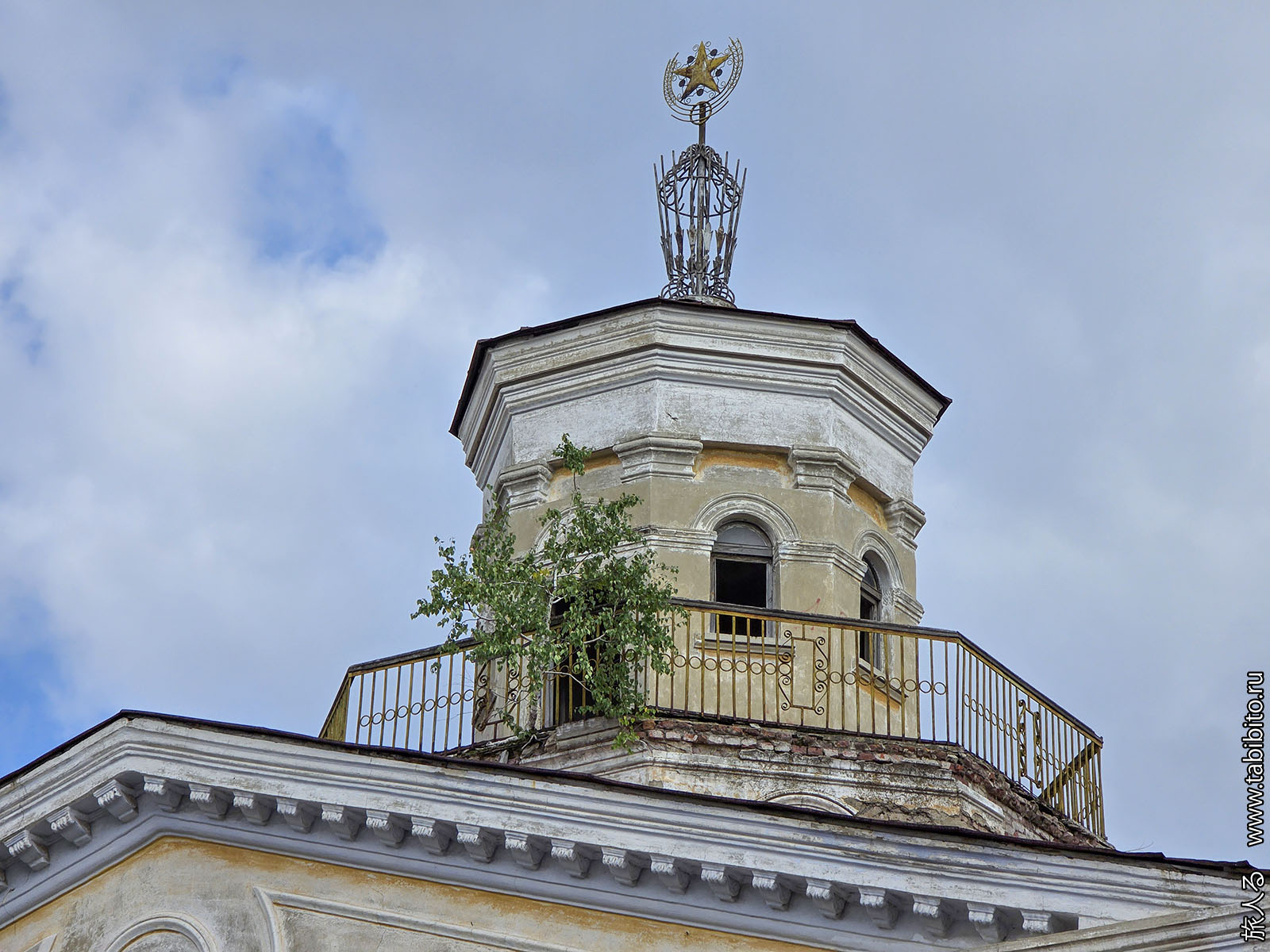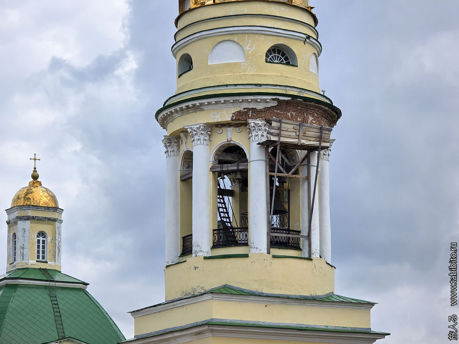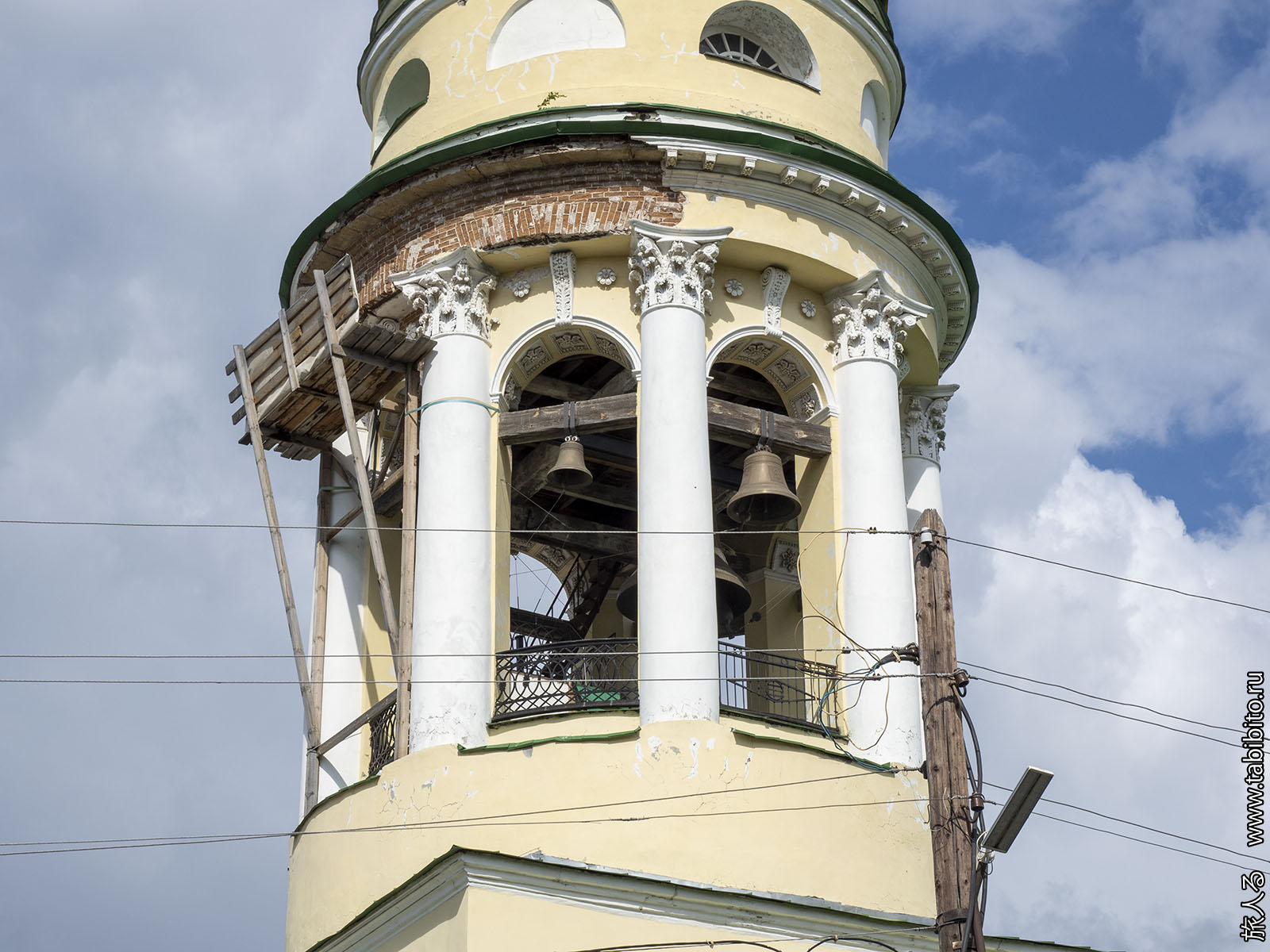 В советское время колокольню использовали как парашютную вышку. Видимо, сейчас происходит некоторый обвал кирпичей в тех местах, где крепились приспособления для прыжков.