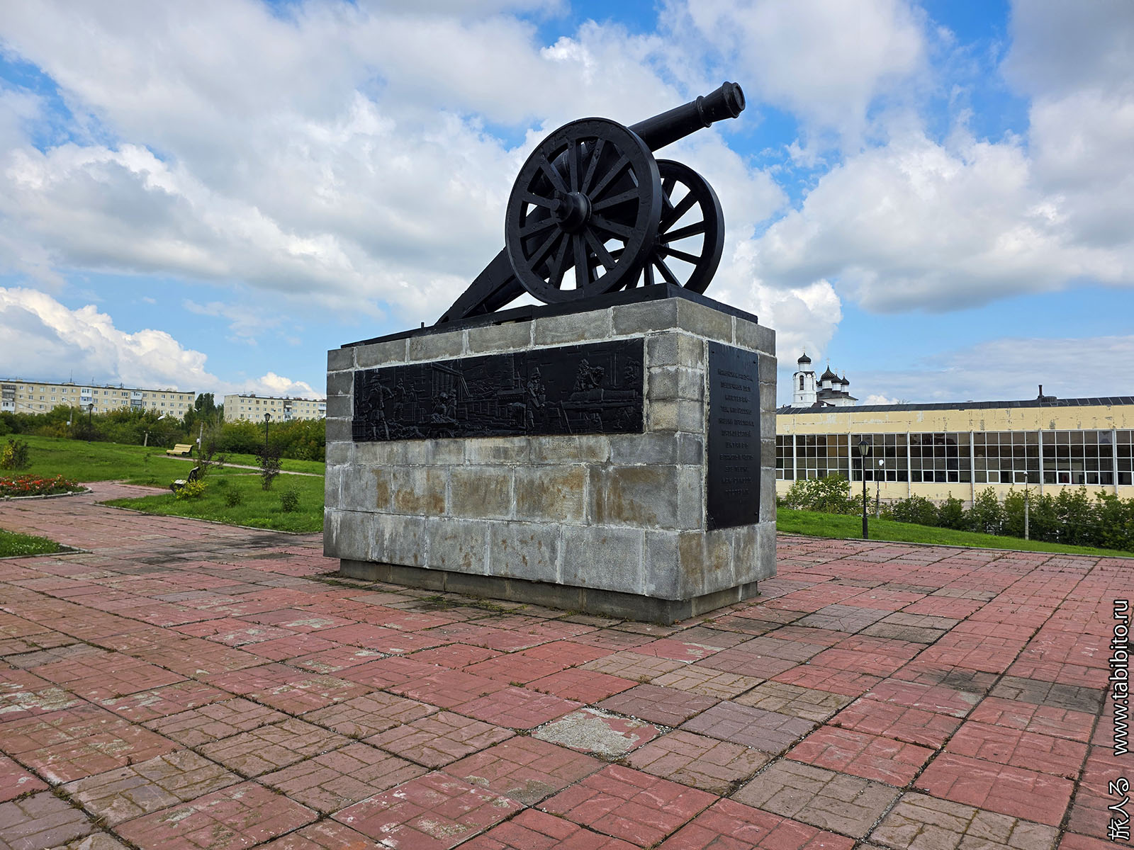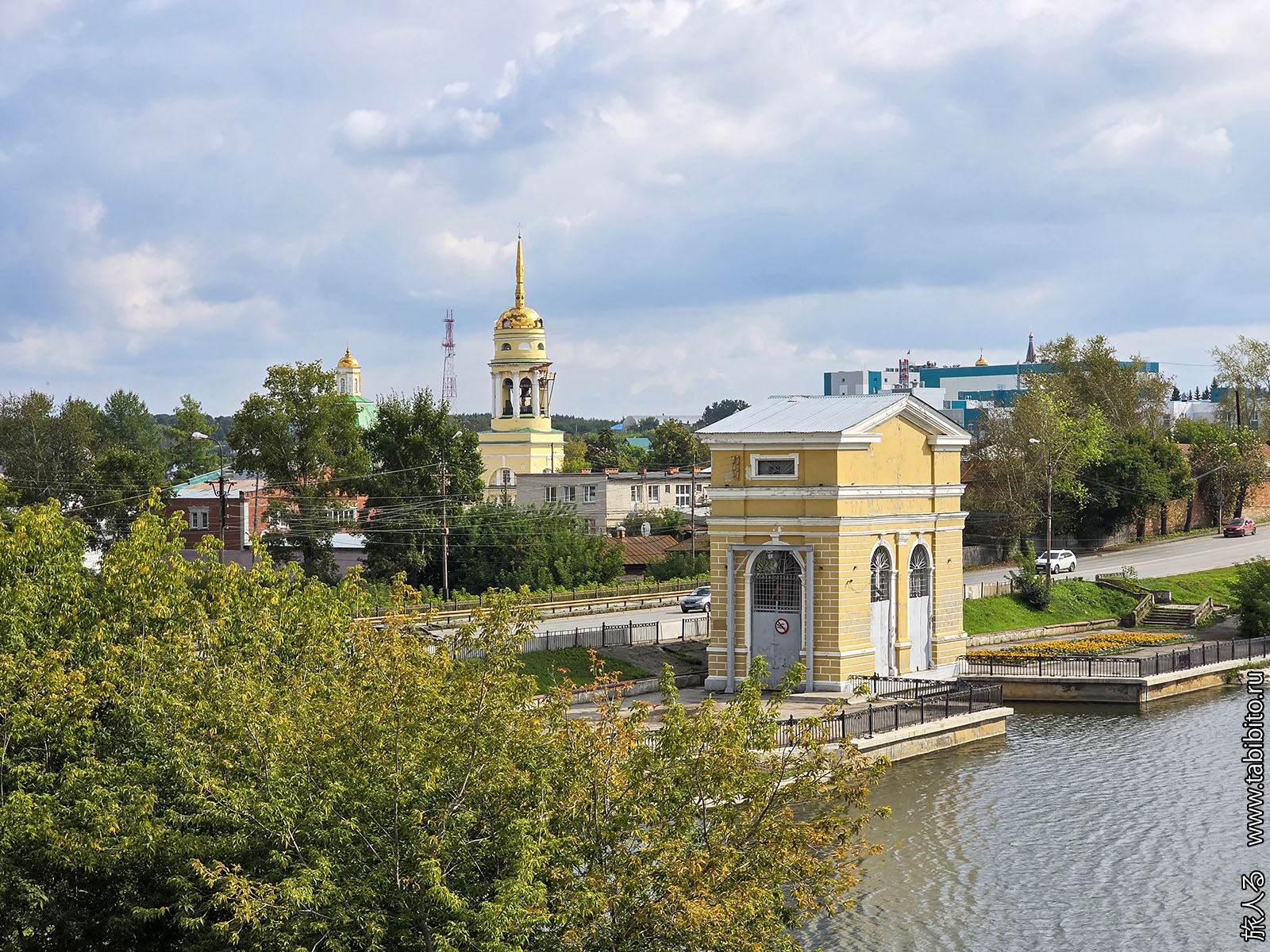 Вид на старый город и дамбу заводского пруда от холма с памятником пушке.