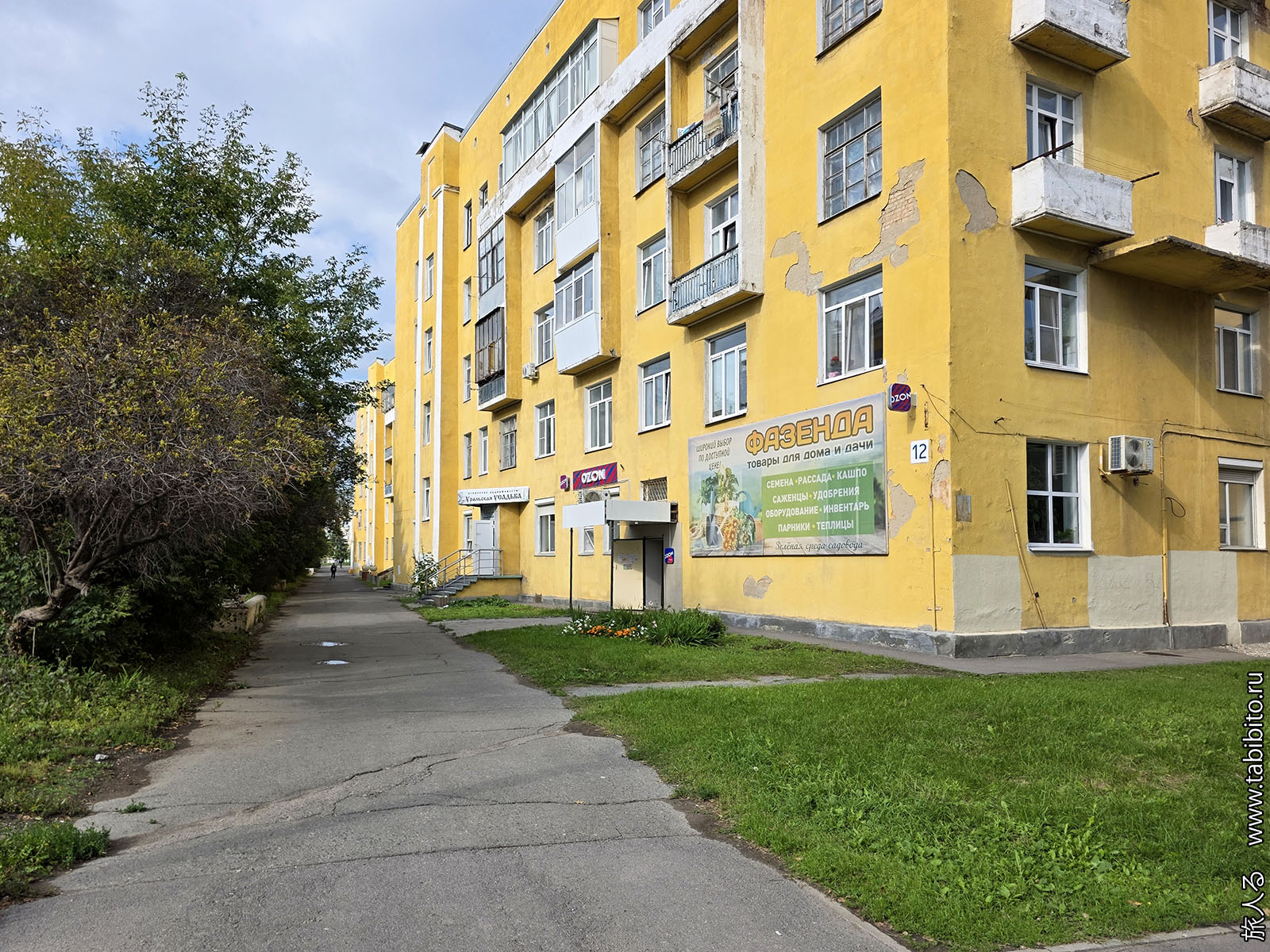 В районе вокзала (Каменск-Уральский — важная станция на Транссибе) можно посмотреть на заброшенный ДК железнодорожников (1954). Фасад закрывает маленький рыночек.