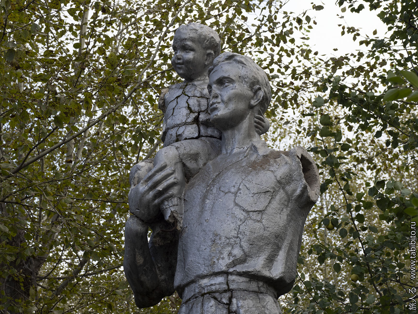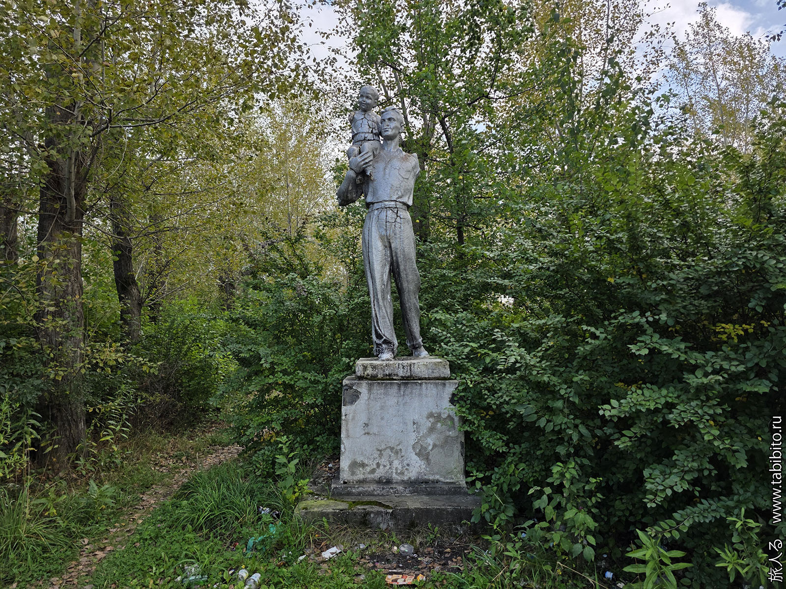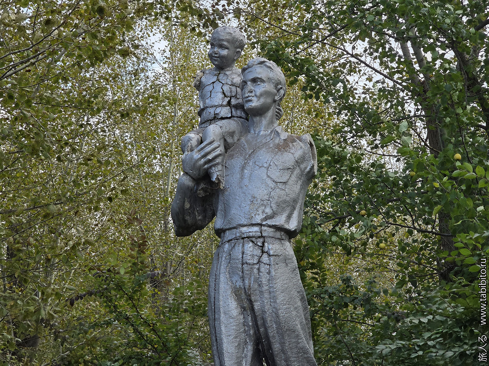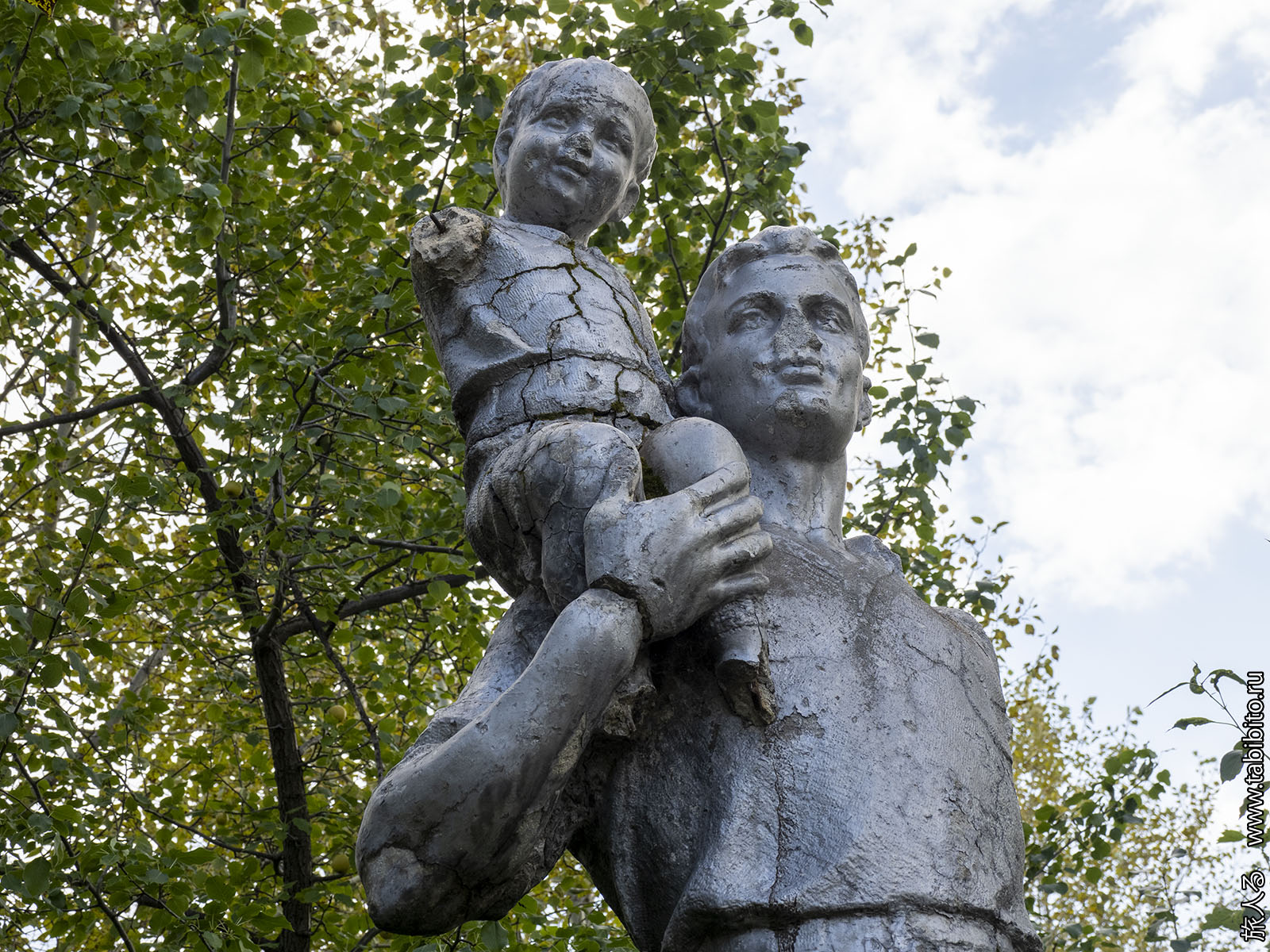 В одном из его углов скульптура «Папа-рабочий с сыном».