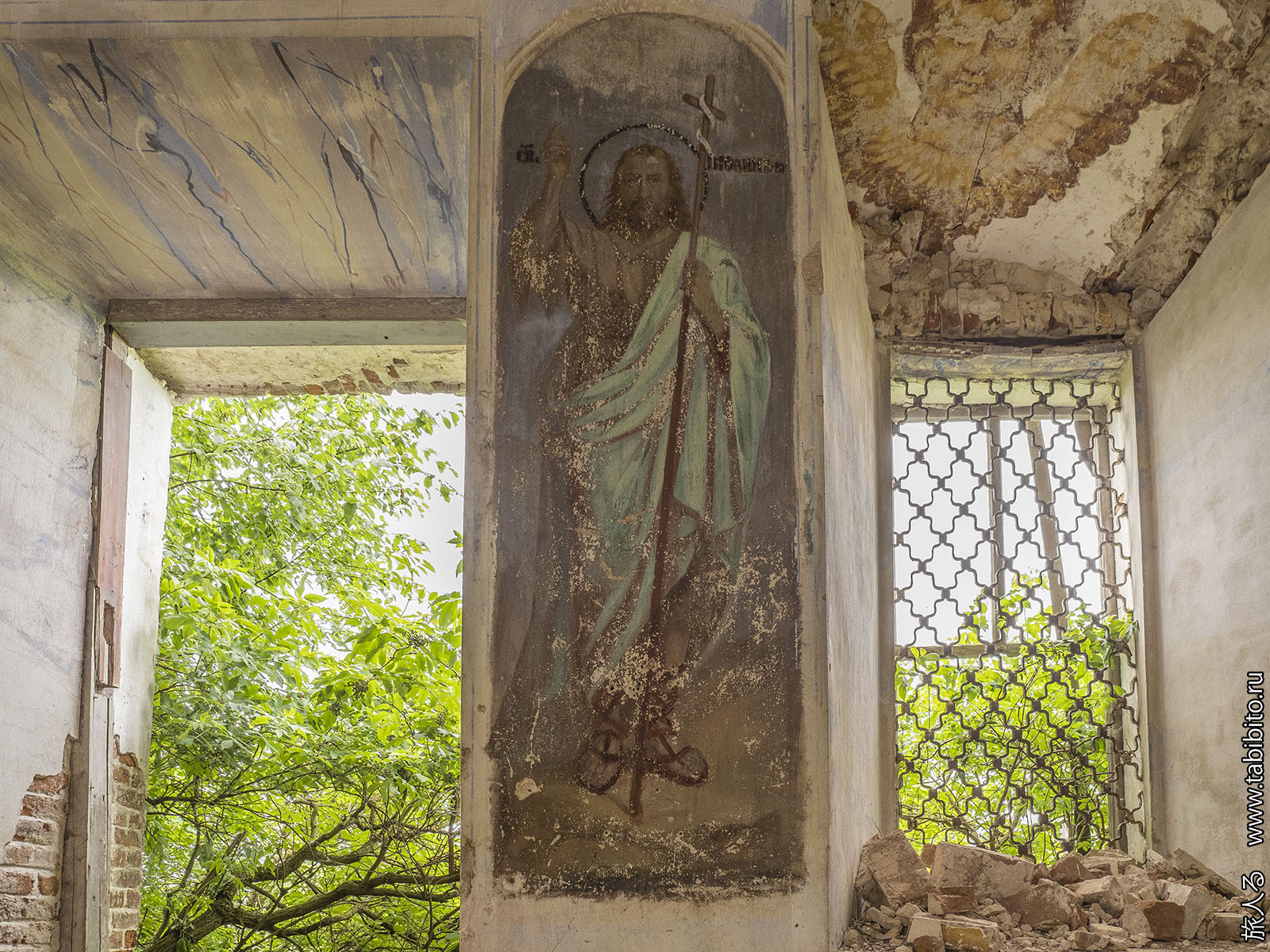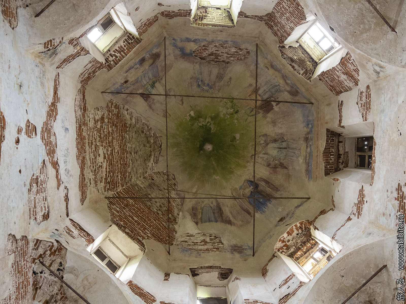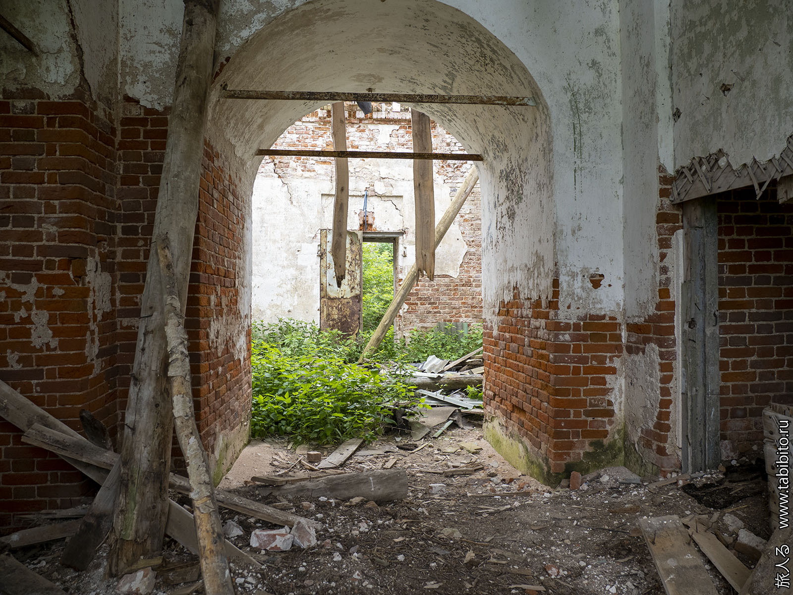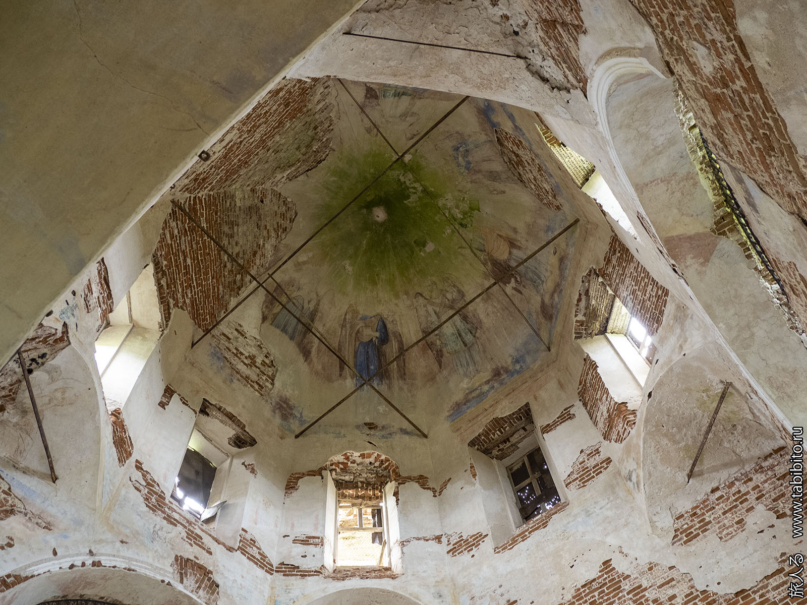 Колокольня снесена, остался только нижний ярус. В трапезную тоже лучше не соваться — крыша обрушилась несколько лет назад, можно ноги переломать.