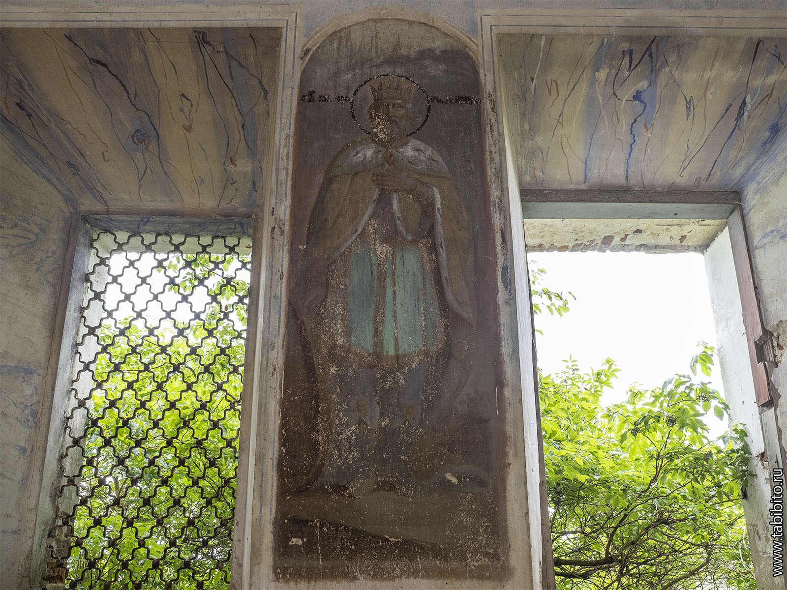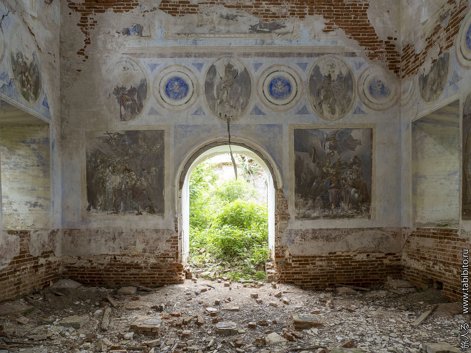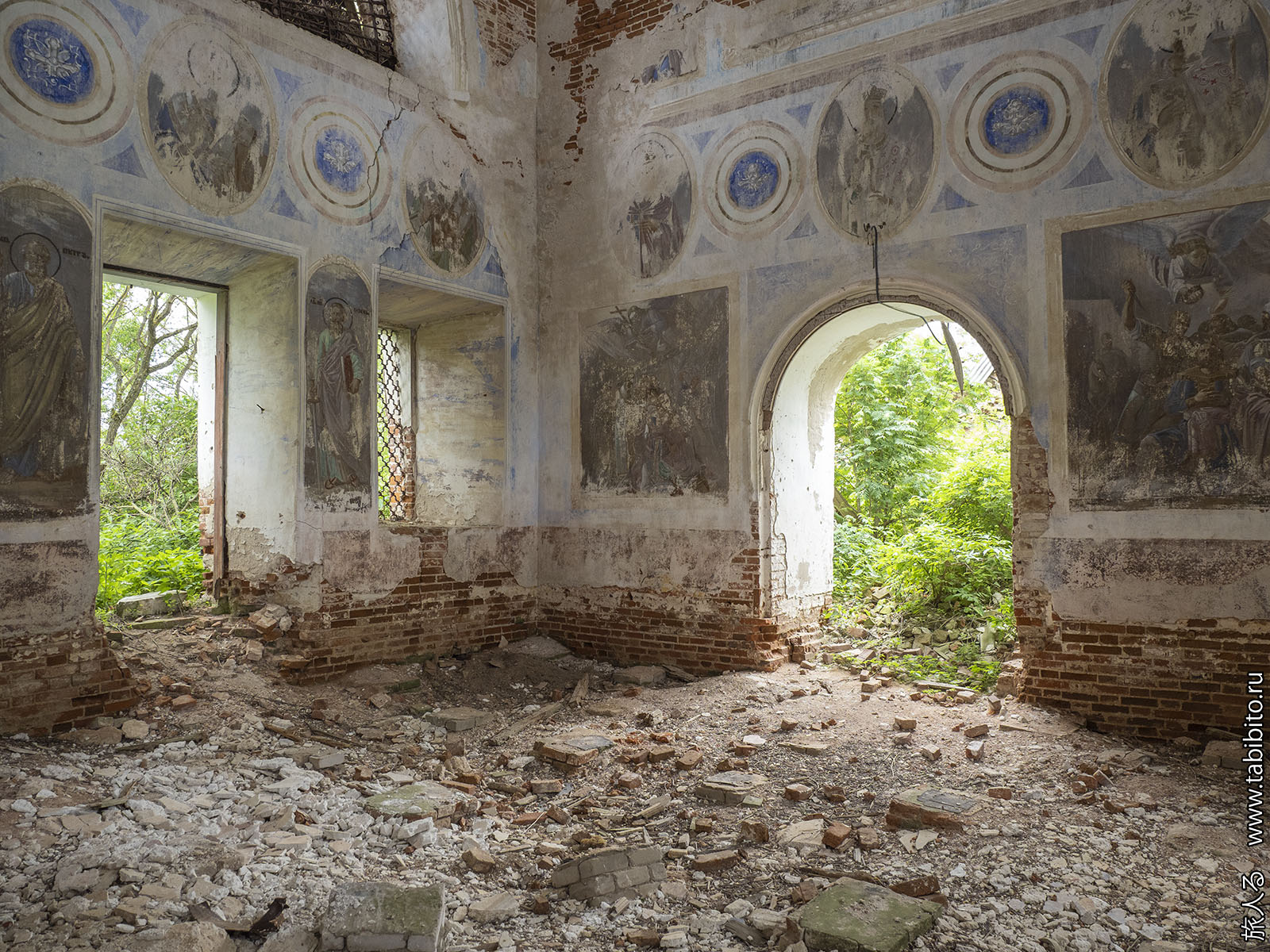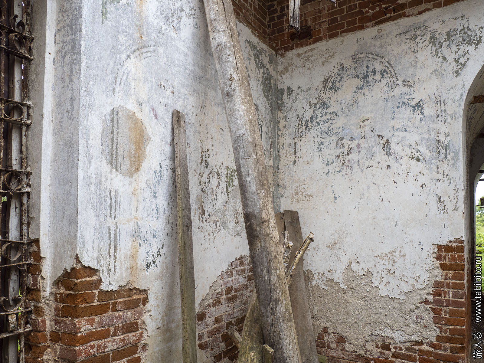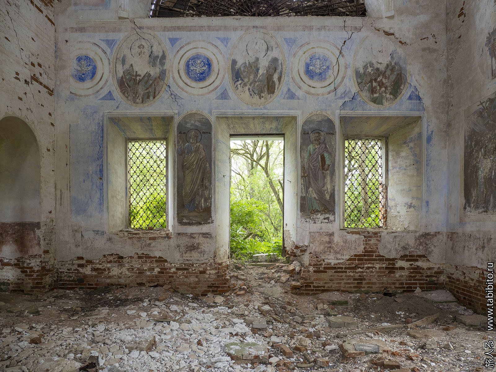 Колокольня снесена, остался только нижний ярус. В трапезную тоже лучше не соваться — крыша обрушилась несколько лет назад, можно ноги переломать.
