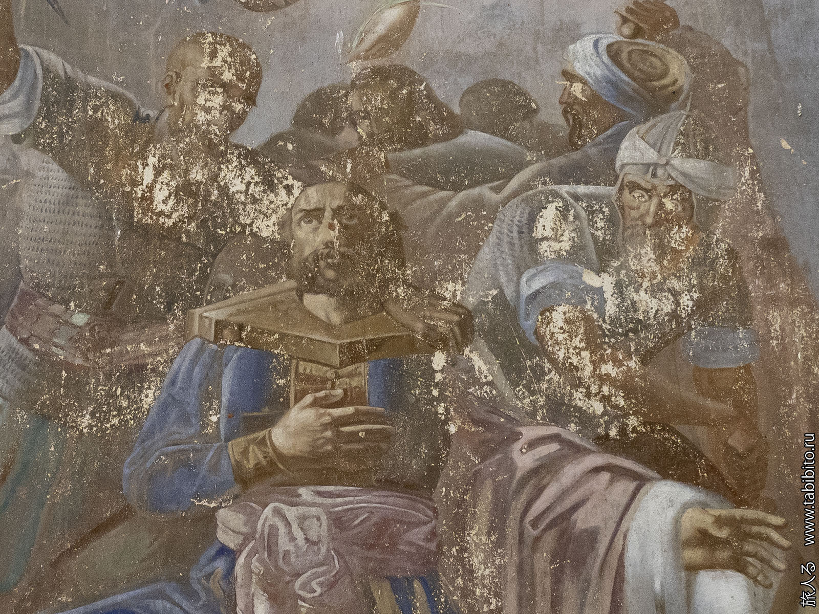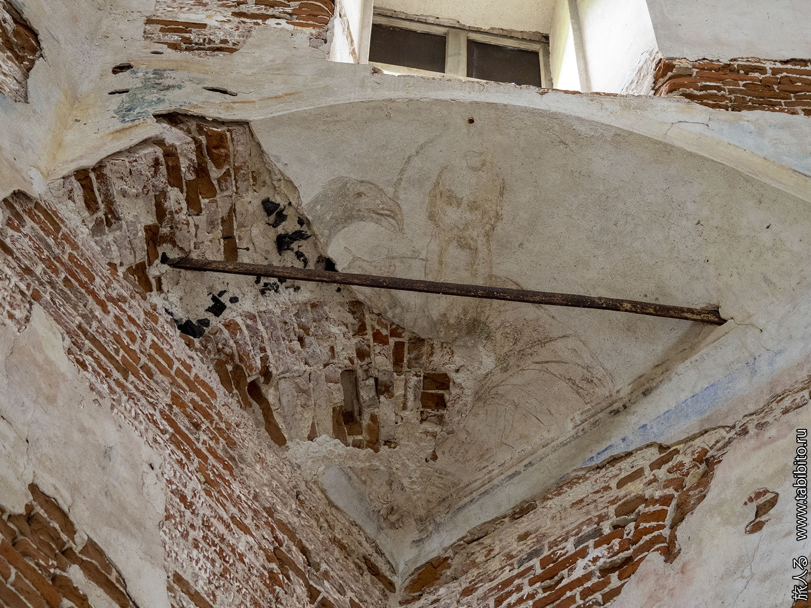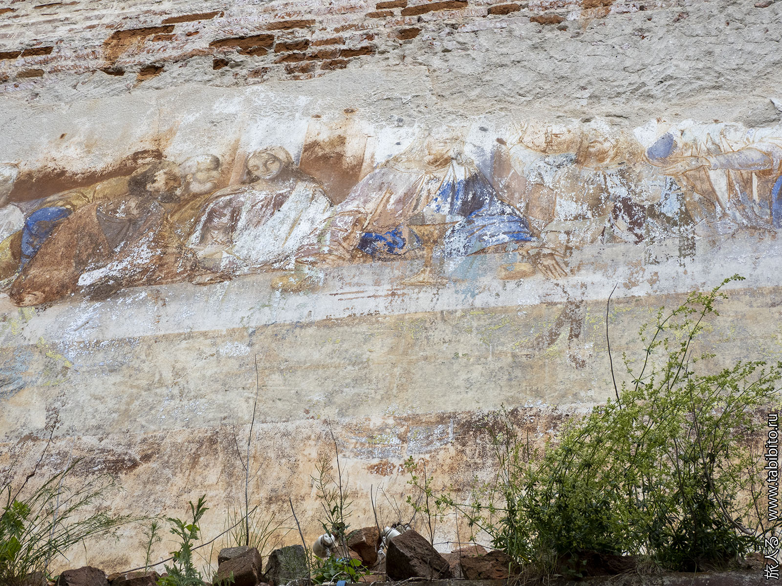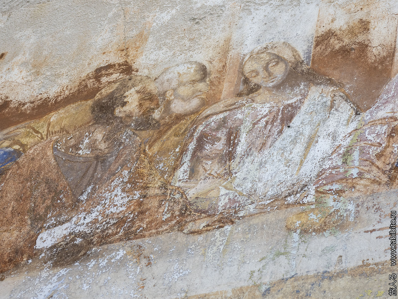 Если аккуратно зайти в трапезную, можно разглядеть на ее восточной стене над входом сцену Тайной вечери. В XIX веке ее зарисовали какой-то другой сценой, со стоящими фигурами, которую видно на фото в галерее на Sobory.ru, но из-за осадков более новая роспись сошла, обнажив первоначальную.