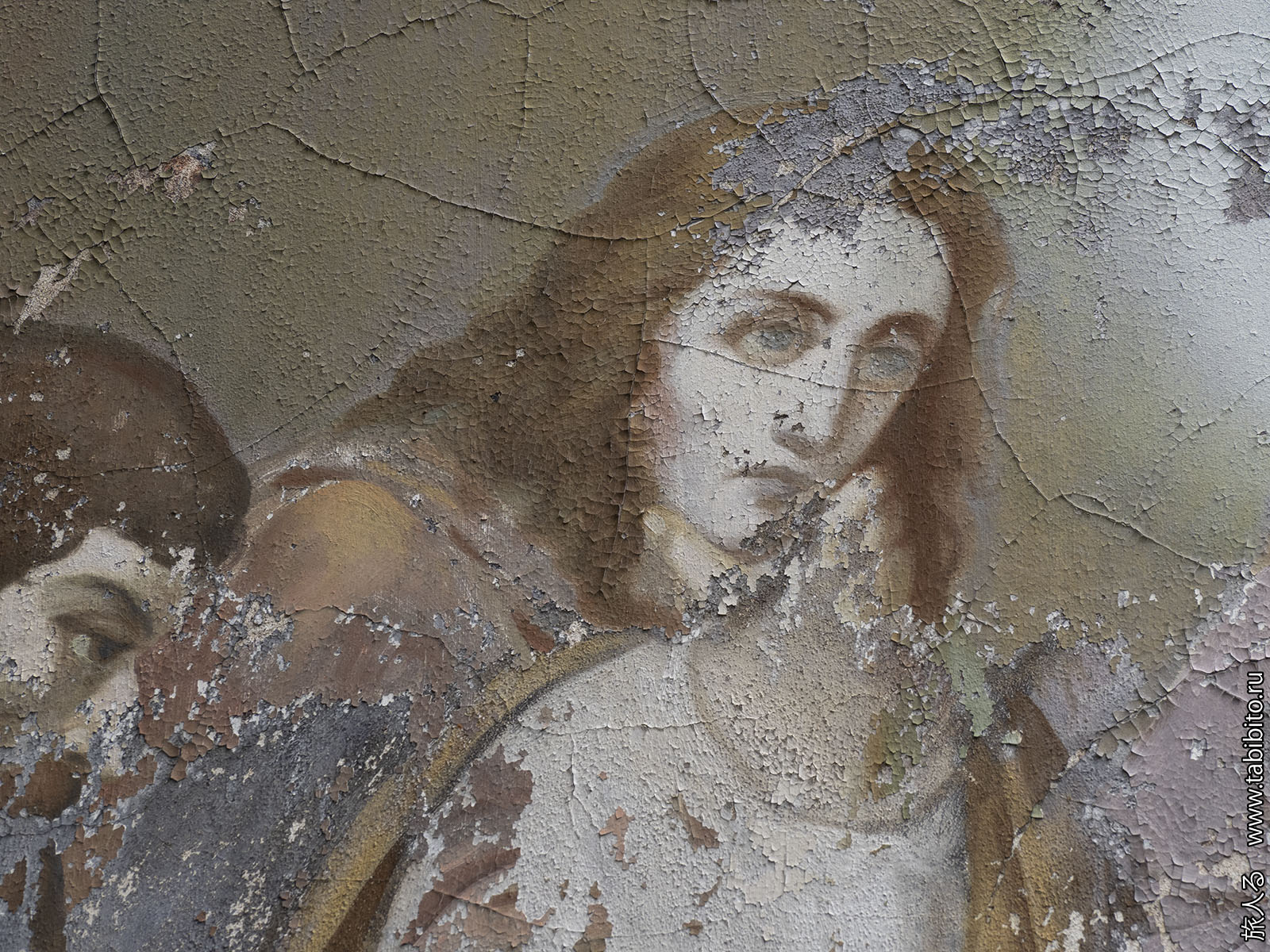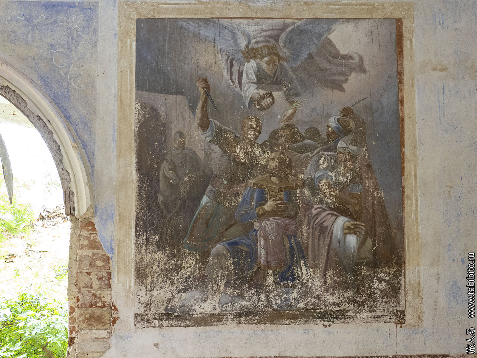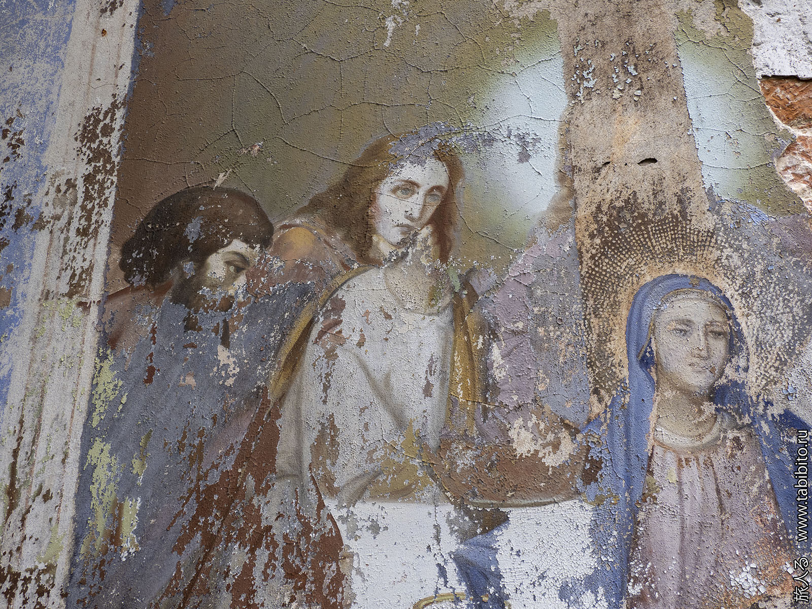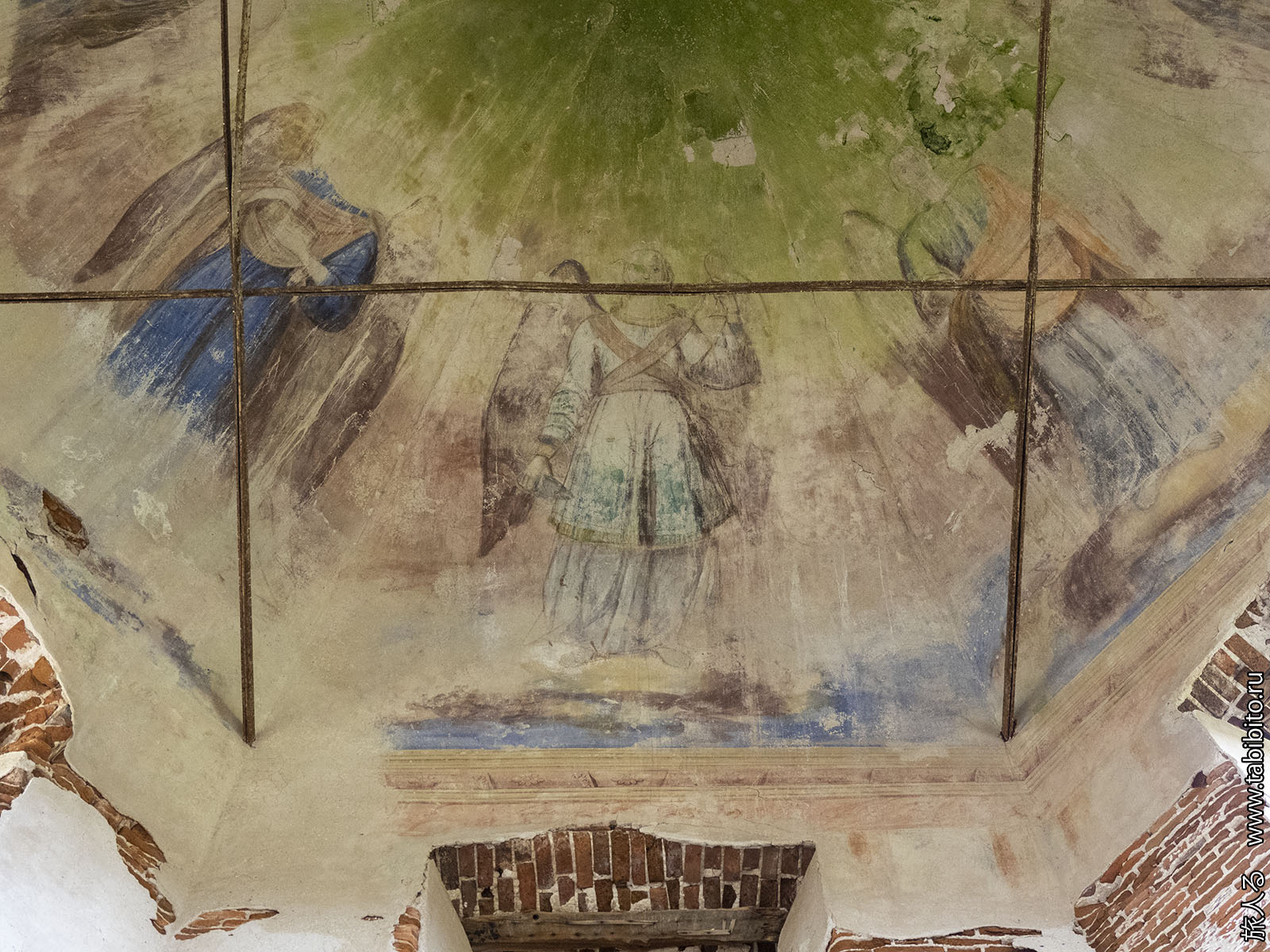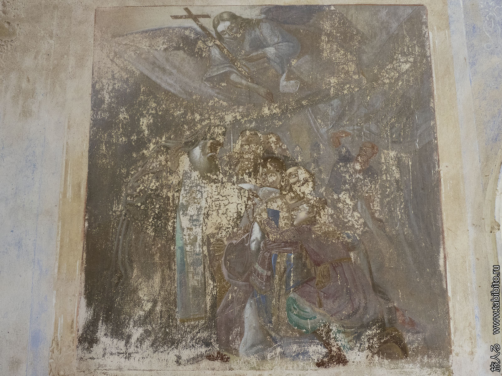 Если аккуратно зайти в трапезную, можно разглядеть на ее восточной стене над входом сцену Тайной вечери. В XIX веке ее зарисовали какой-то другой сценой, со стоящими фигурами, которую видно на фото в галерее на Sobory.ru, но из-за осадков более новая роспись сошла, обнажив первоначальную.