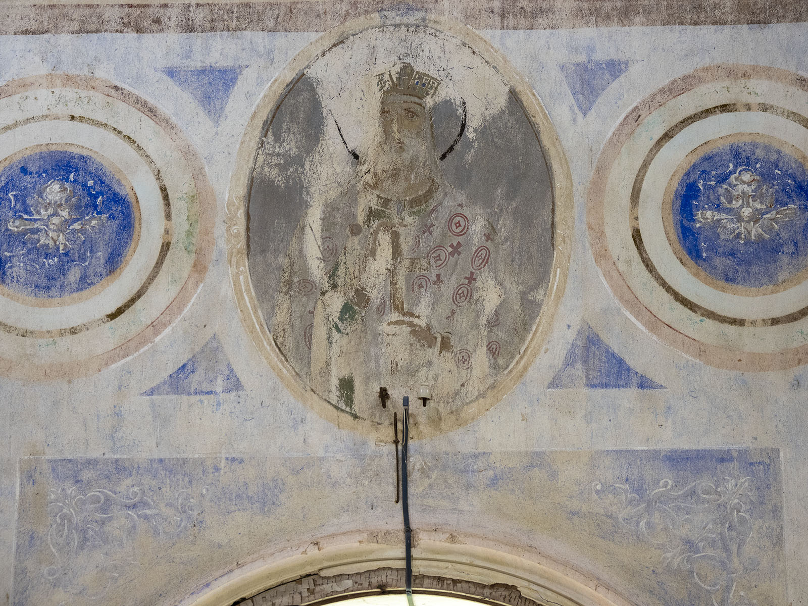 Расписан собор был дважды: после строительства в 1760-х годах и при перестройке в конце 1820-х годов. Из-за разрушения стали видны первоначальные слои росписи. Например, слева от изображения Иоанна Крестителя позднее стукко, а справа часть кладки обрушилась и стал виден херувим.