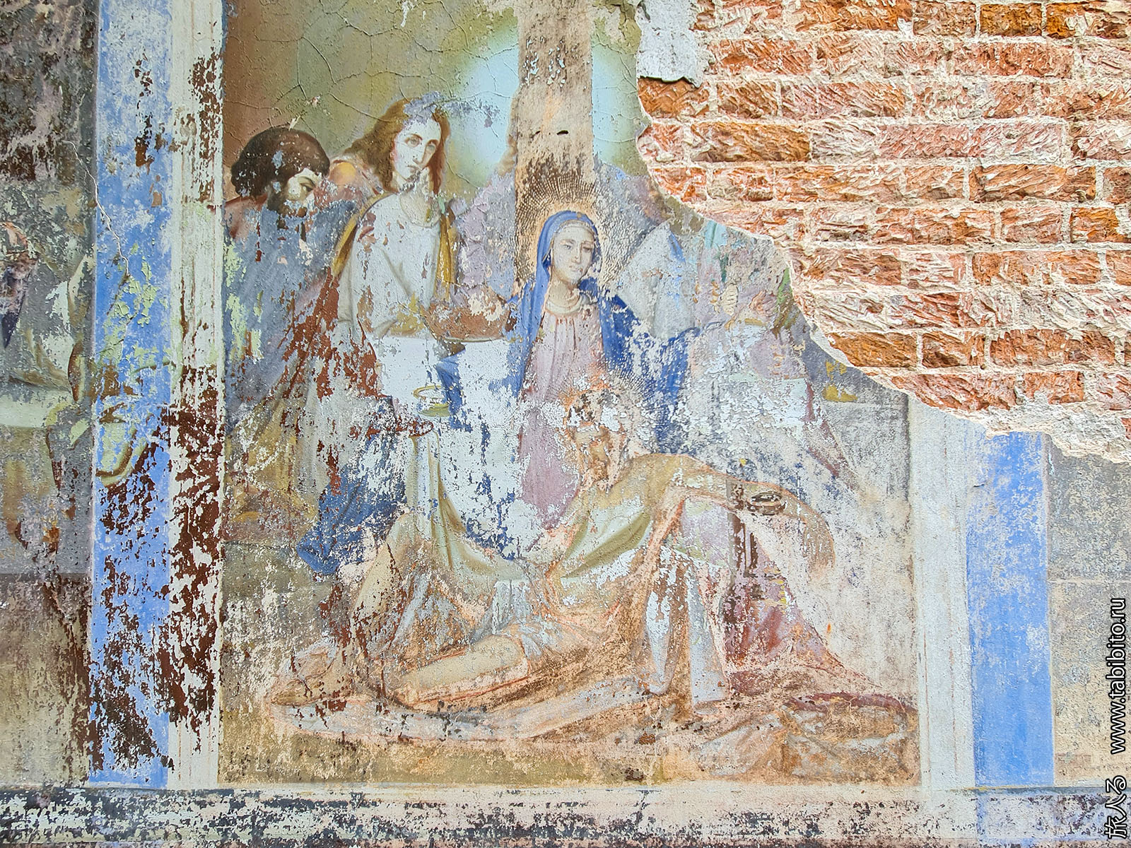 Слева внизу от нее — разъело более новую сцену Тайной вечери и проступила сцена положения во гроб.