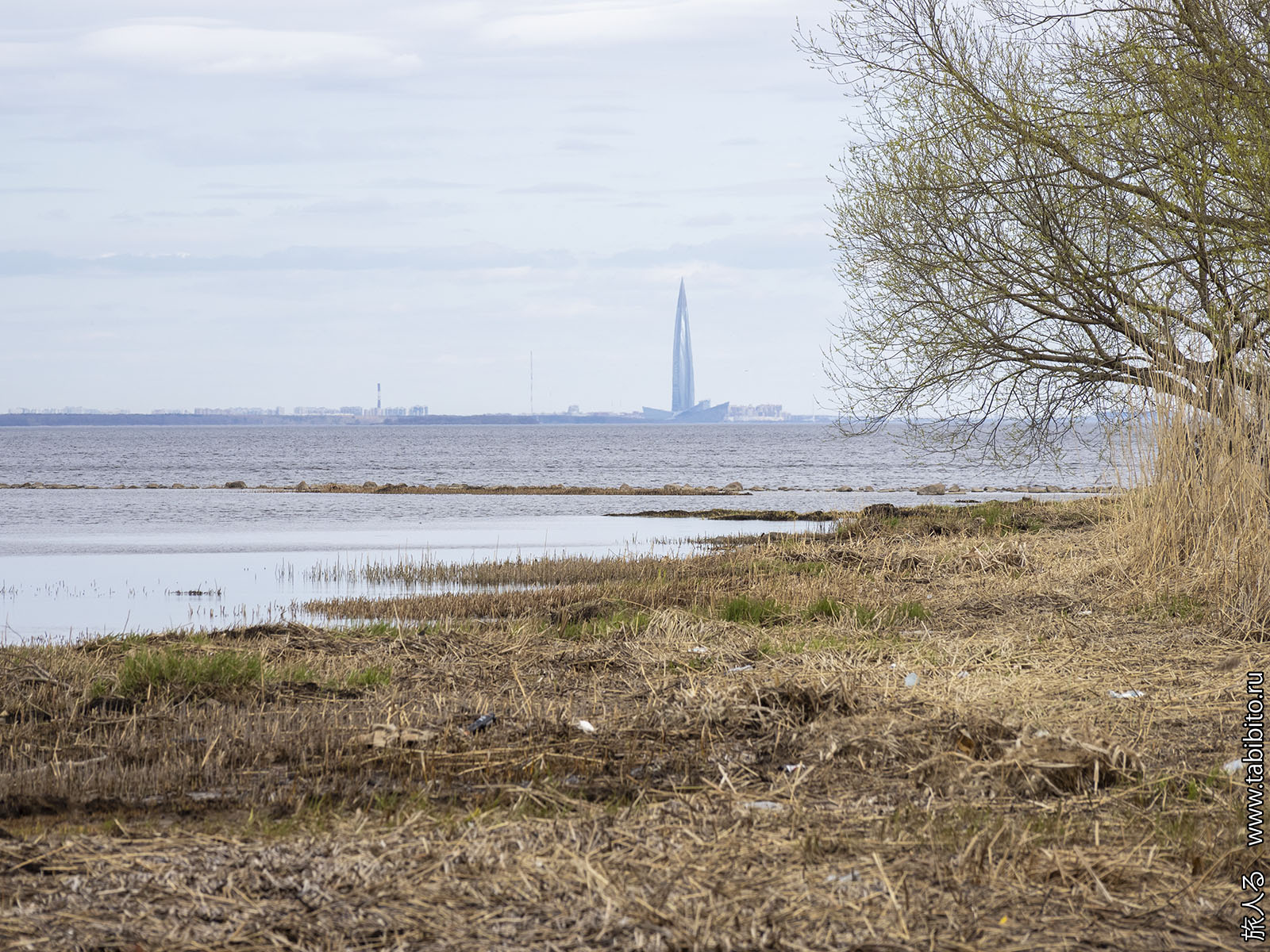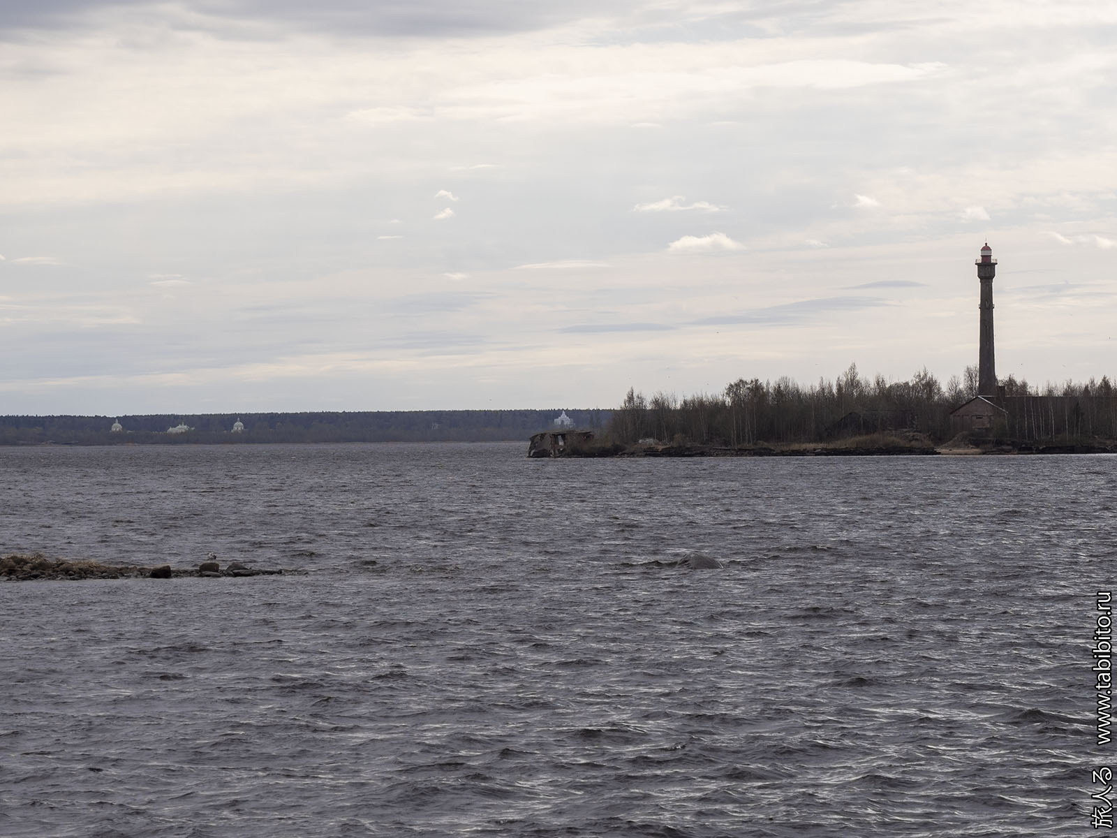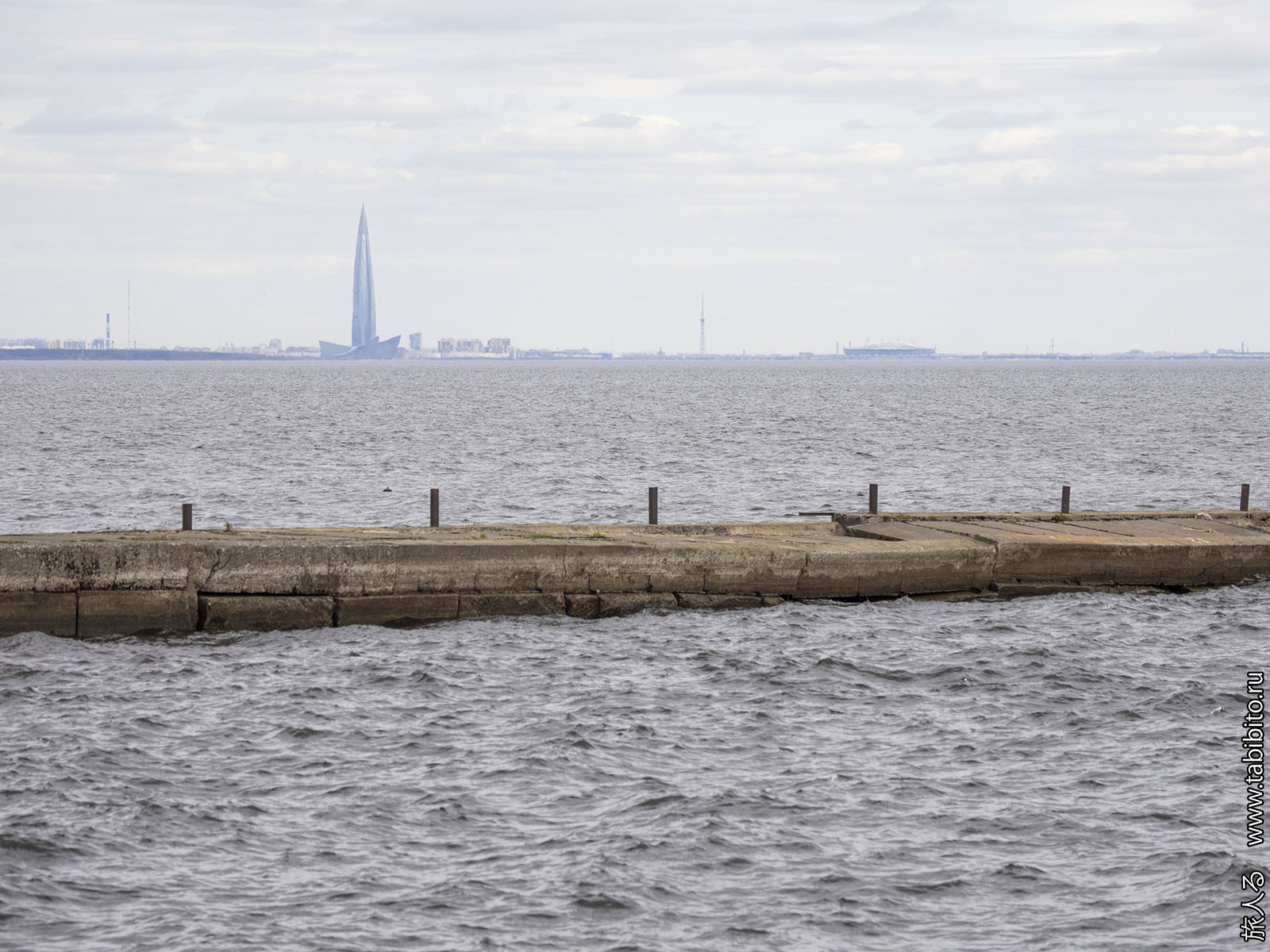 Маяк Кронштадтский задний (1915) на территории Морского завода. Вдали виднеется Ораниенбаум: Меншиковский дворец и павильон Катальной горки.