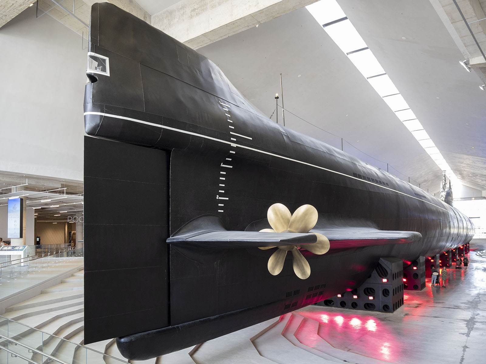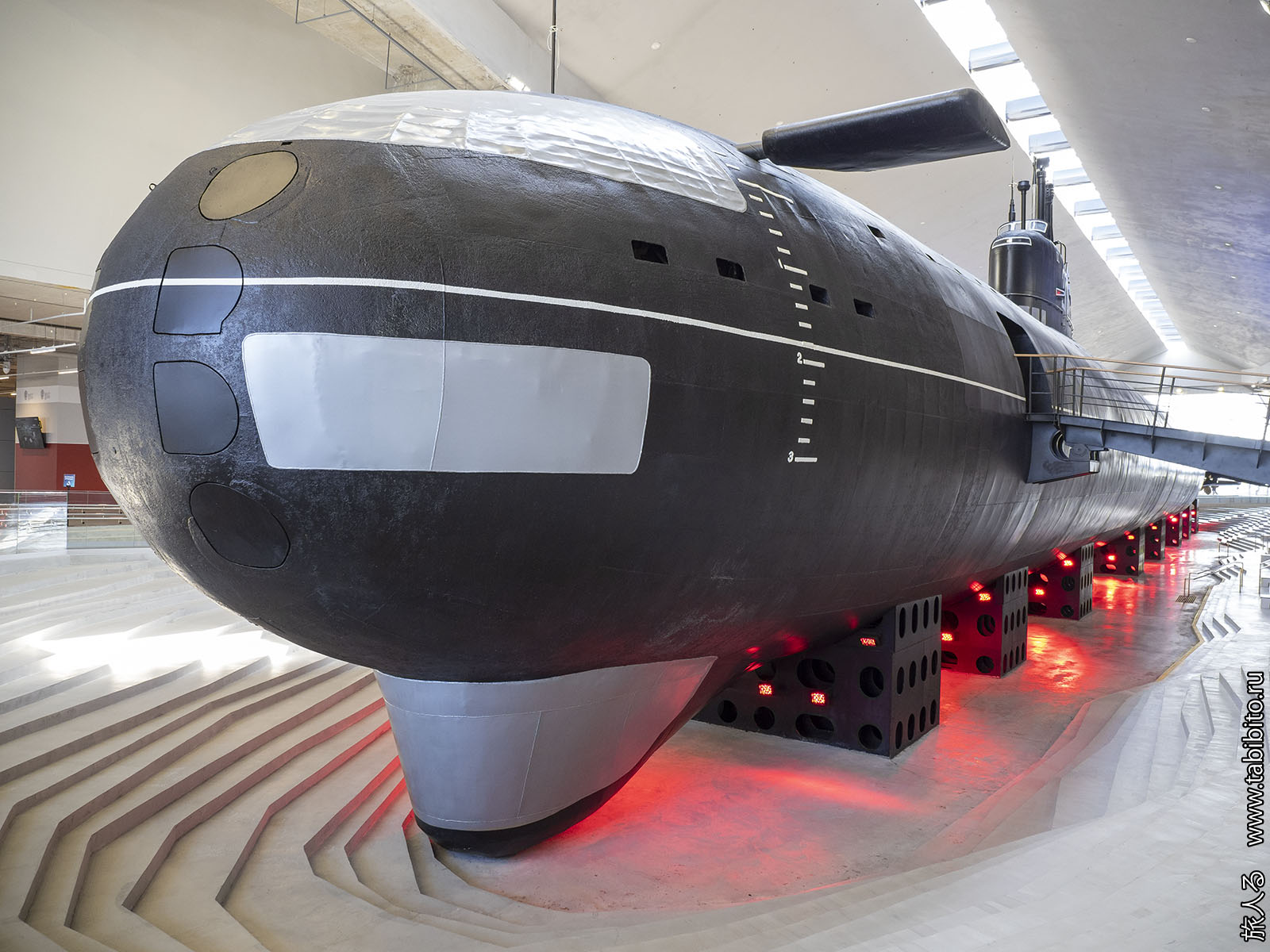 В целом подход при адапатации субмарины к показу был тот же, что и с «Новосибирским комсомольцем» в Москве: вместо межотсечных люков прорублены широкие проходы, сделана единственная палуба.