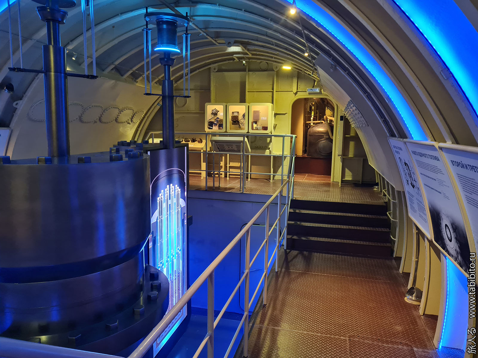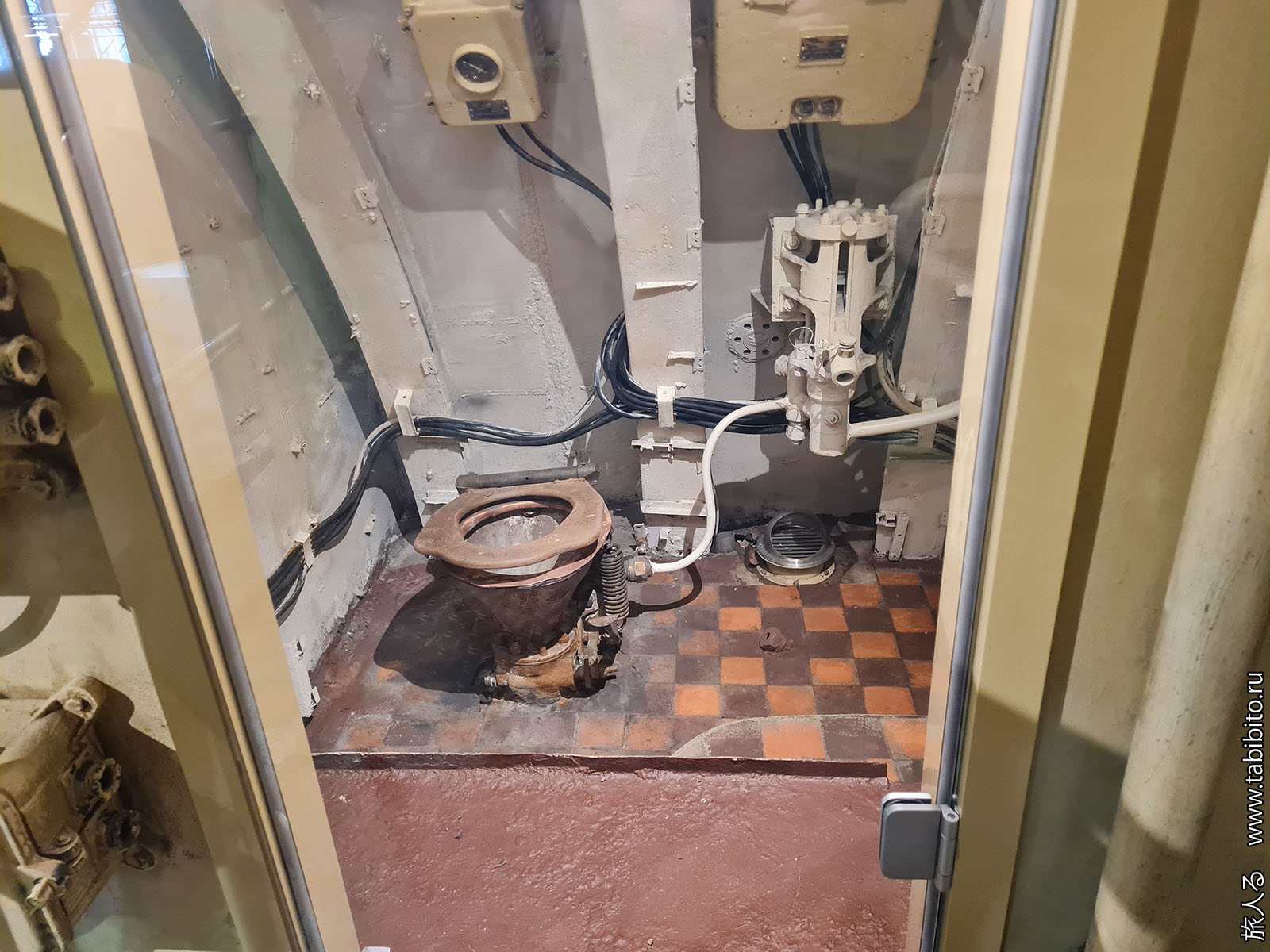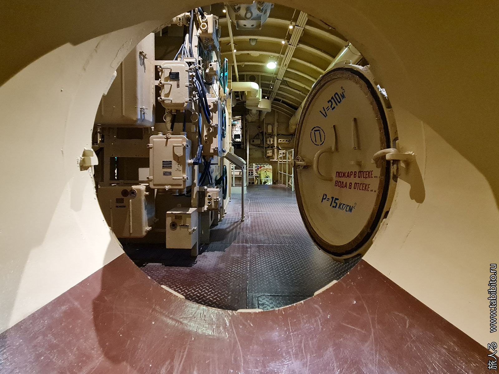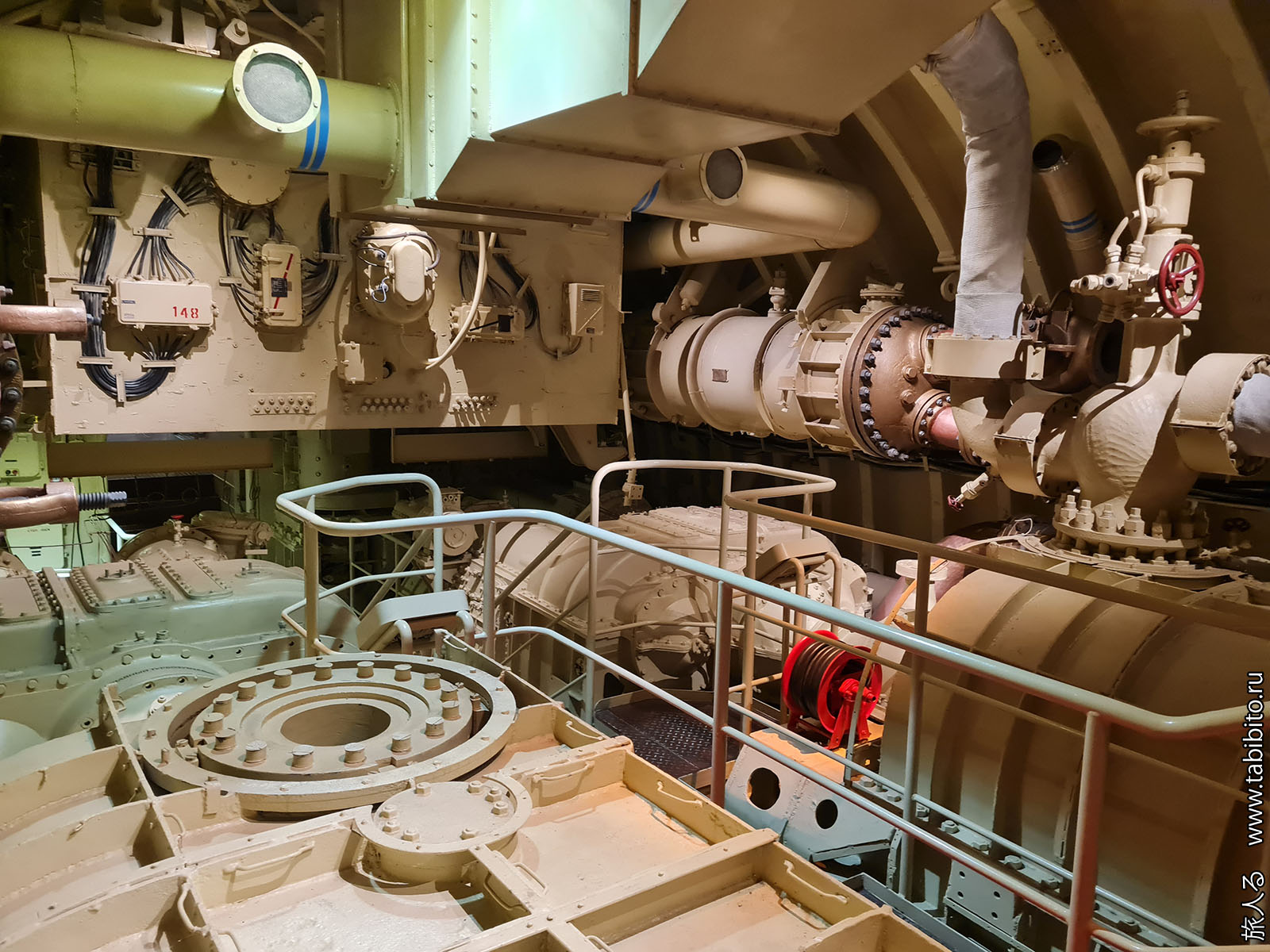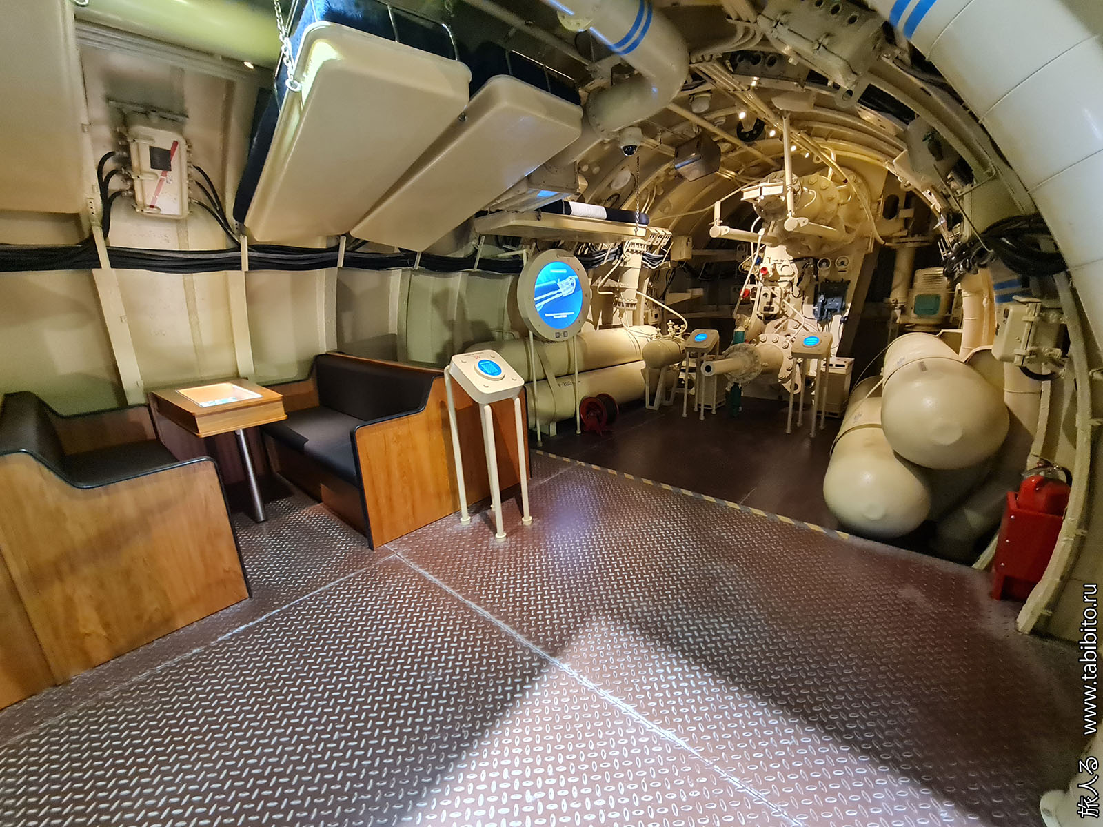 Посещение организуется маленькими экскурсиованными группами. Запускают в отсеки по очереди, рассказ идет по записи из динамиков. Гид только смотрит, чтобы никто никуда не убежал и шею не сломал. Ощущается, что на большое количество народа вентиляция не рассчитана, поэтому запись за месяц — не прихоть. Ну зато все можно сфотографировать без людей в кадре.