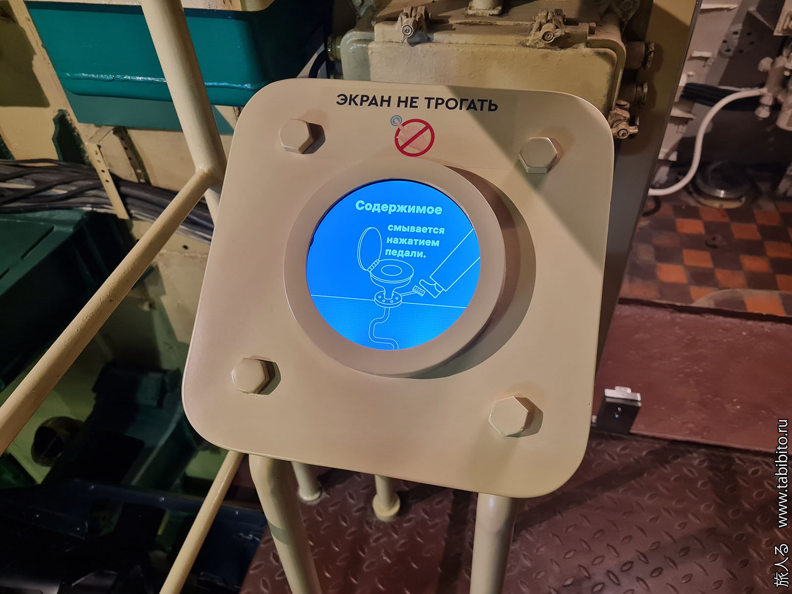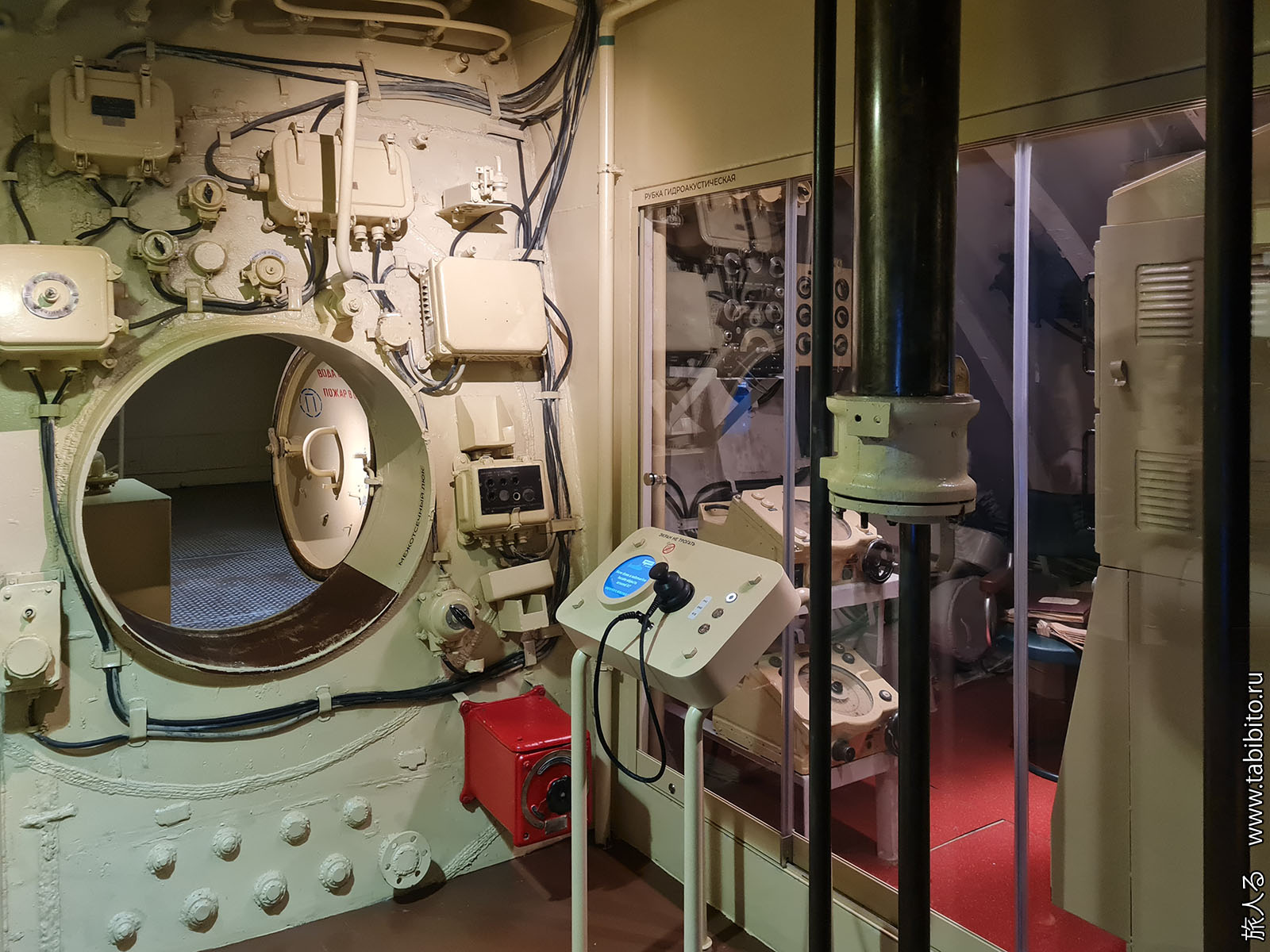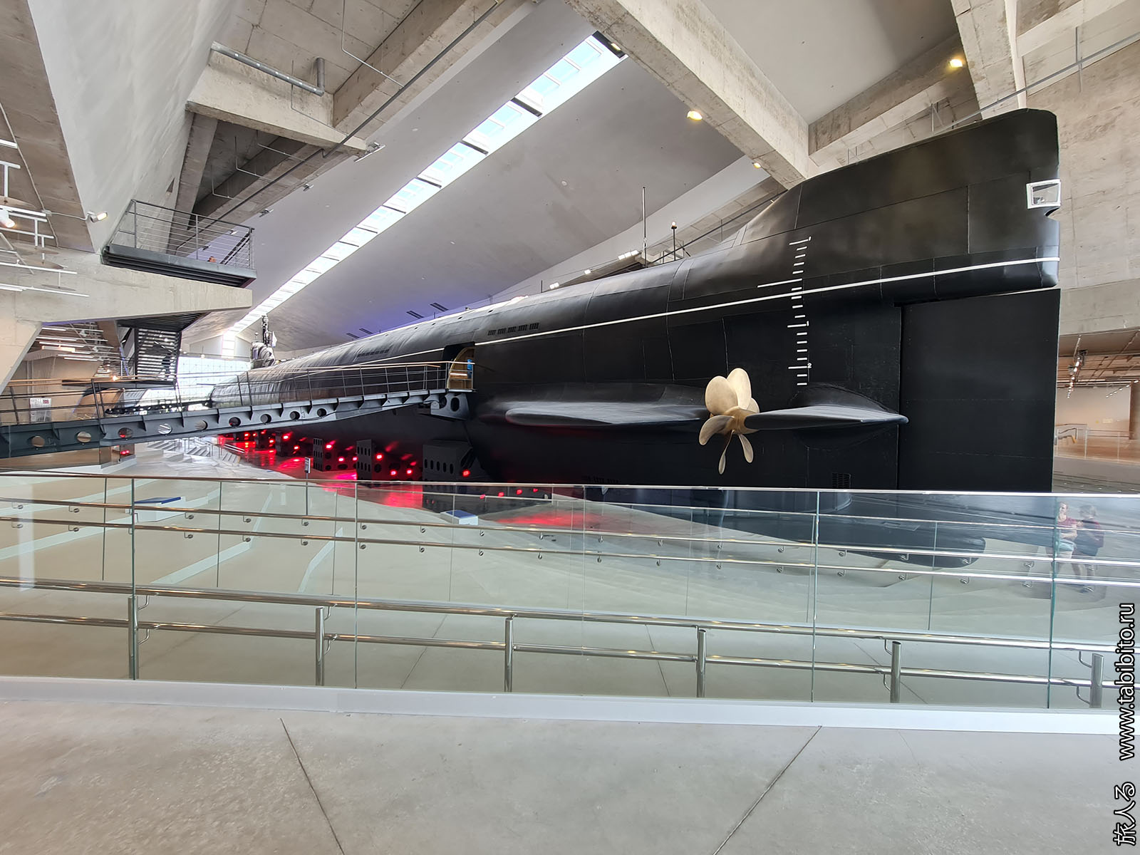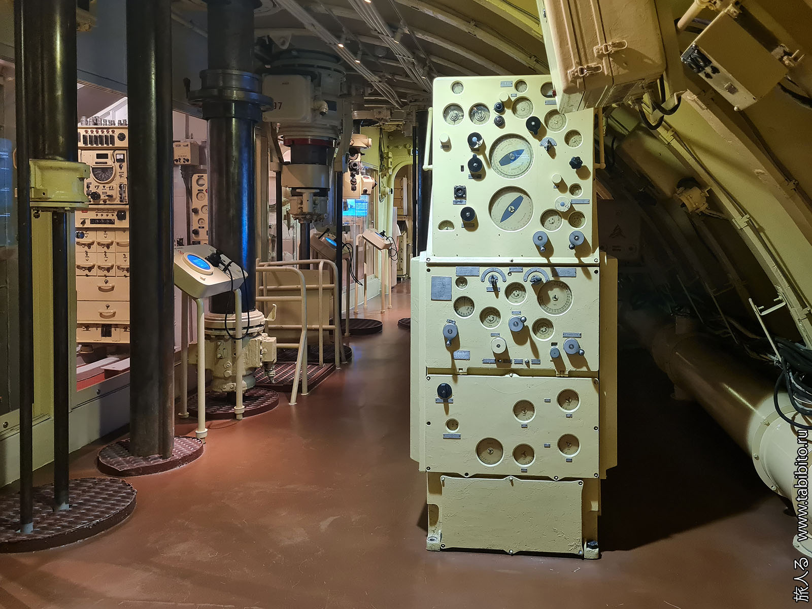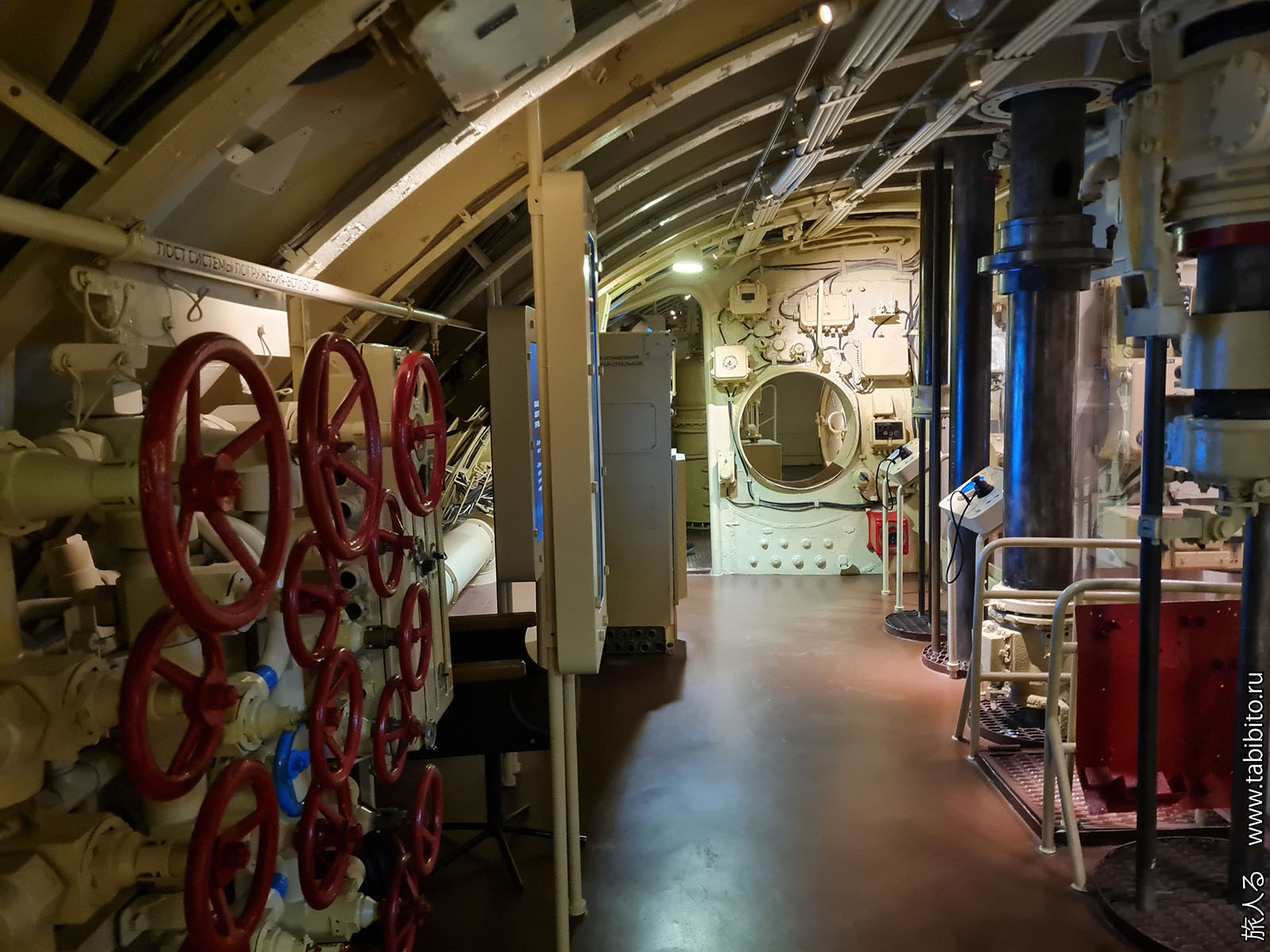 Посещение организуется маленькими экскурсиованными группами. Запускают в отсеки по очереди, рассказ идет по записи из динамиков. Гид только смотрит, чтобы никто никуда не убежал и шею не сломал. Ощущается, что на большое количество народа вентиляция не рассчитана, поэтому запись за месяц — не прихоть. Ну зато все можно сфотографировать без людей в кадре.