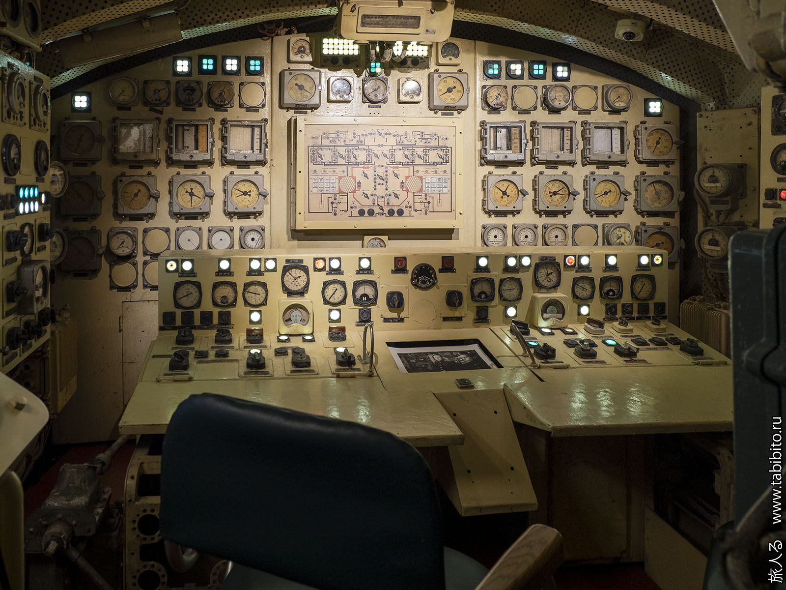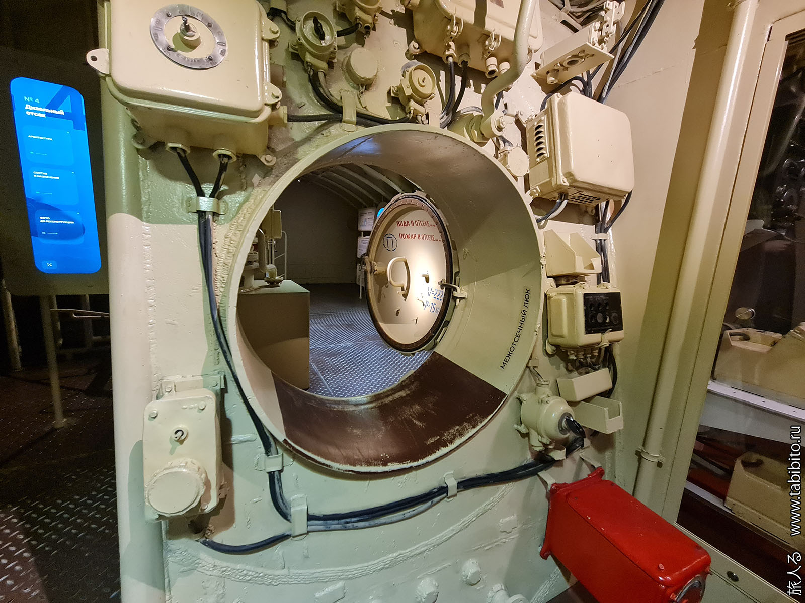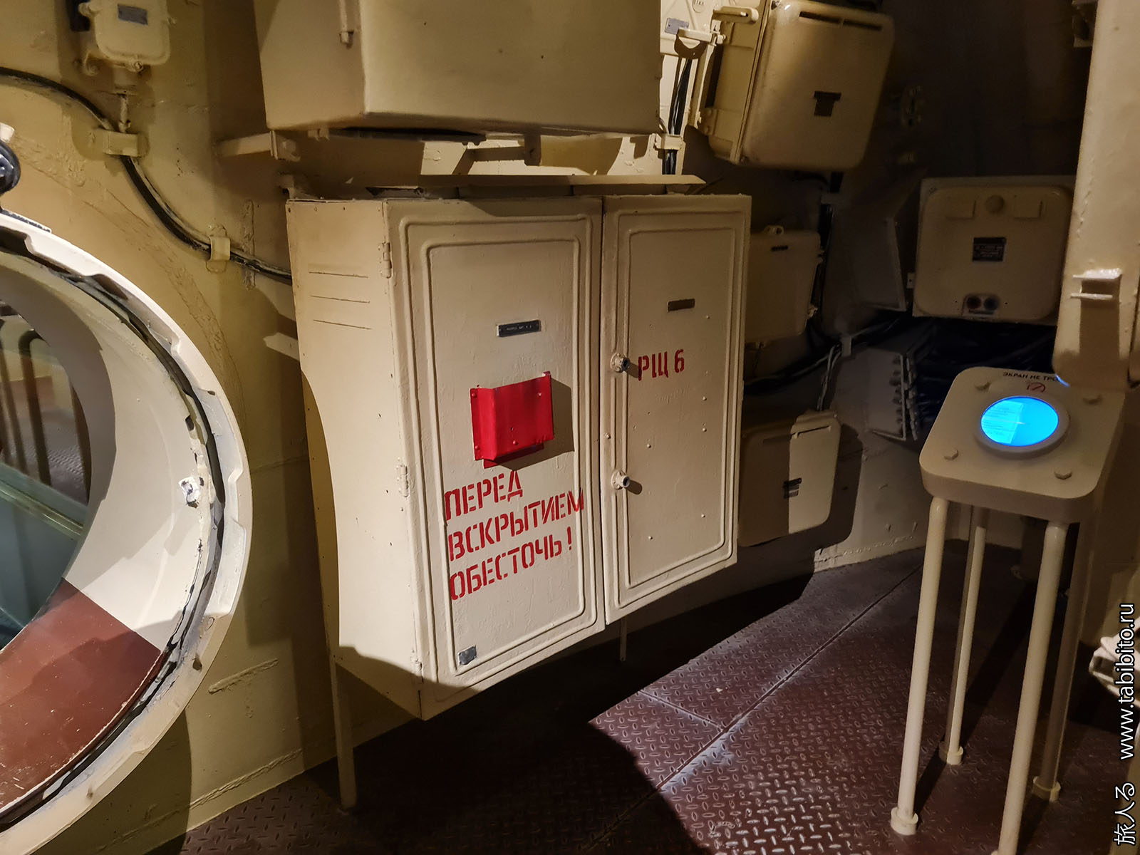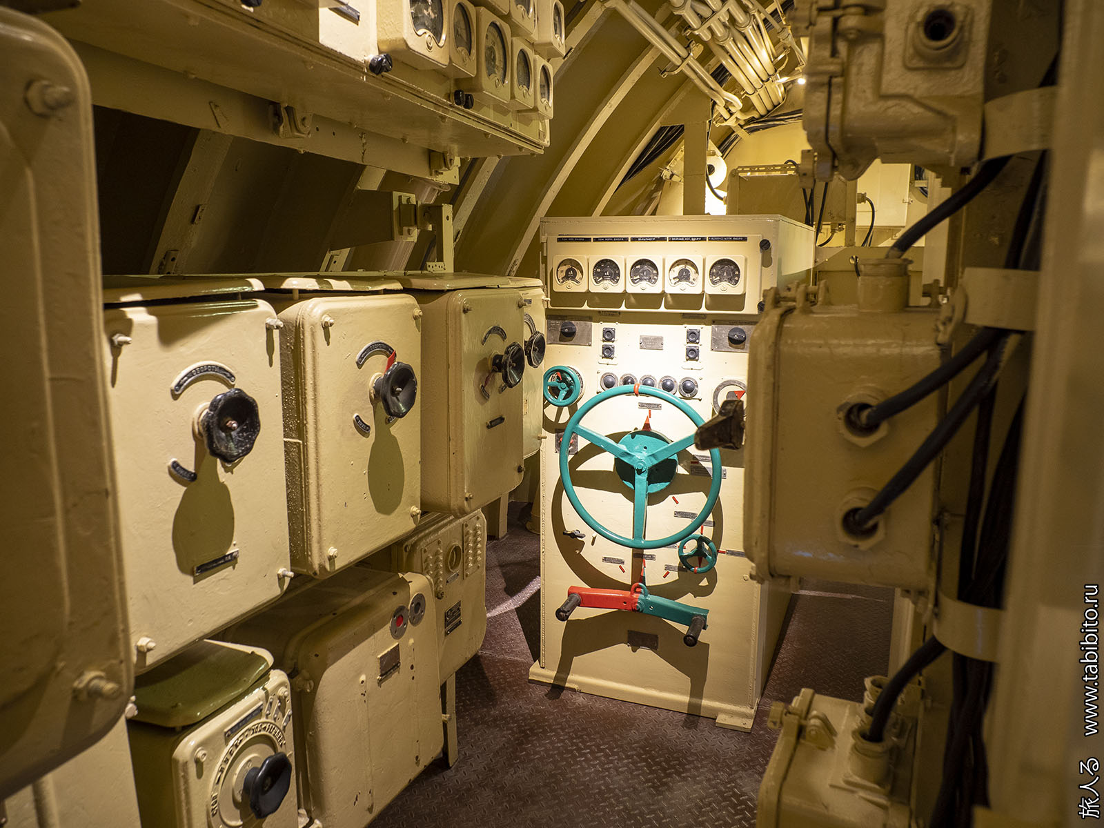 Посещение организуется маленькими экскурсиованными группами. Запускают в отсеки по очереди, рассказ идет по записи из динамиков. Гид только смотрит, чтобы никто никуда не убежал и шею не сломал. Ощущается, что на большое количество народа вентиляция не рассчитана, поэтому запись за месяц — не прихоть. Ну зато все можно сфотографировать без людей в кадре.