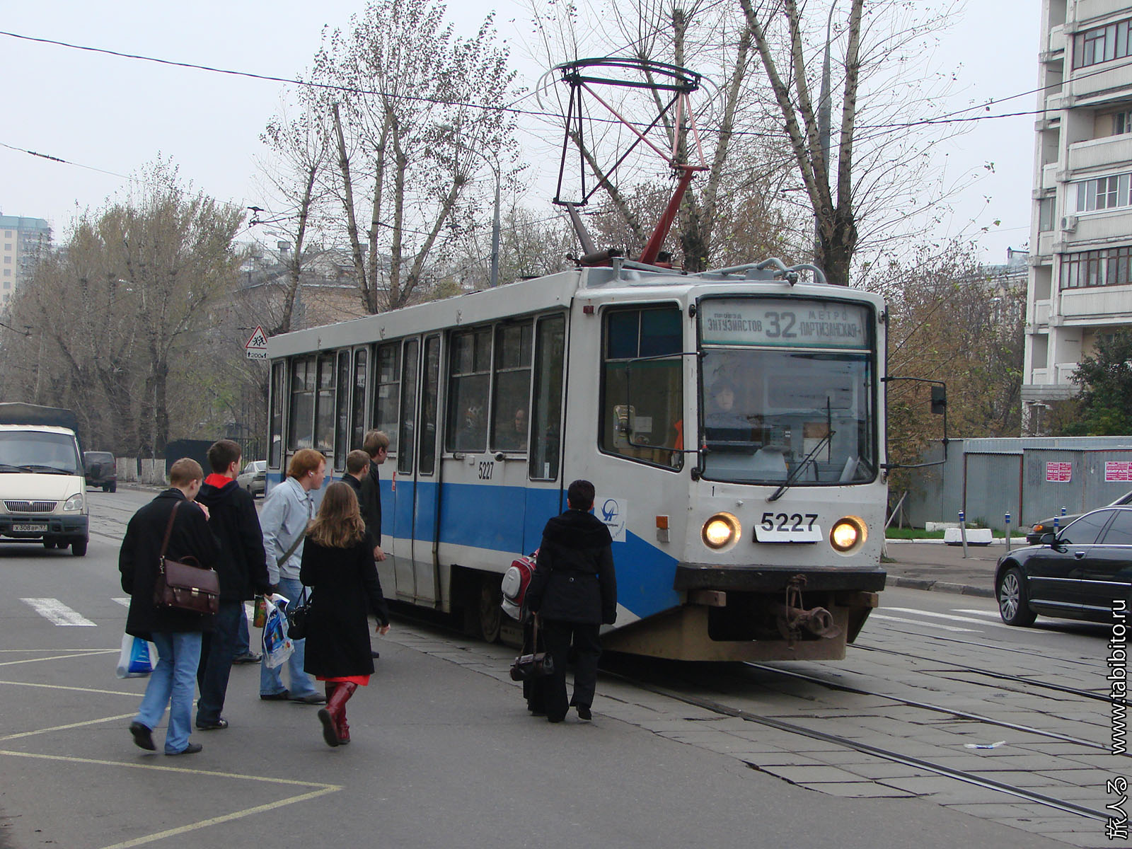 Высокопольный трамвай модели 71-608КМ с посадкой через проезжую часть.