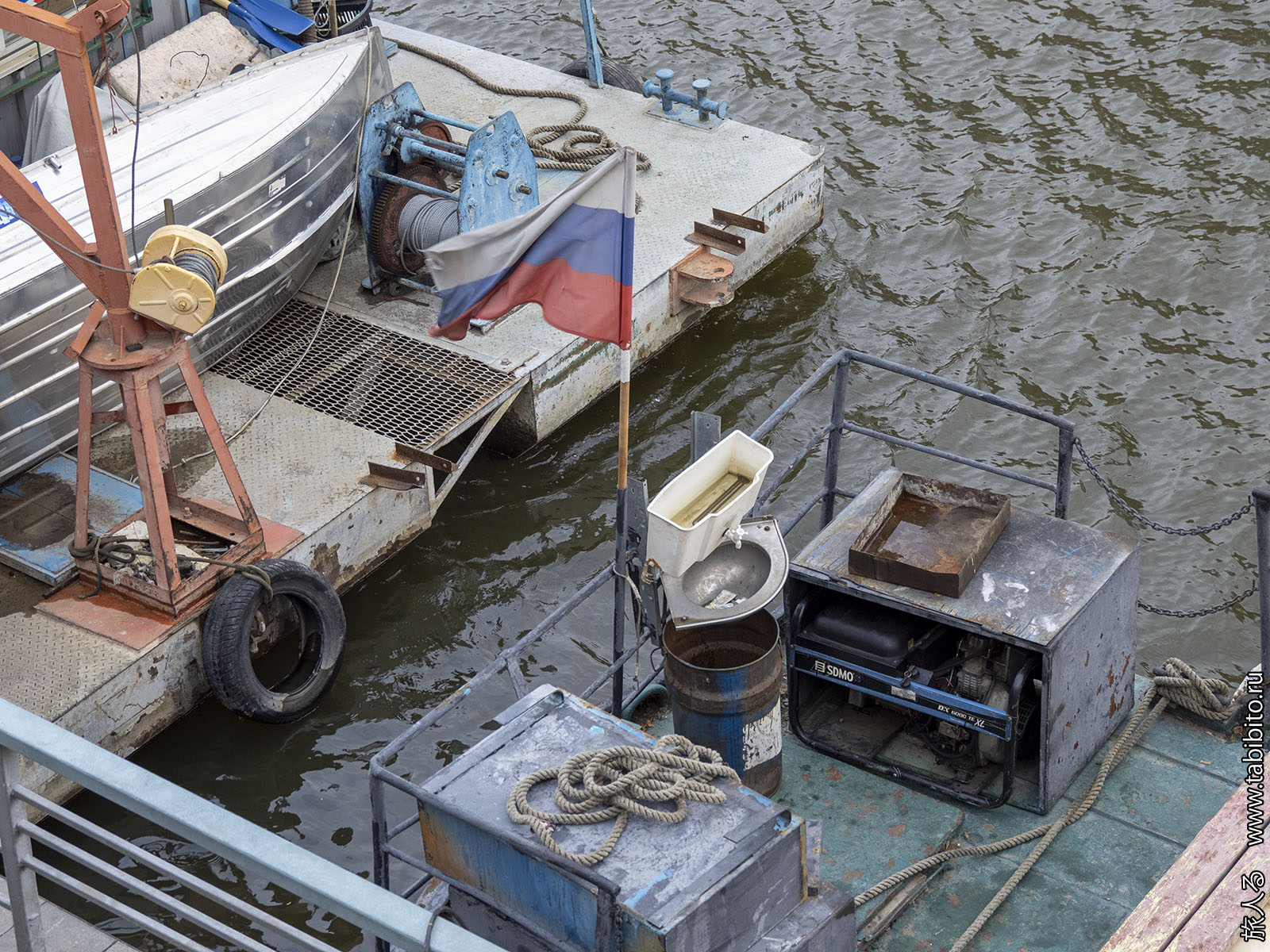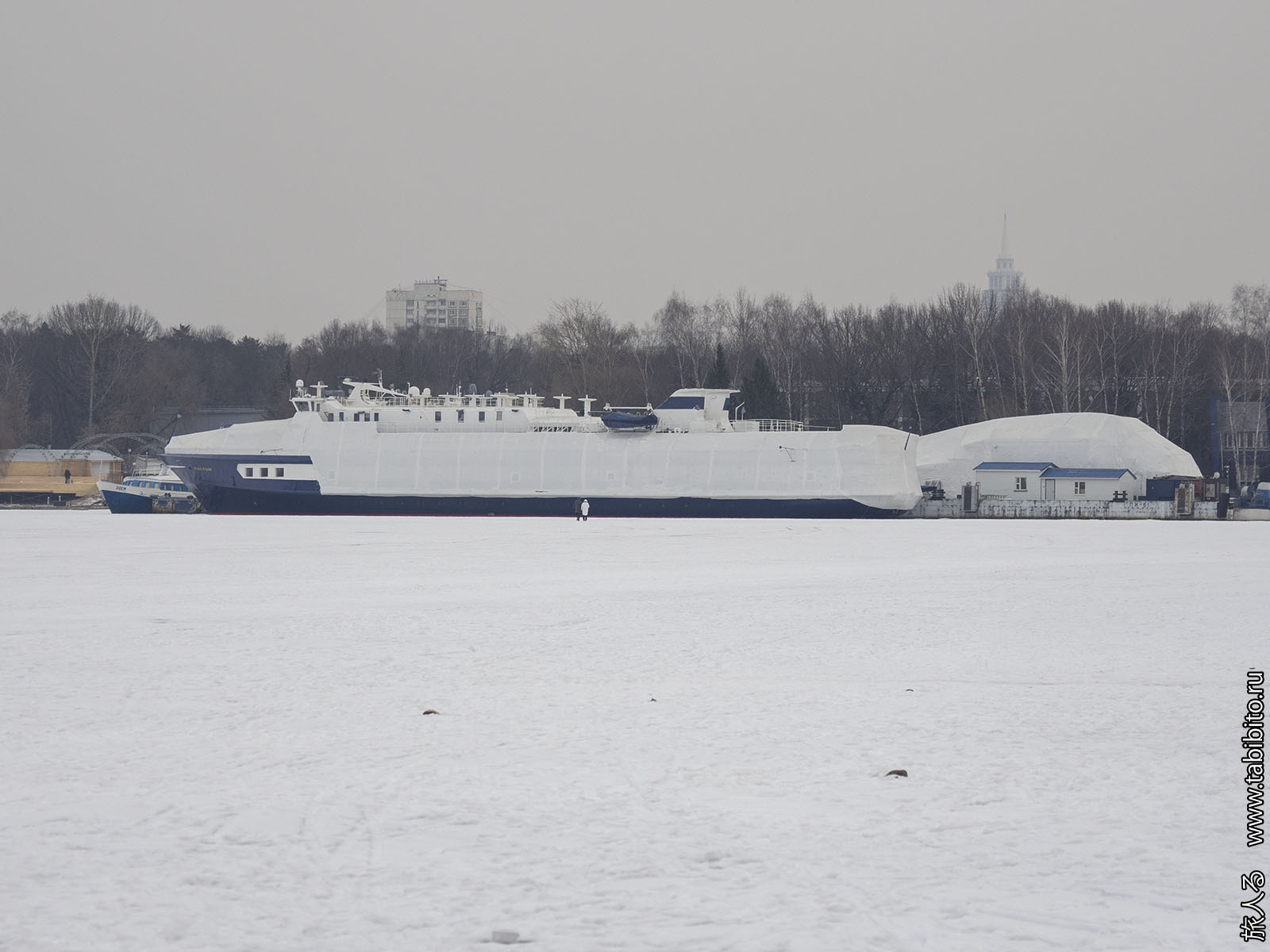 Затянутое в брезент круизное судно «Россия», предназначенное для круизных перевозок «первых лиц». Но так как «первые лица» у нас занятые, не до круизов, оно только периодически в летний период выходит порожняком в дальние рейсы (до Перми, Астрахани или Архангельска), чтобы экипаж не терял навыков.