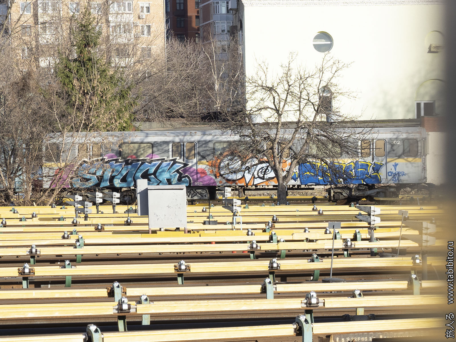 На путях Краснопресненского метродепо стоит разграффиченый вагон «Яузы», используемый для тренировок ремонтников.