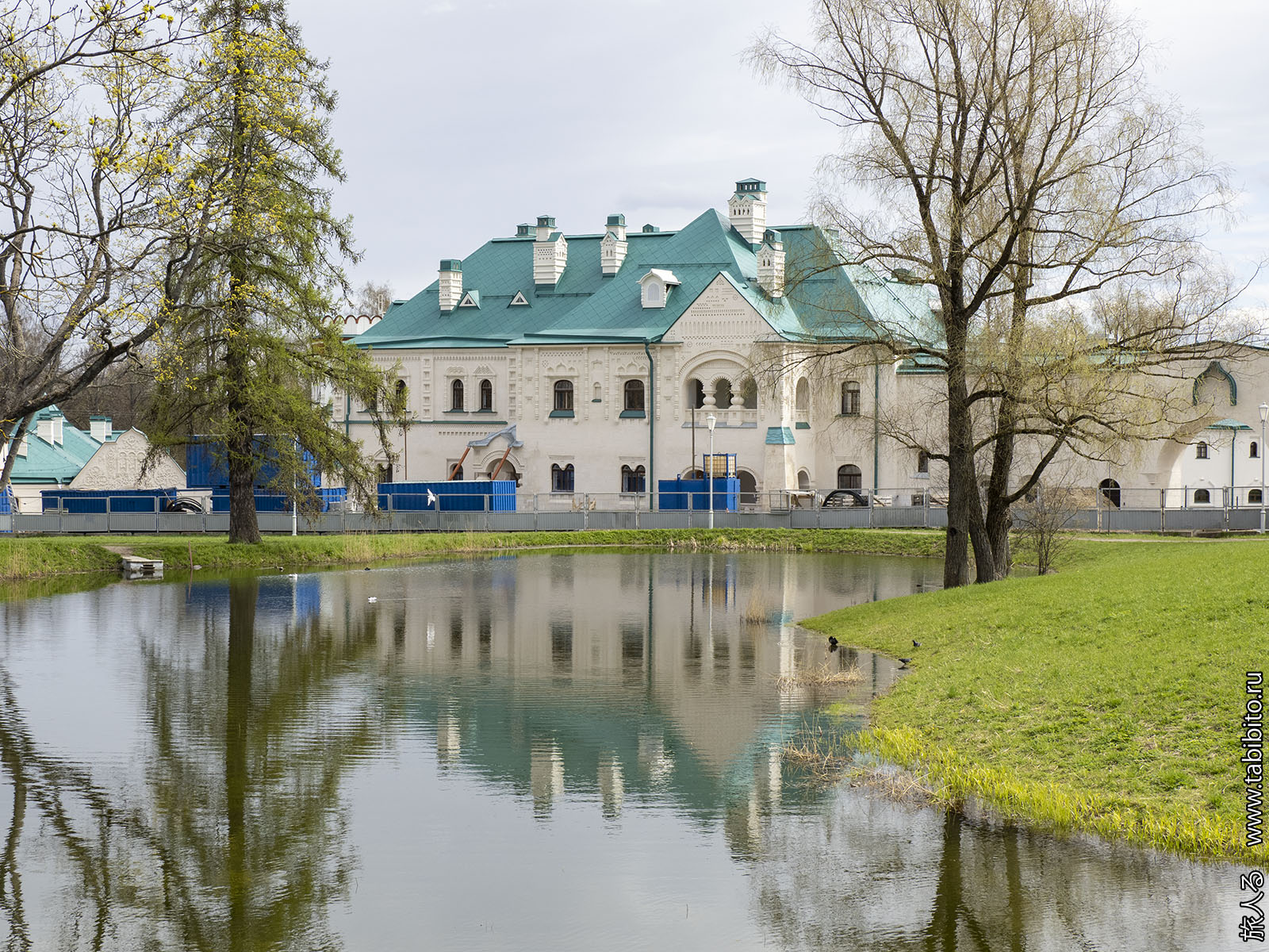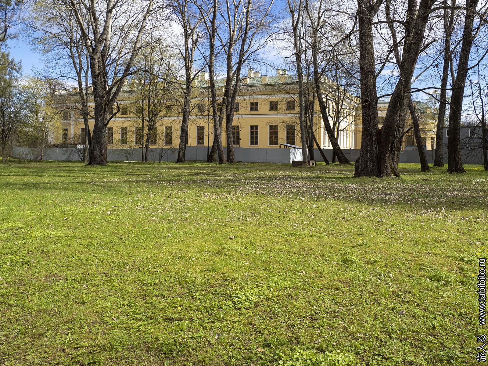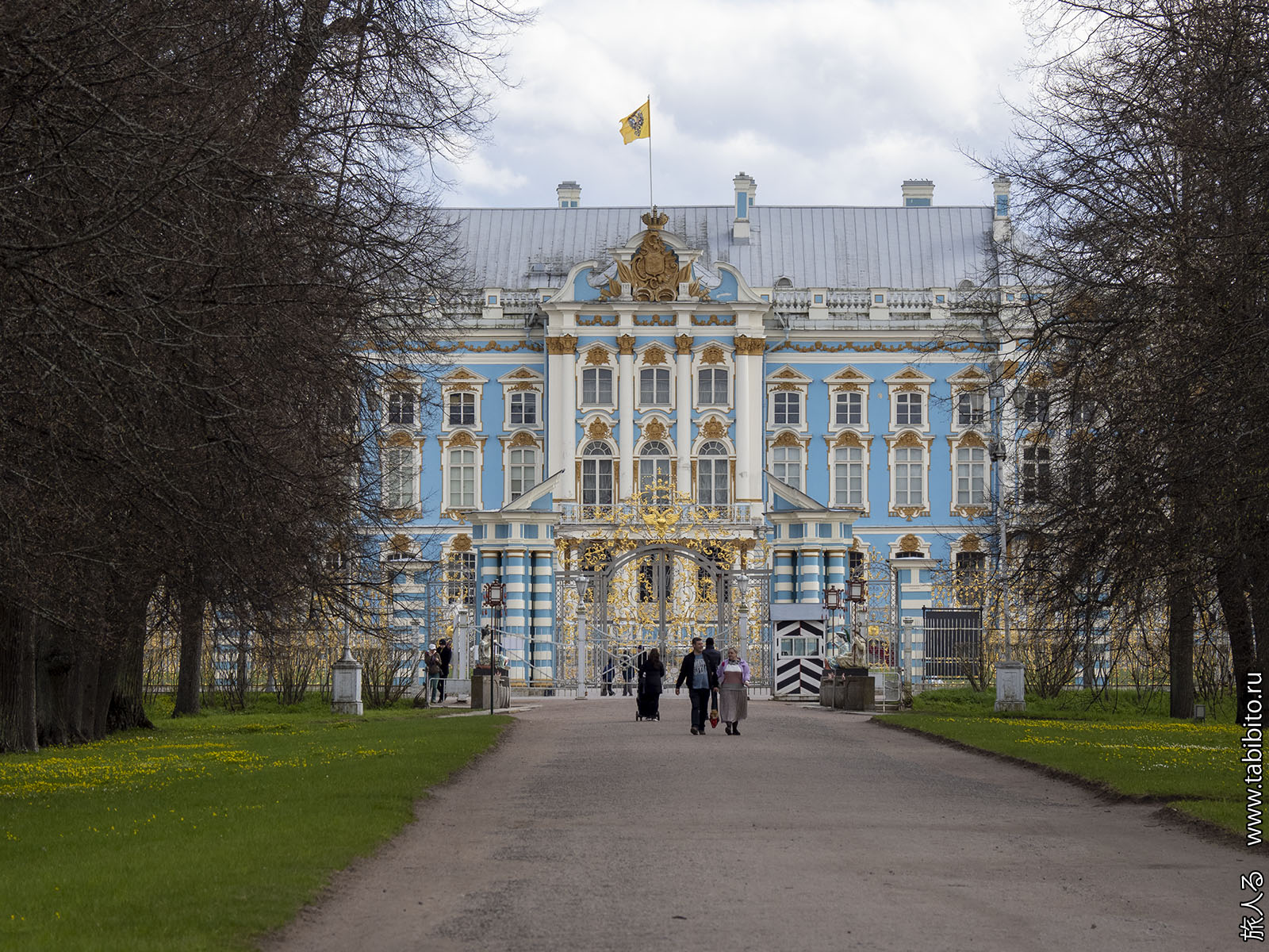Александровский дворец со стороны парка до сих пор на ремонте. Для проезда техники к нему построили временную дорогу из бетонных плит.