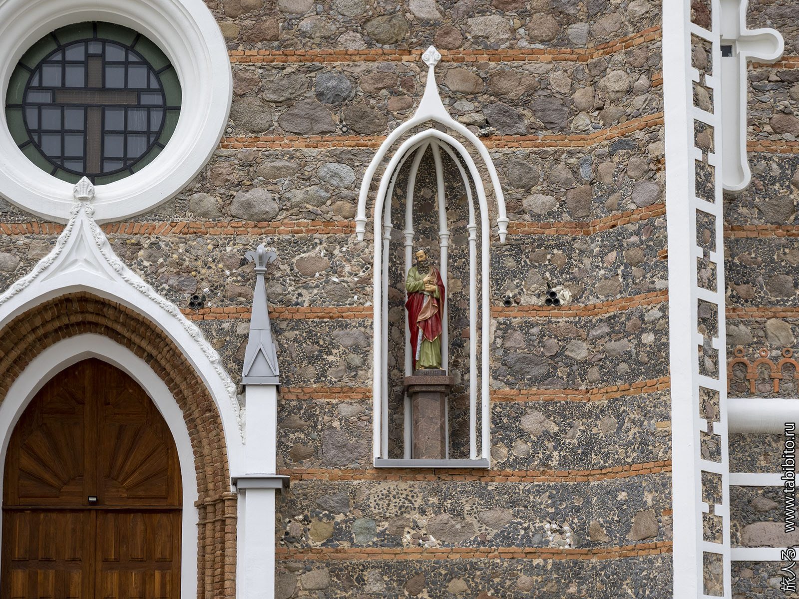 На щипце — герб магнатского рода Пацов: на момент перестройки костела Рожанкой владел генерал Людвик Михал Пац, служивший у Наполеона. В 1830 году он поддержал польское восстание, после чего Рожанку у него, естественно, отобрали.