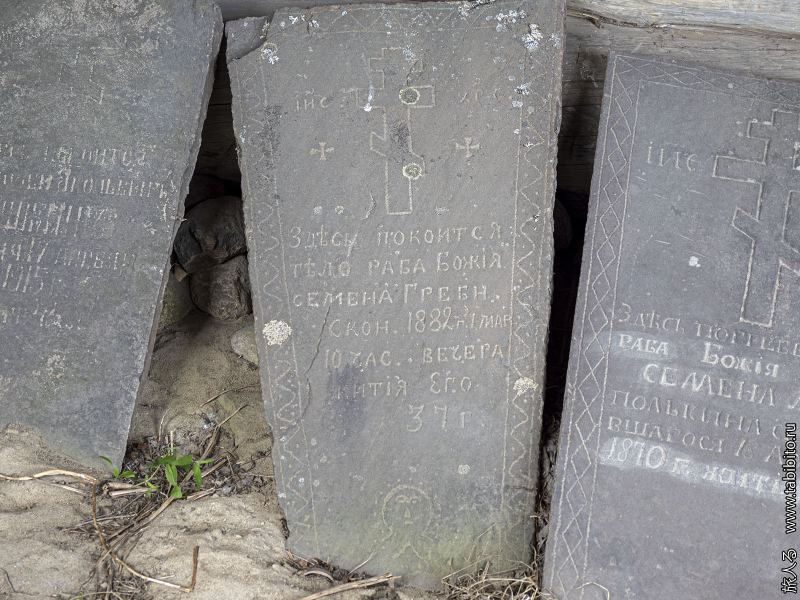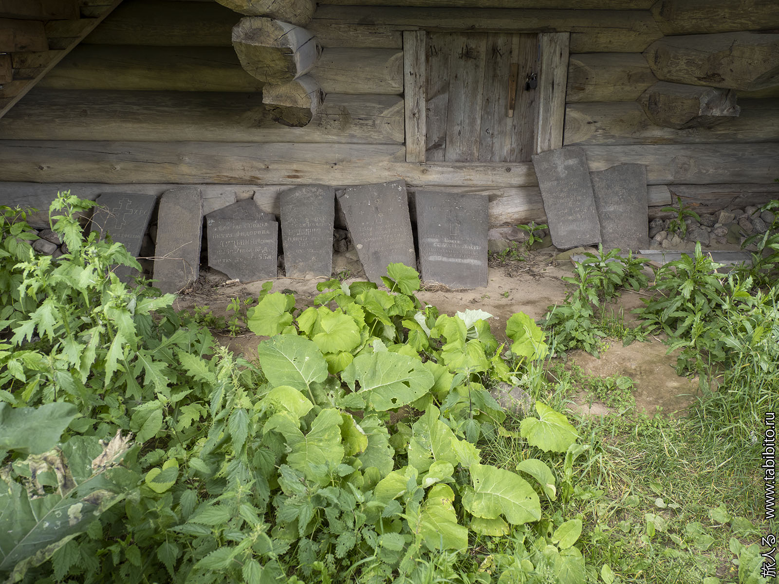 У подклета сложены старые могильные плиты.
