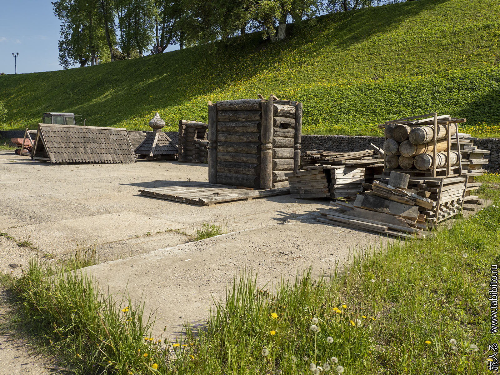 Расчлененка какой-то деревянной часовни на служебной парковке.