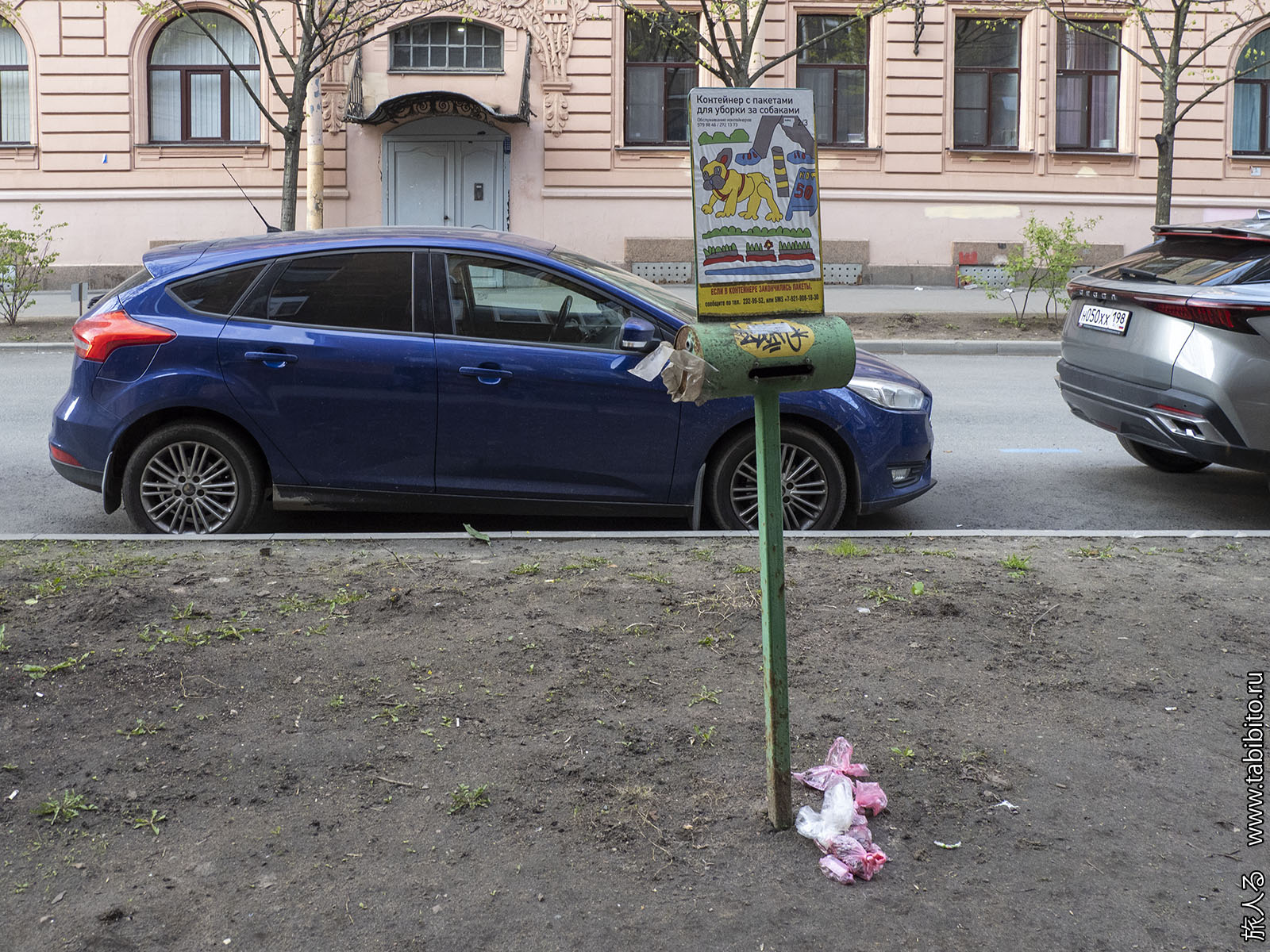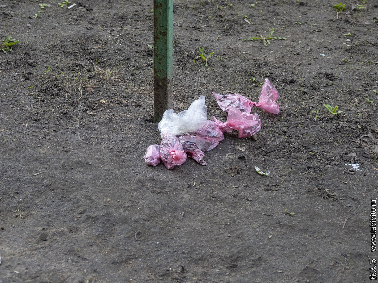 Почему-то пакетики с собачьими фекалями тут принято не выкидывать в мусорку, а подкладывать к столбику с чистыми пакетами. Видимо, нашли способ раздельной утилизации?