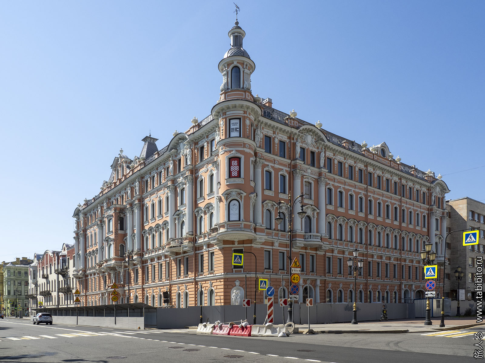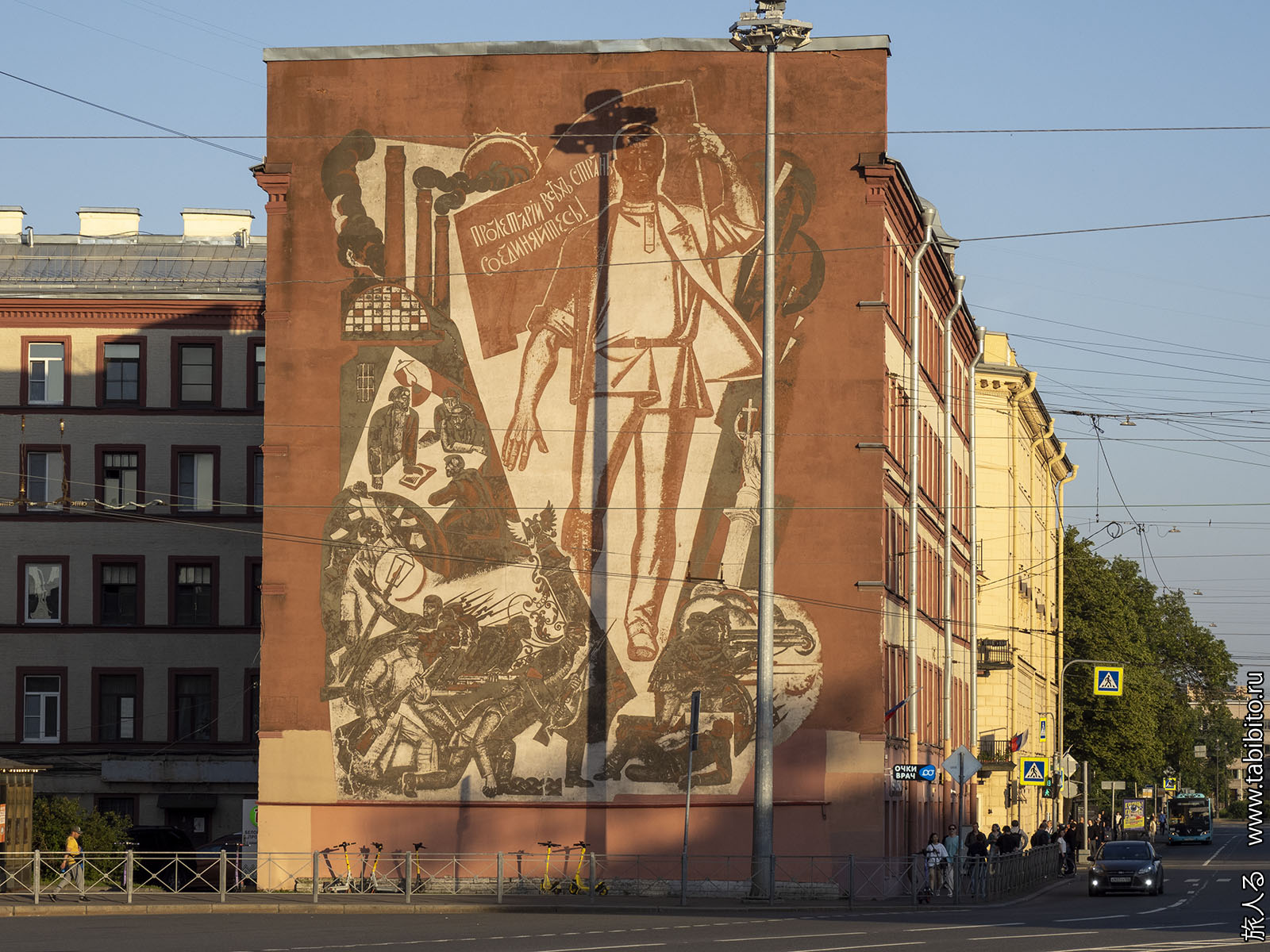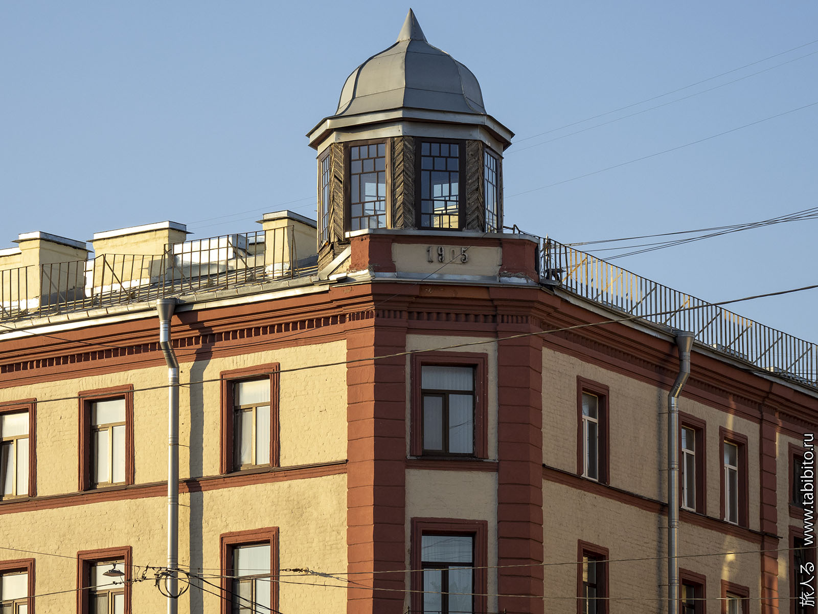 Доходный дом Гордзялковских (1905, проспект Стачек, 2/2) с башенкой и революционным панно.
