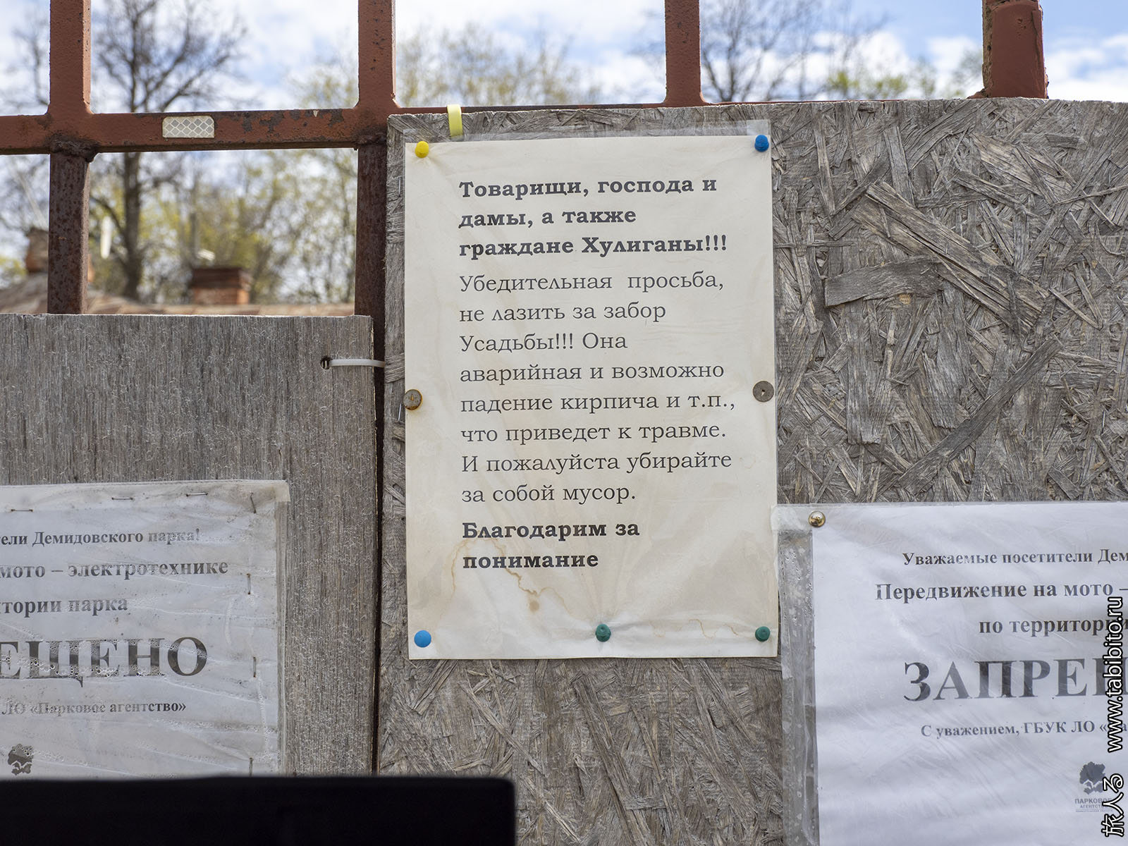 В прошлый раз в Тайцах был осмотрен только храм, но главное здесь — это большая усадьба Демидовых. На входе трогательное обращение к гражданам Хулиганам (с большой буквы).