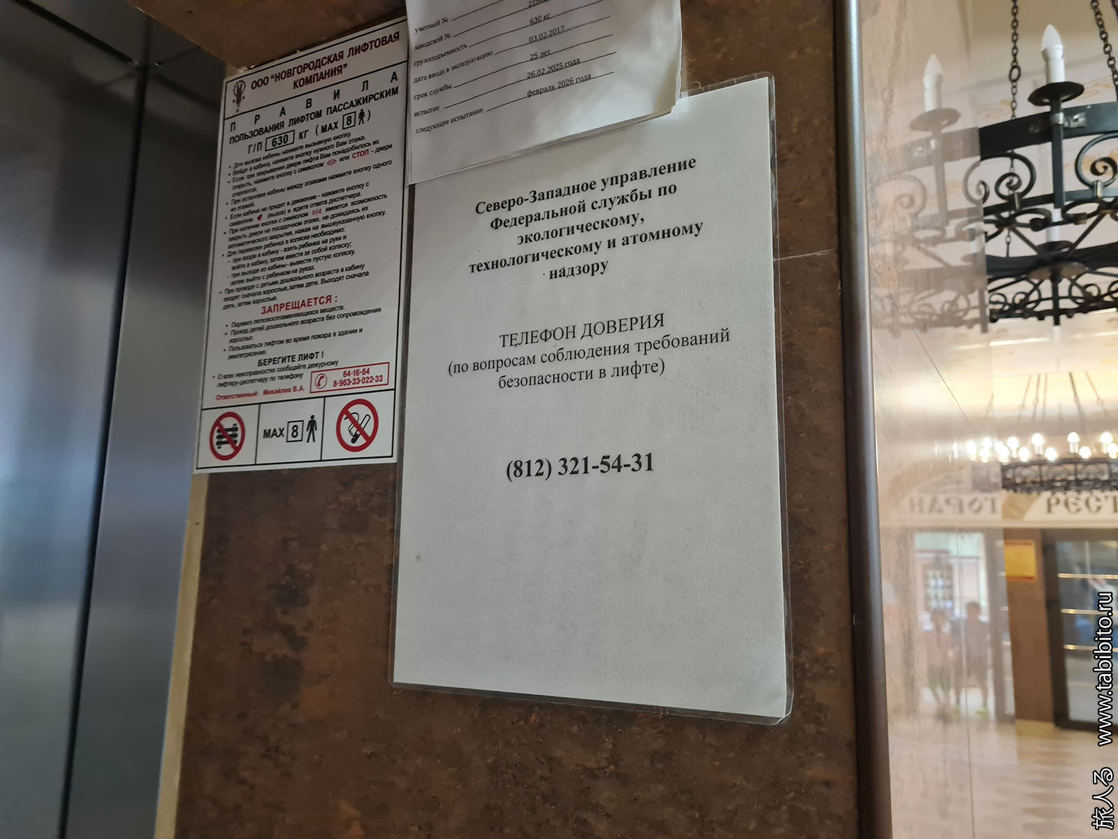В гостинице «Садко» лифт снабжен телефоном доверия о соблюдении безопасности в лифте.