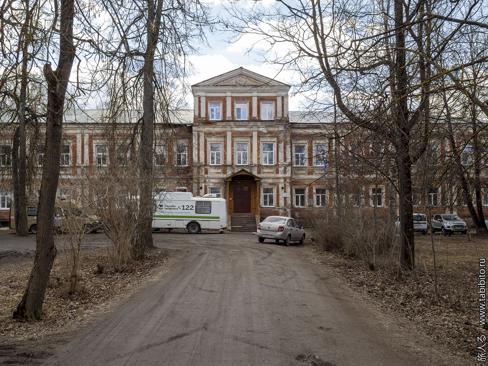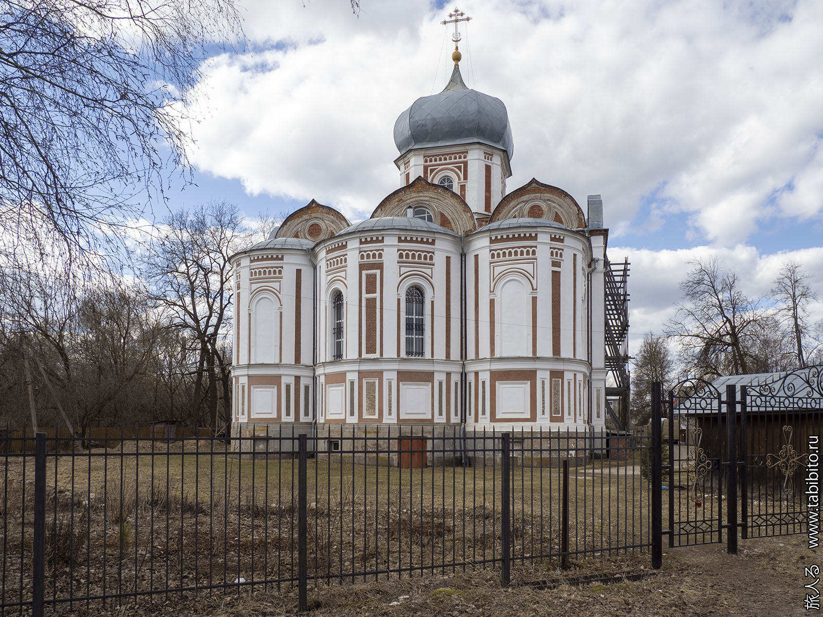Рядом с фабрикой — свежепокрашенная Успенская церковь (1868) с бывшей богадельней.