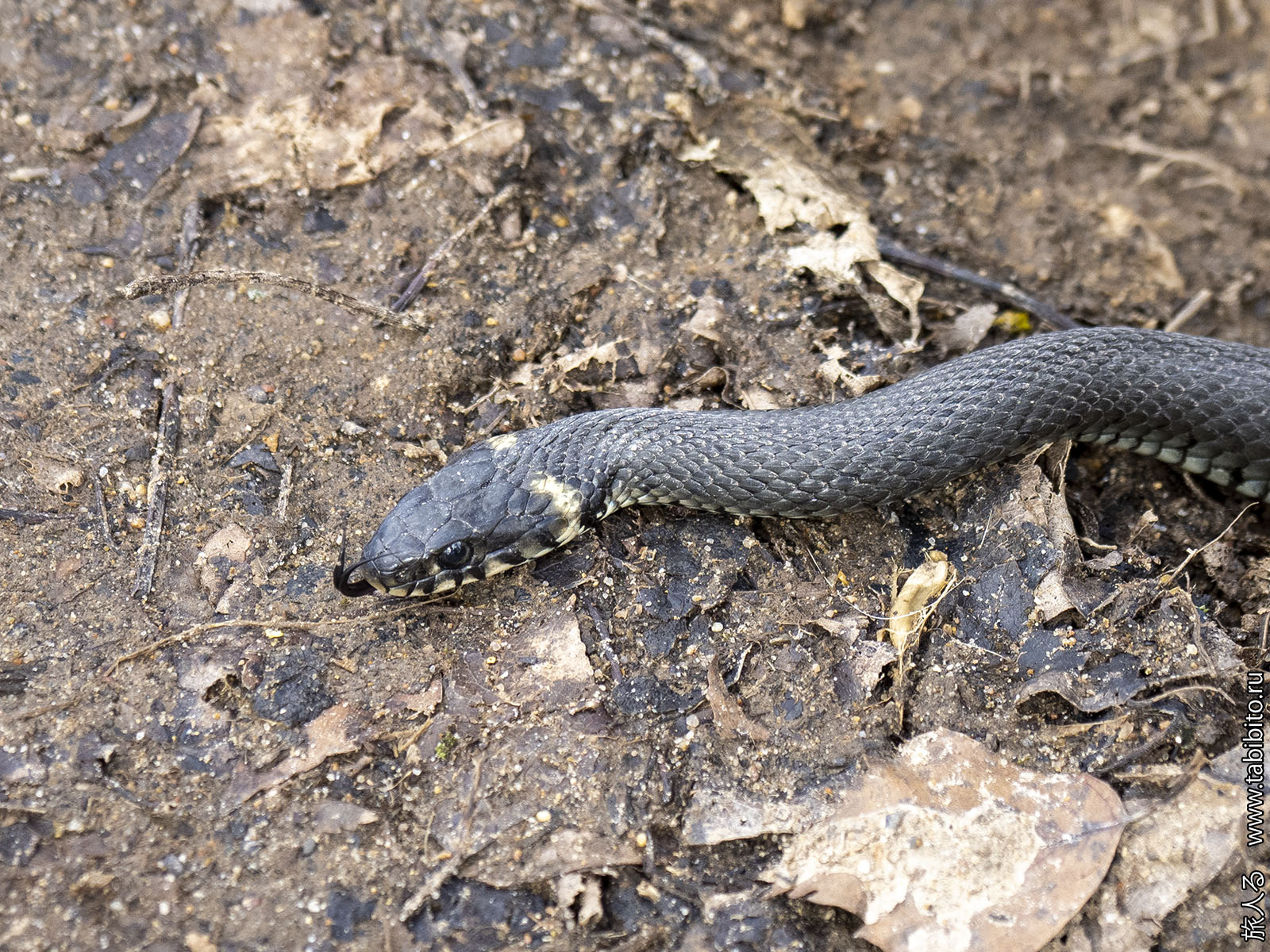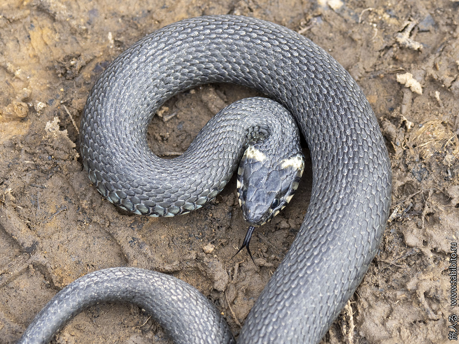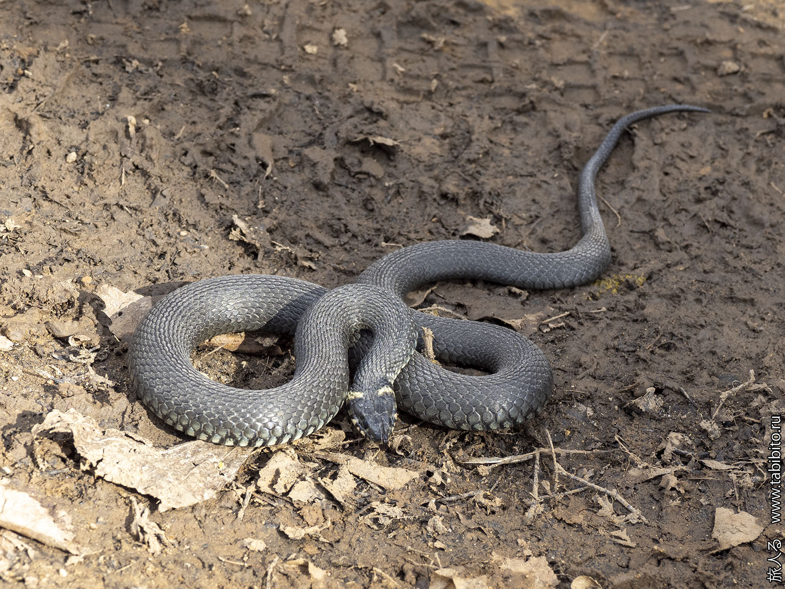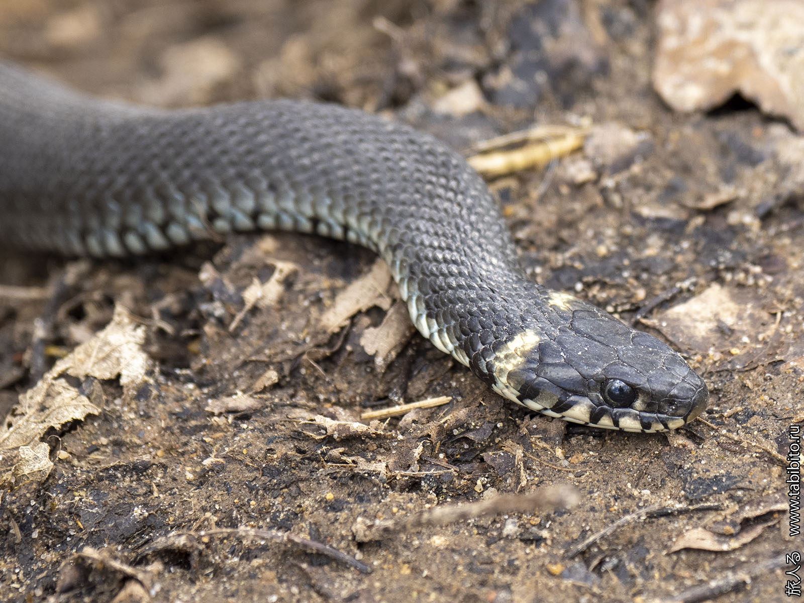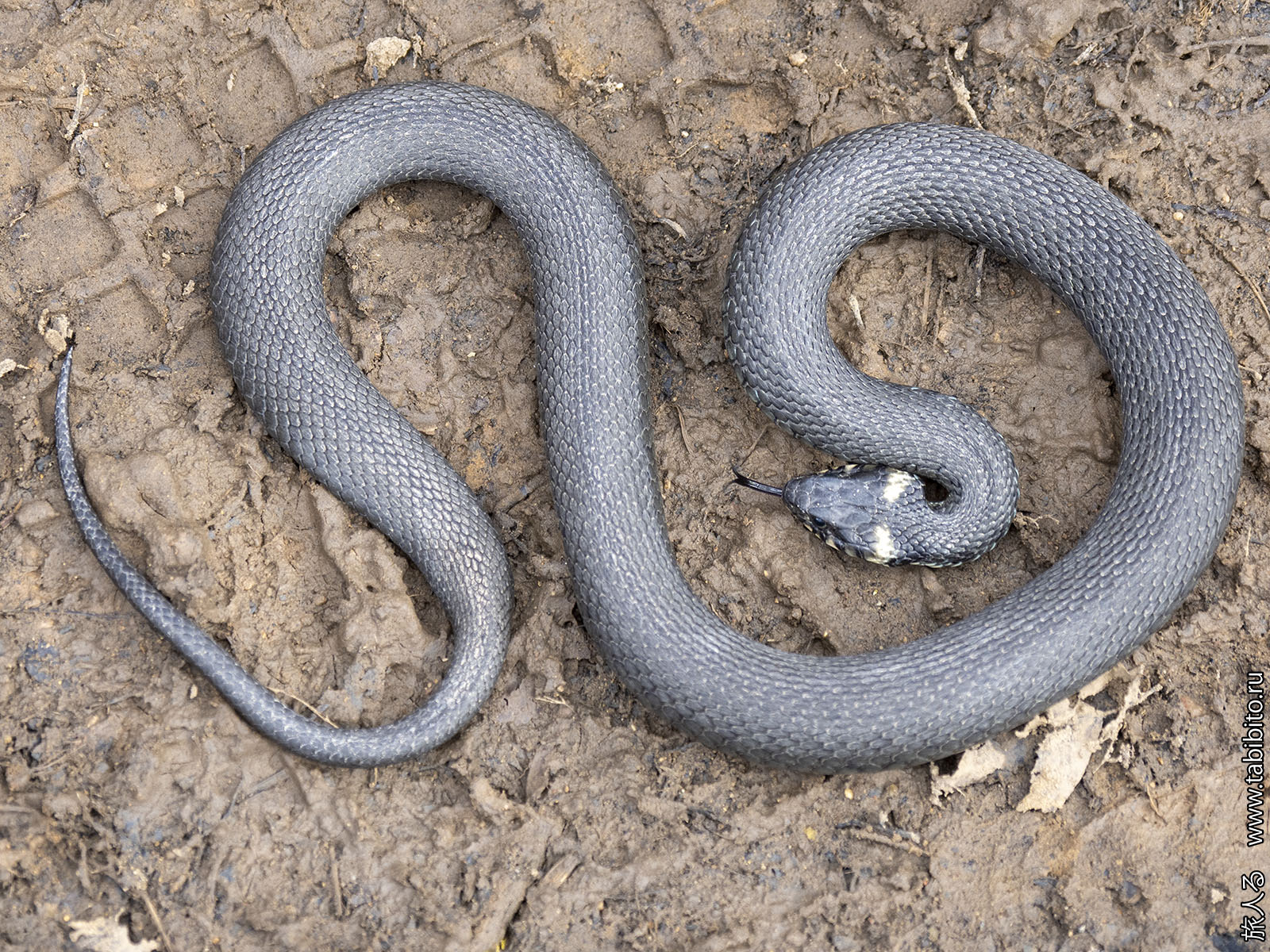 Рядом с его руинами повстречался вот такой красавец-уж. Длиной больше метра, извивался и грозно шипел.