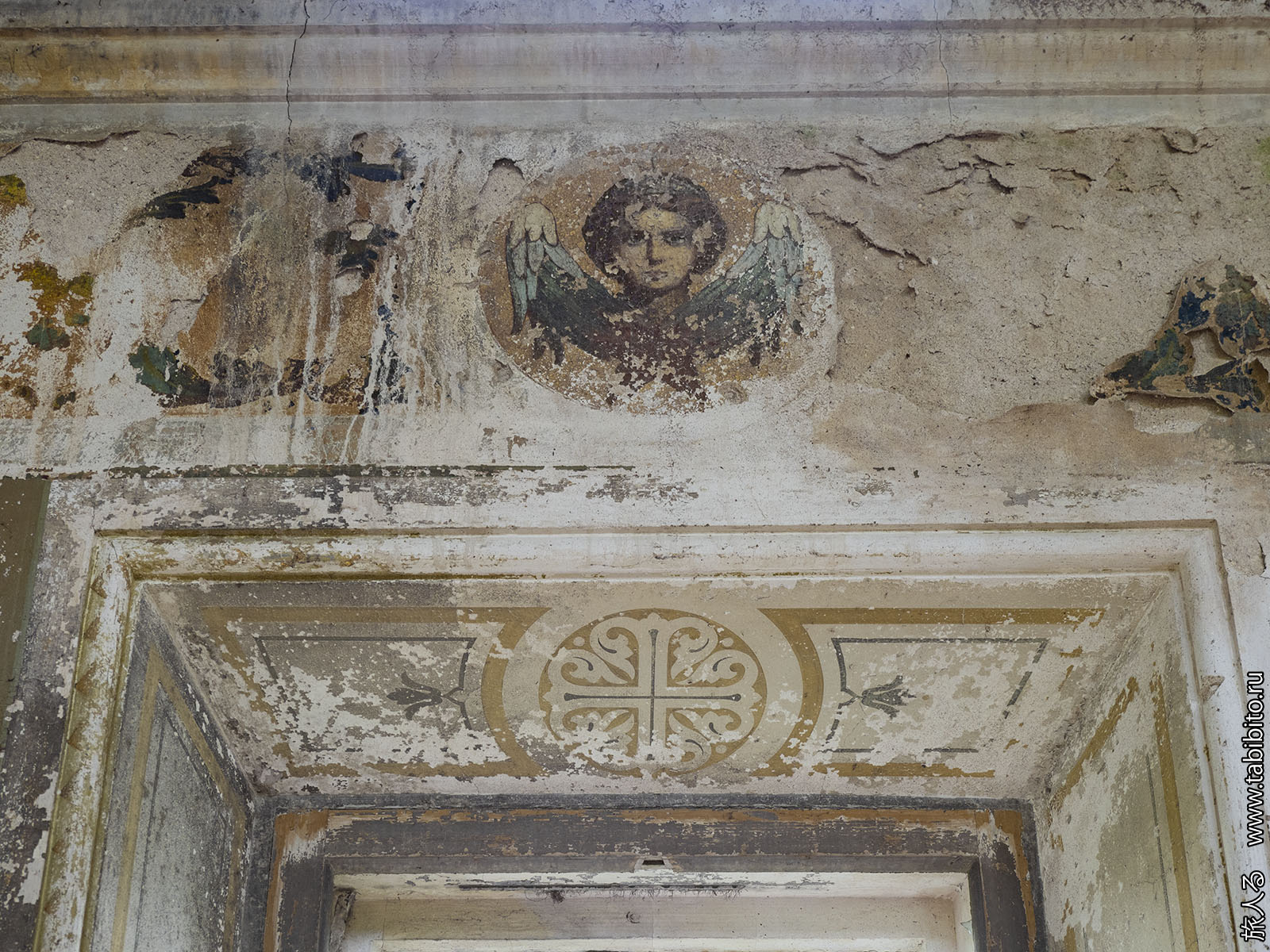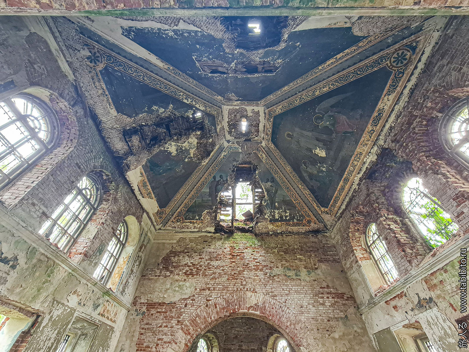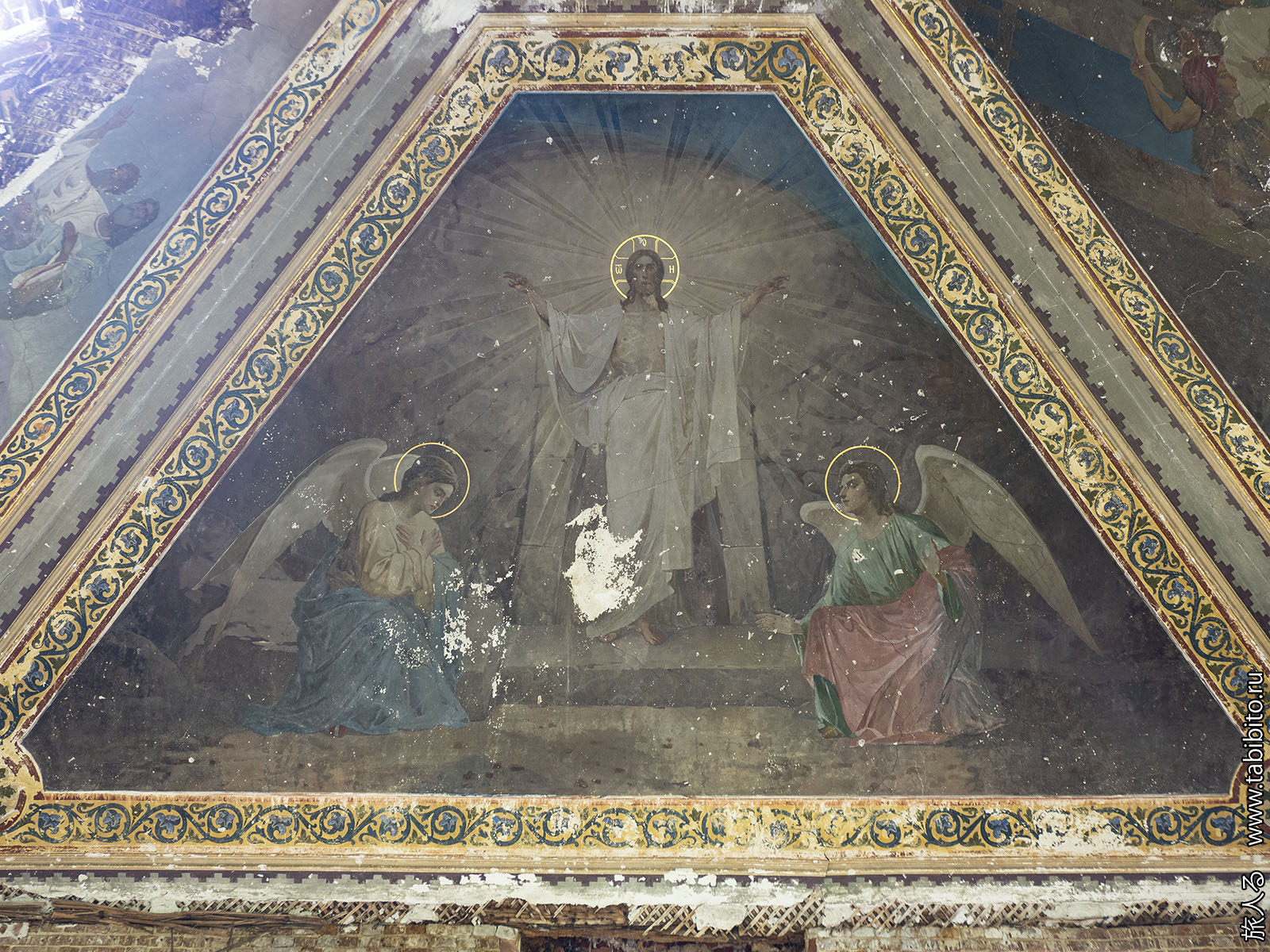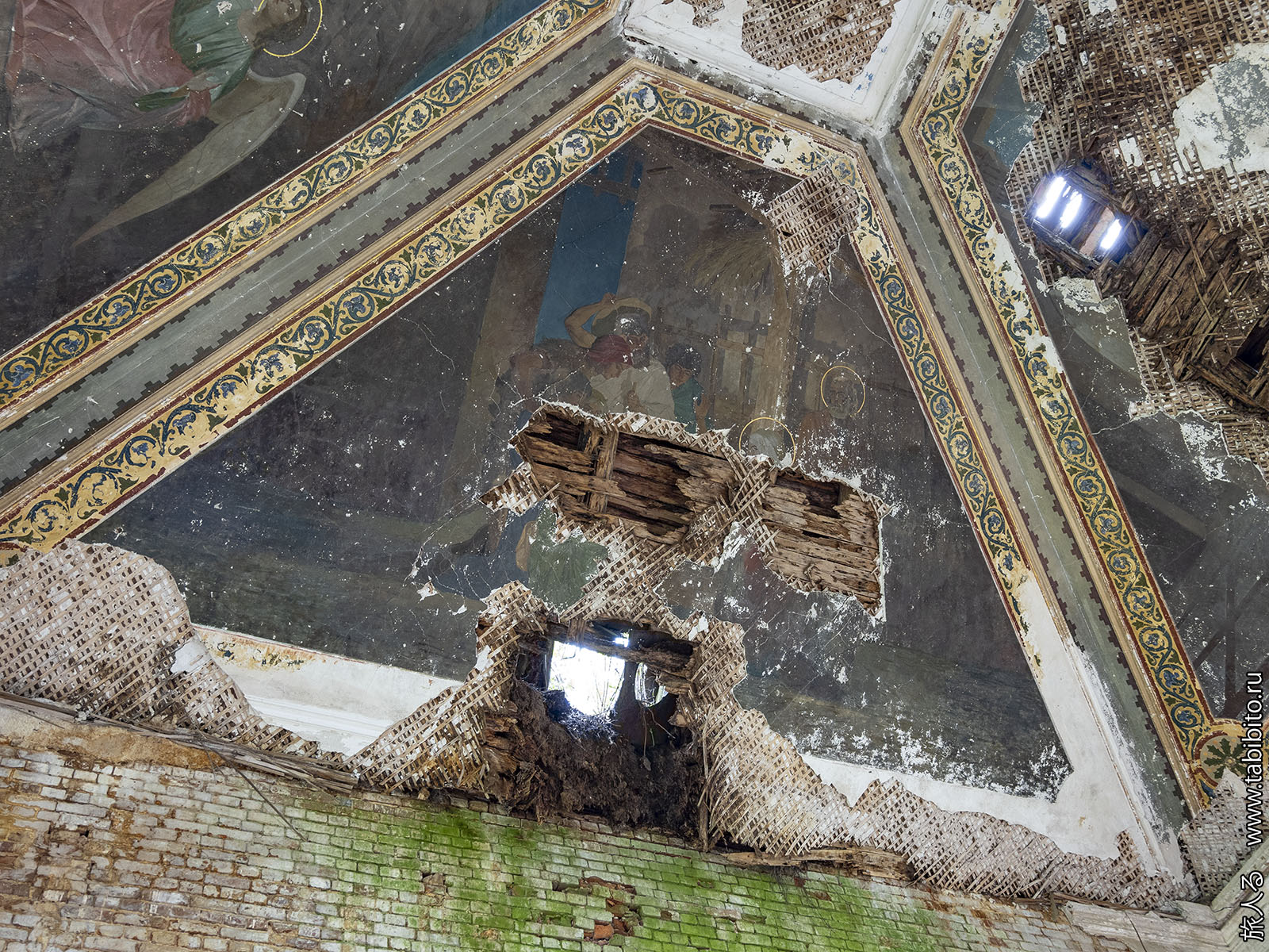 Зато пока еще можно посмотреть на роспись потолка в главном объеме. Спешите видеть, ей недолго осталось. Из четырех изображений сохранилась только сцена Воскресения.