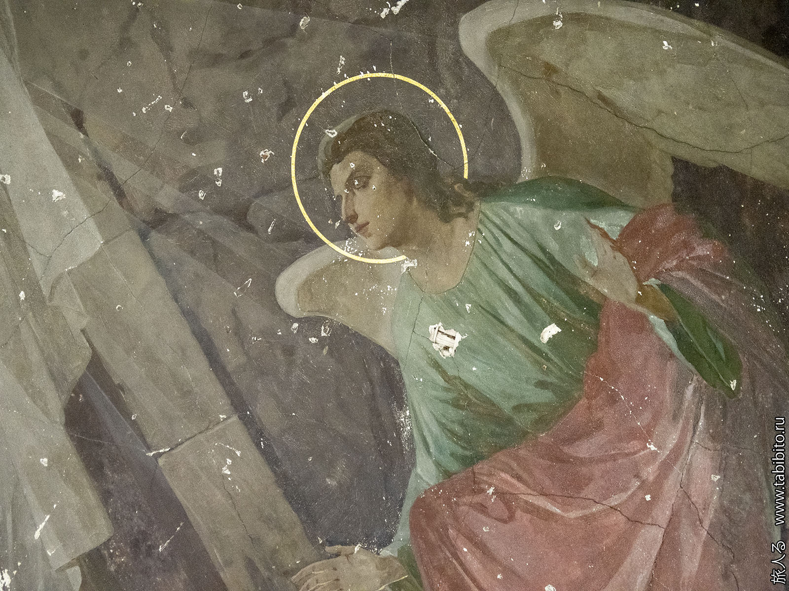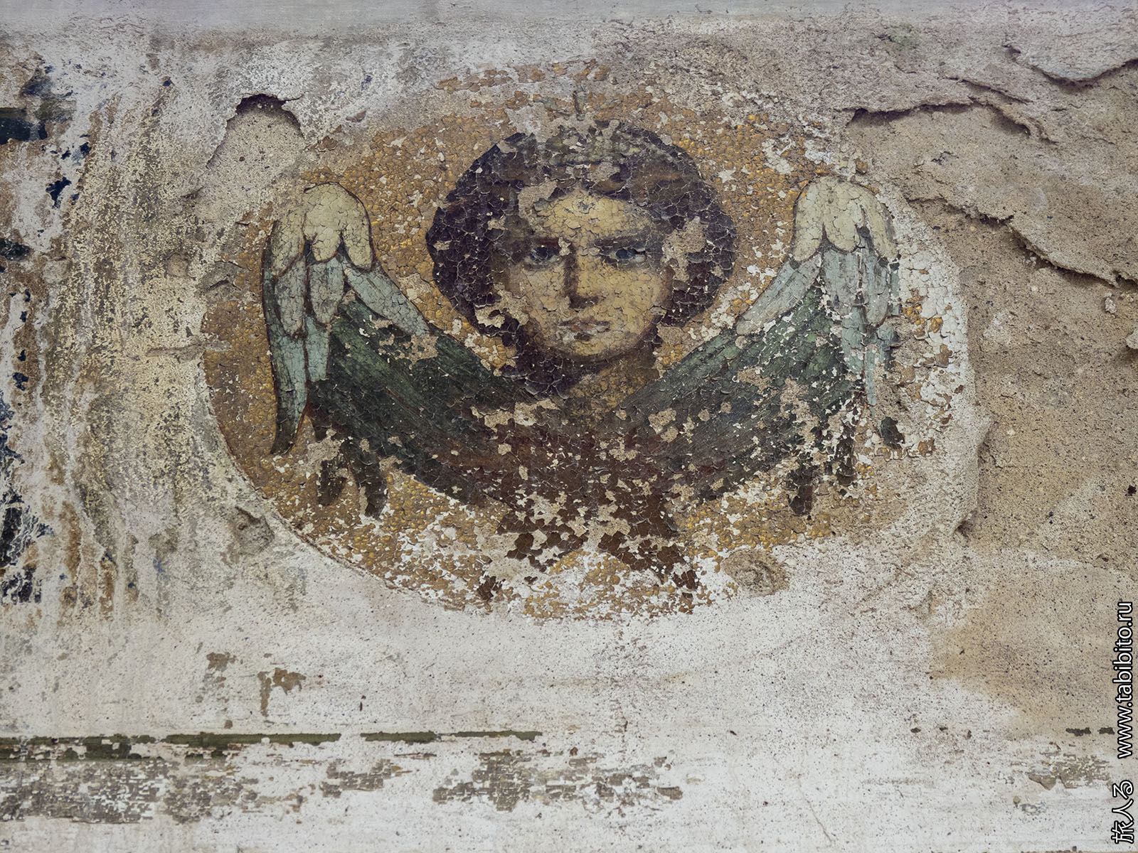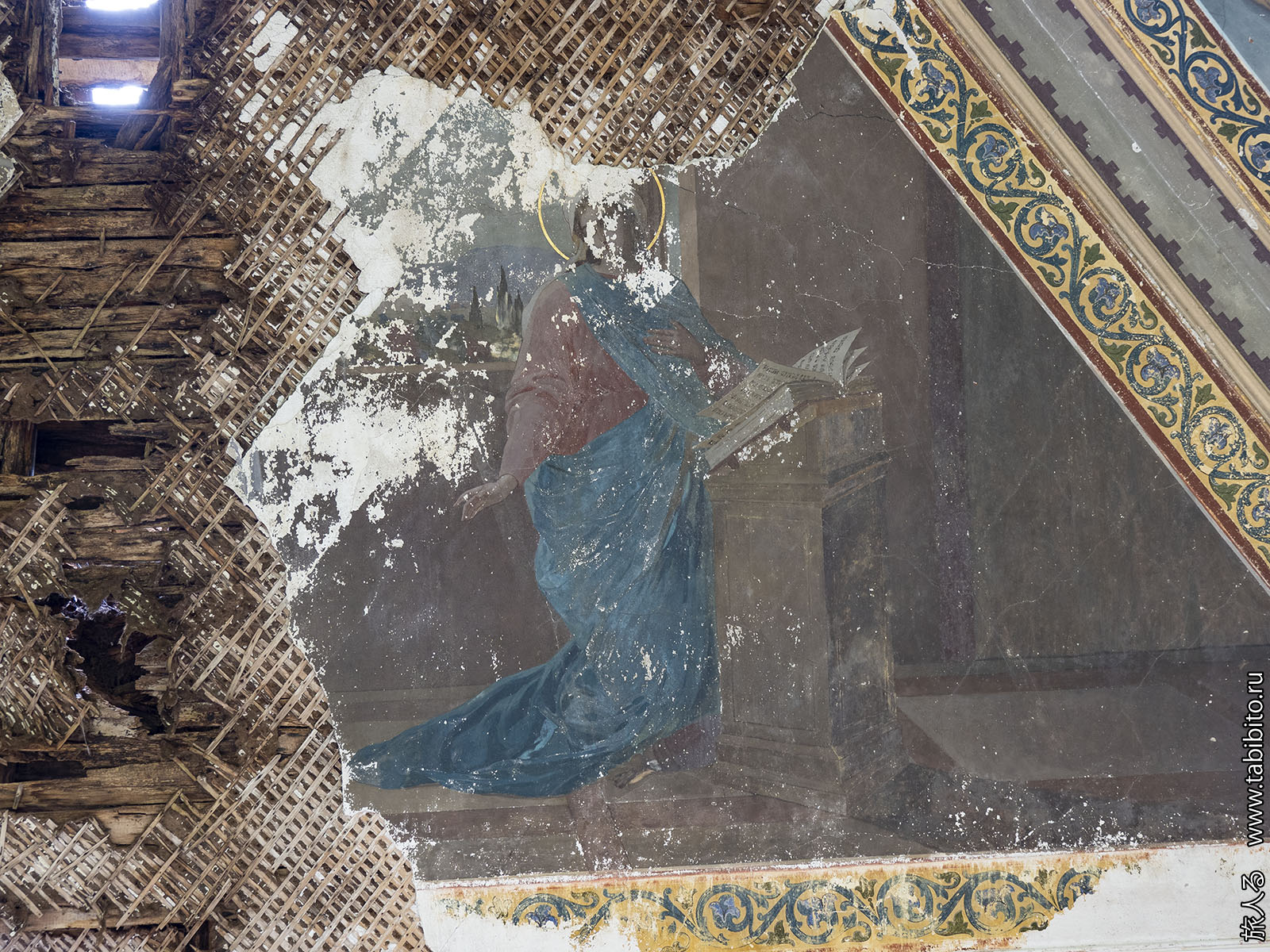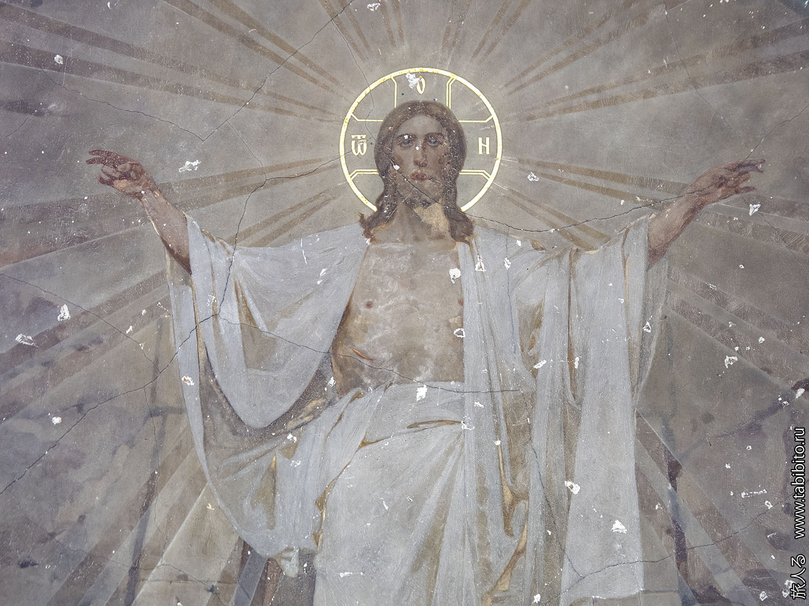 Зато пока еще можно посмотреть на роспись потолка в главном объеме. Спешите видеть, ей недолго осталось. Из четырех изображений сохранилась только сцена Воскресения.
