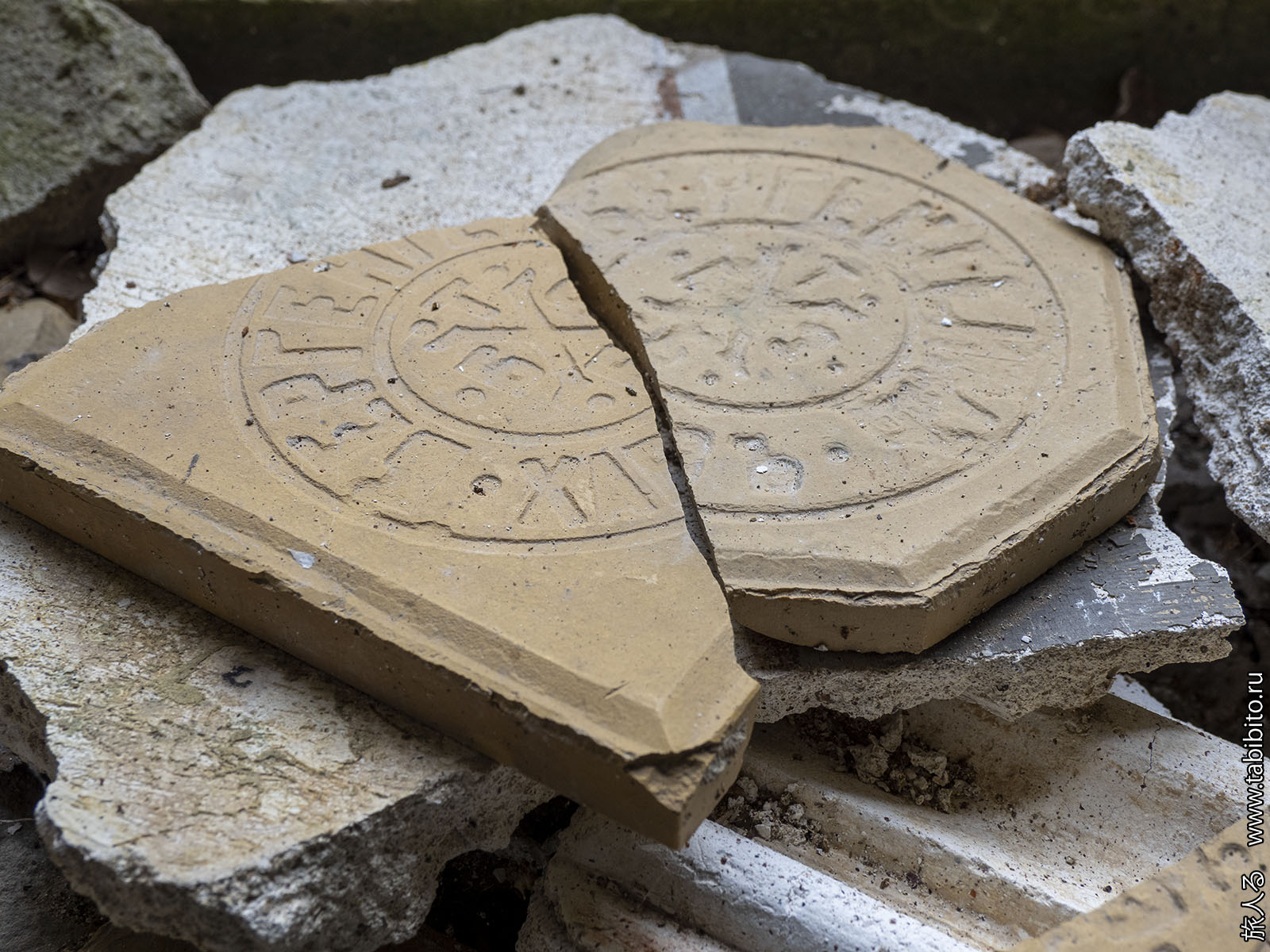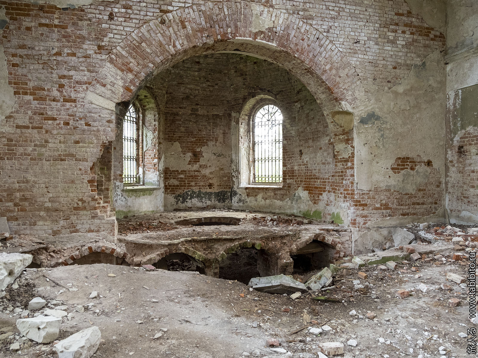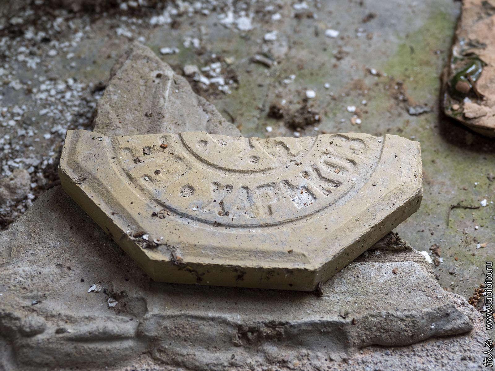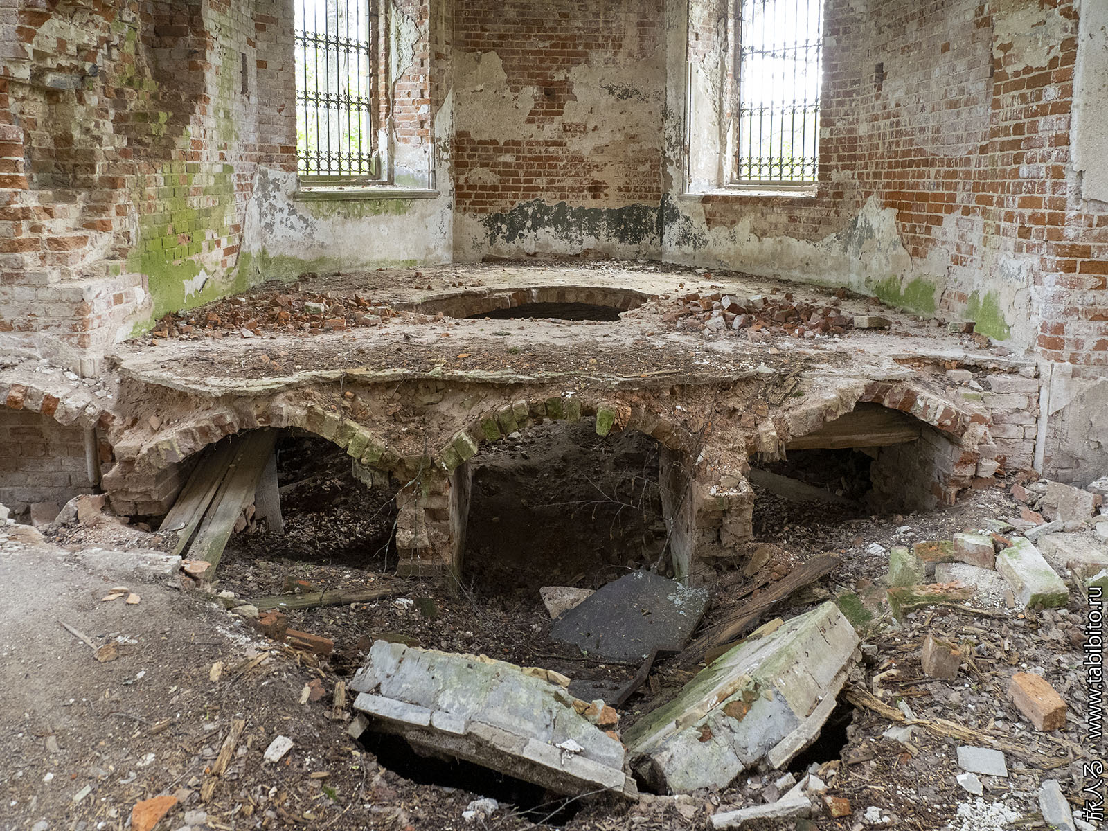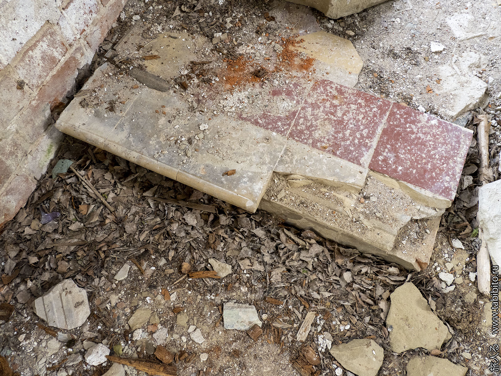 На полу местами лежит плитка со штампом харьковского завода Бергенгейма (как в сельскохозяйственной школе в Соловьиных Зорях в Калужской области).