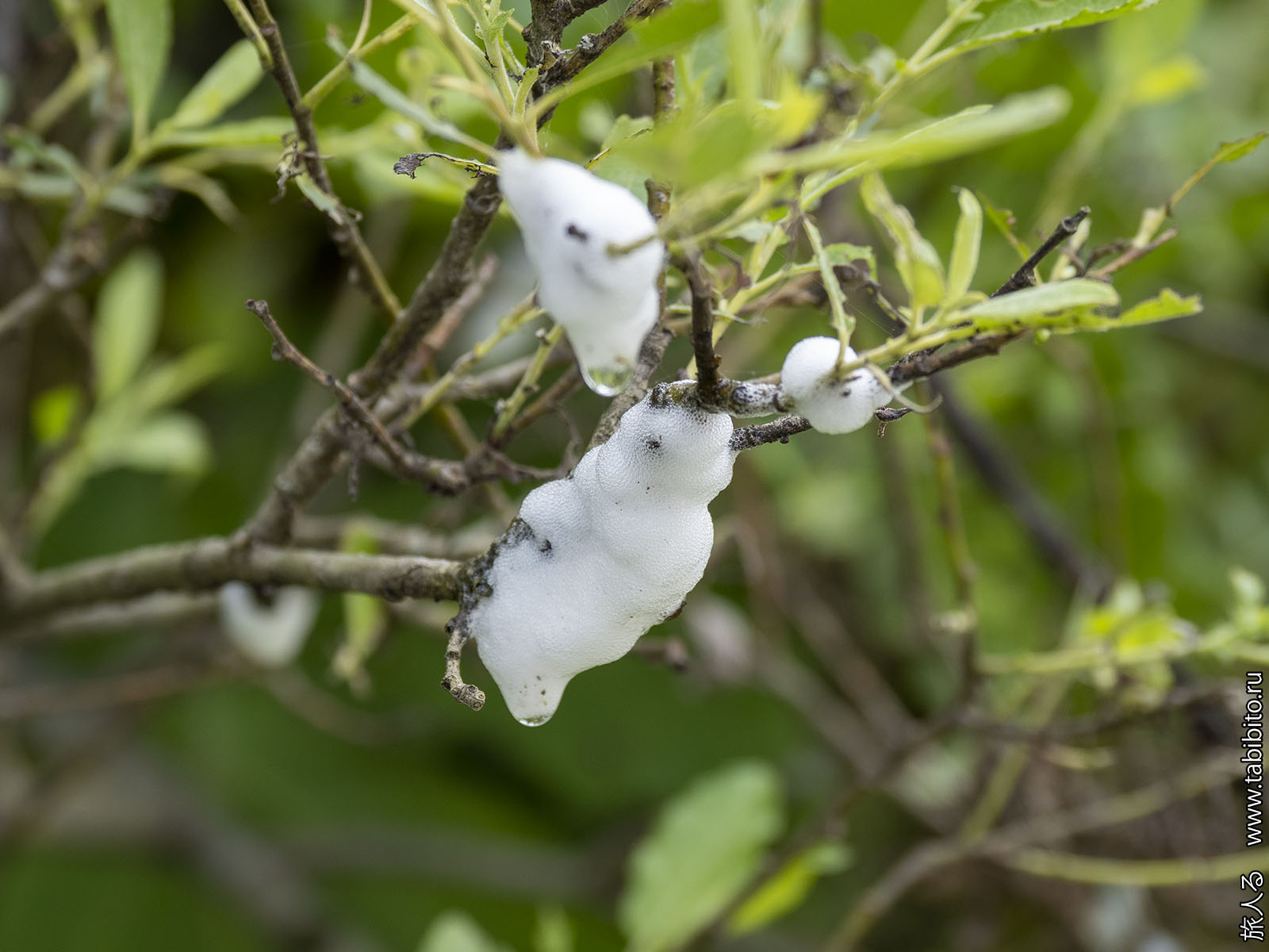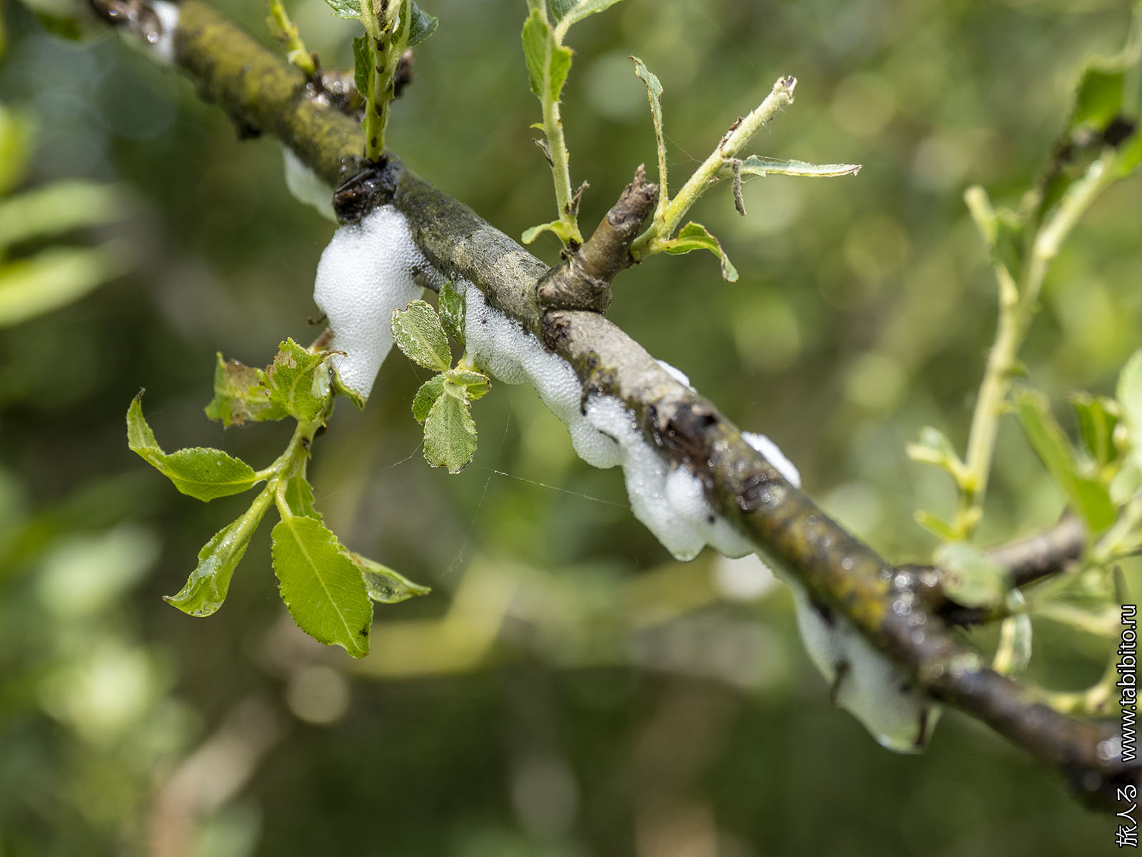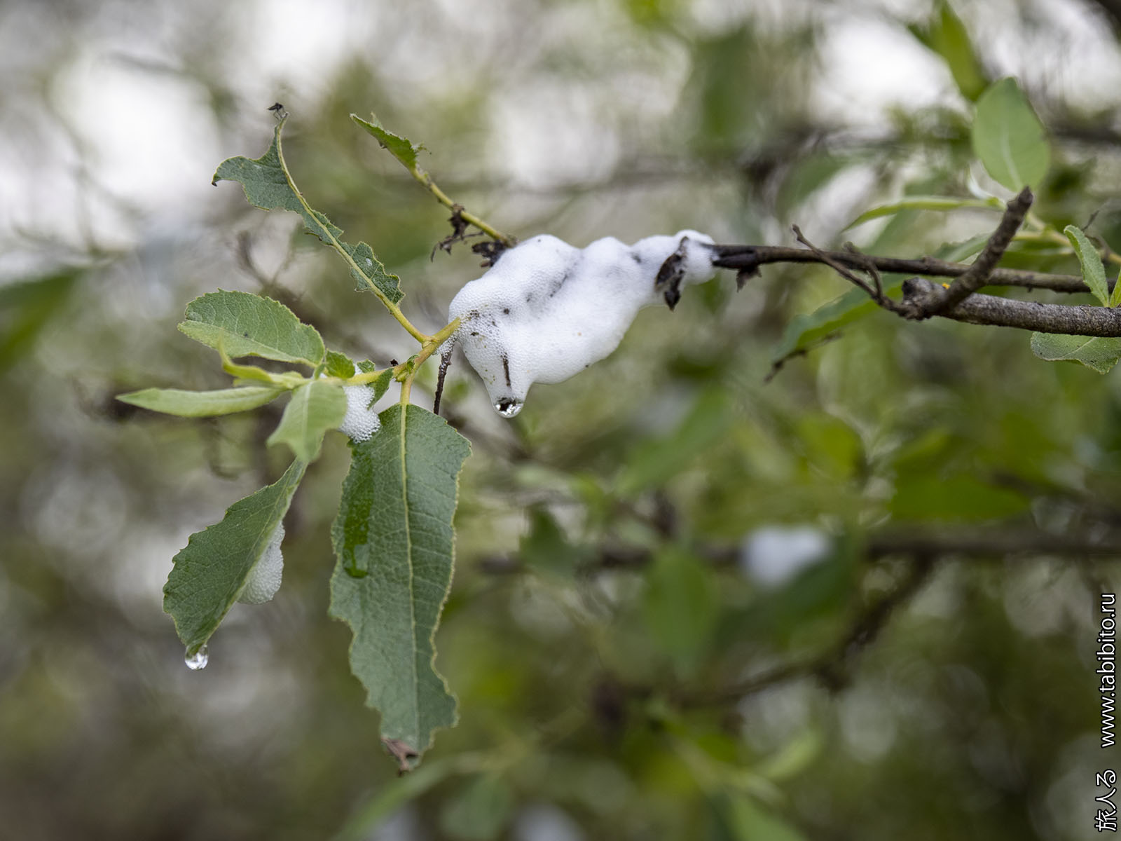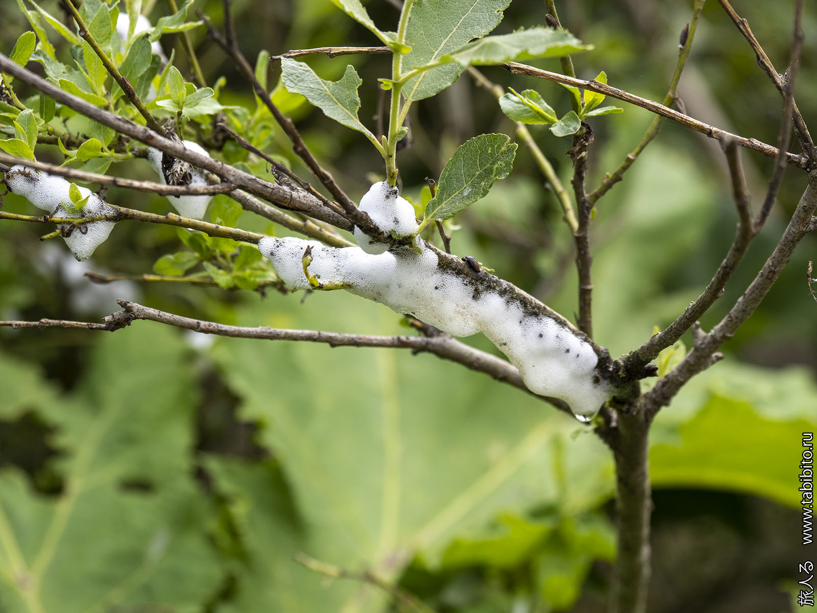 С деревьев зловеще и громко роняет капли на листья борщевика белая мерзость — гнезда цикад-пенниц.
